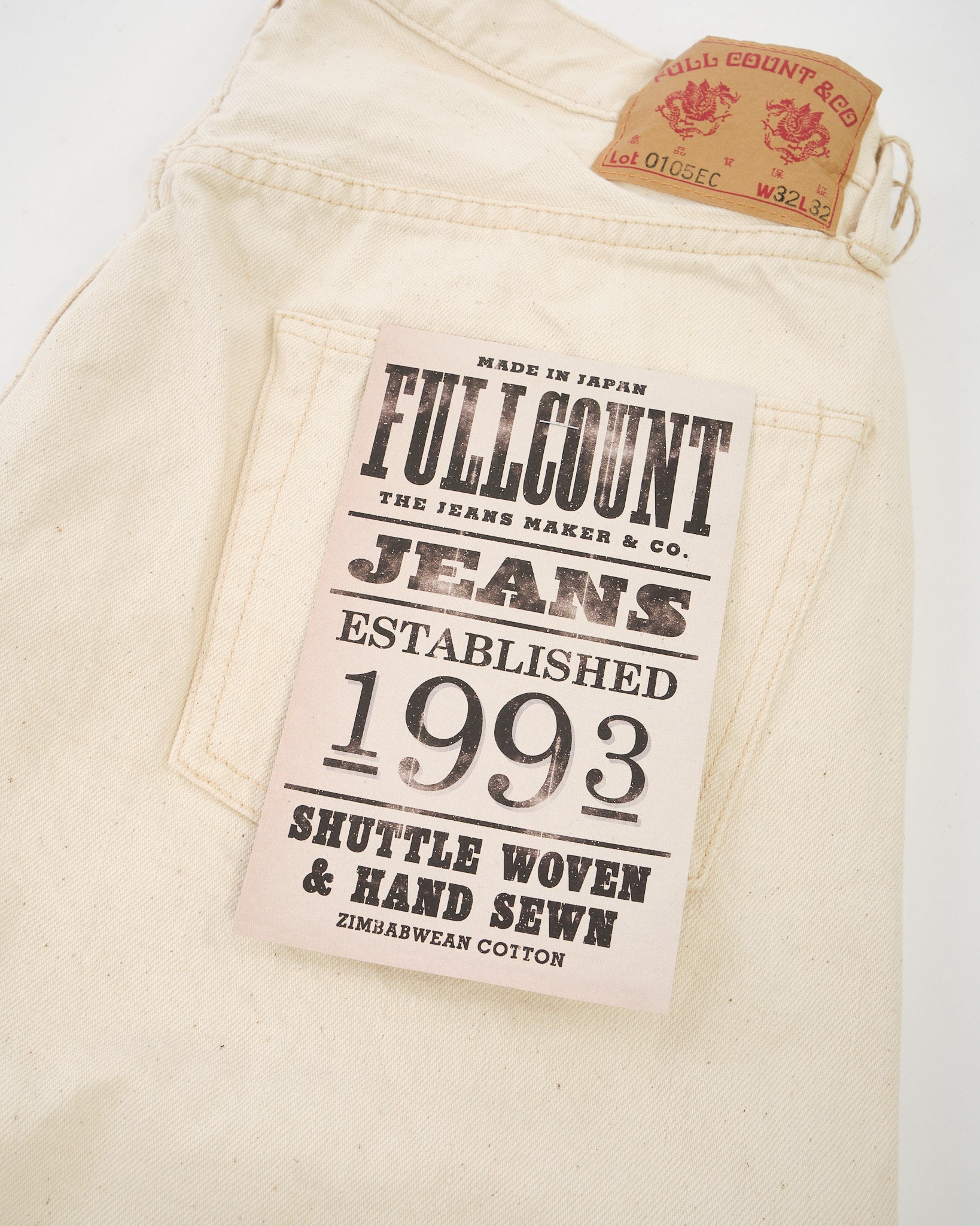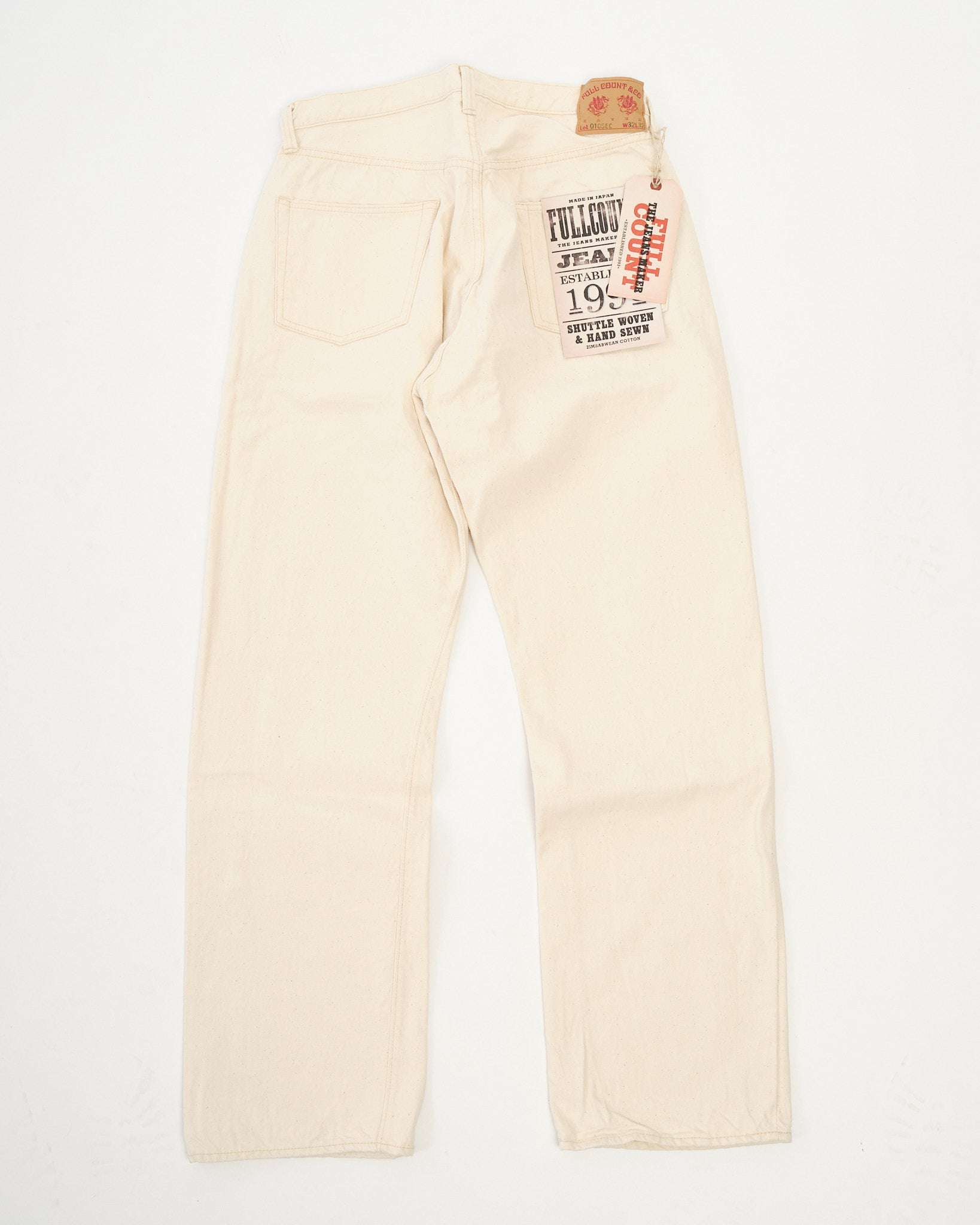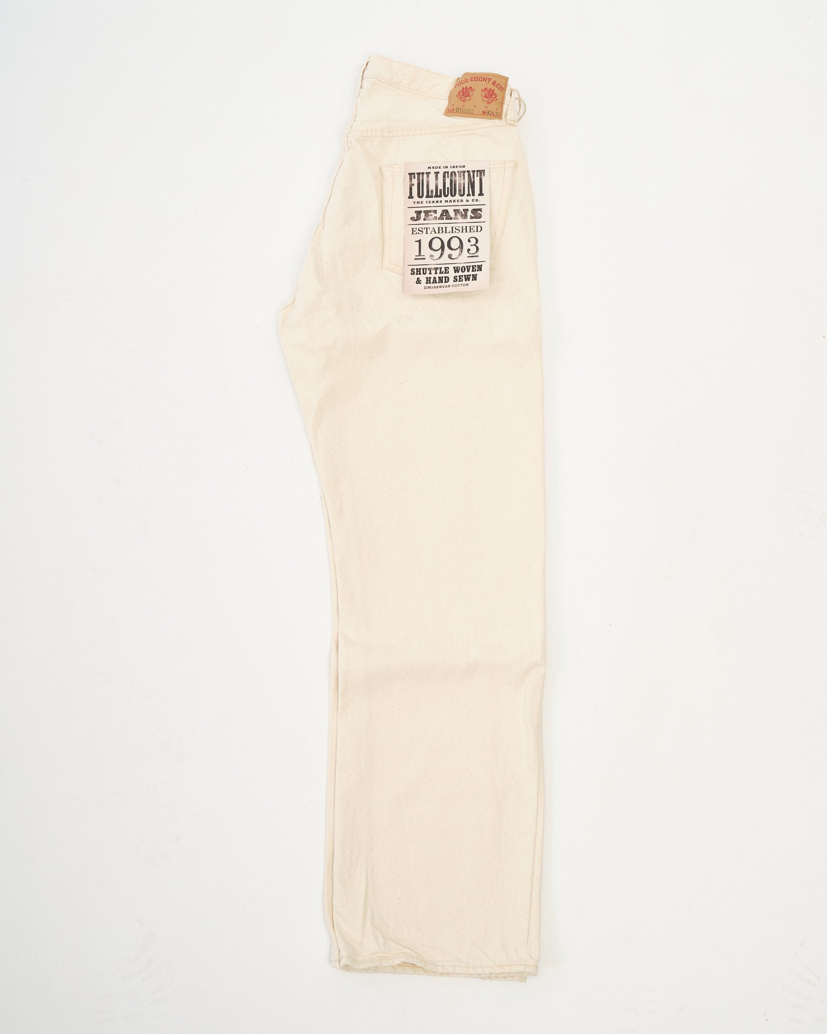 The Full Count 0105EC Wide Ecru Selvedge Denim celebrates Zimbabwean cotton in its purest form. Left completely undyed and unbleached, this 13.7oz selvedge fabric preserves the cotton’s natural tone and character, including subtle flecks of leaf and stem that add organic depth. With wear and washing, these fragments gradually fall away, revealing an even softer, beautifully textured surface.