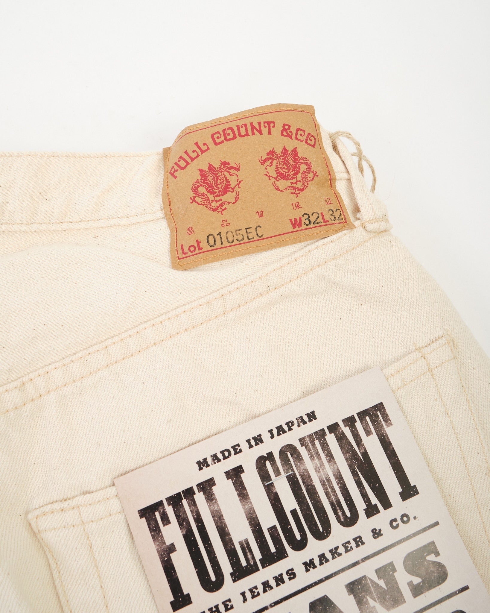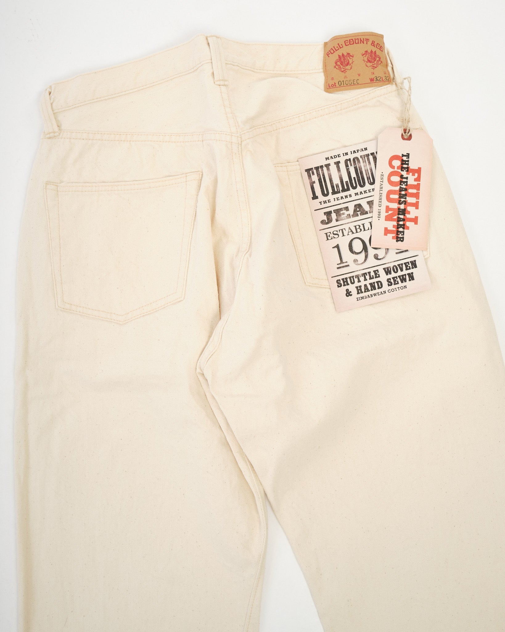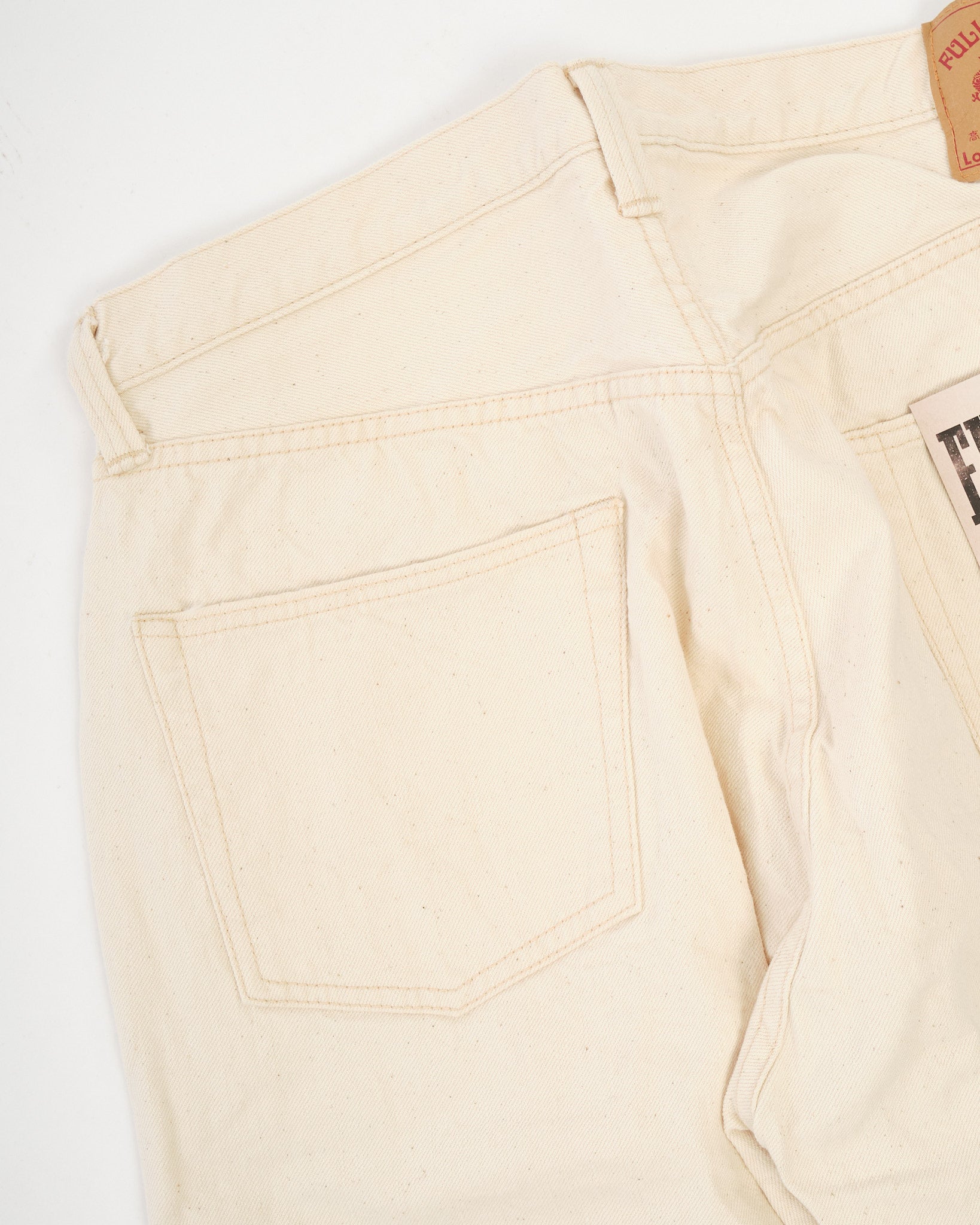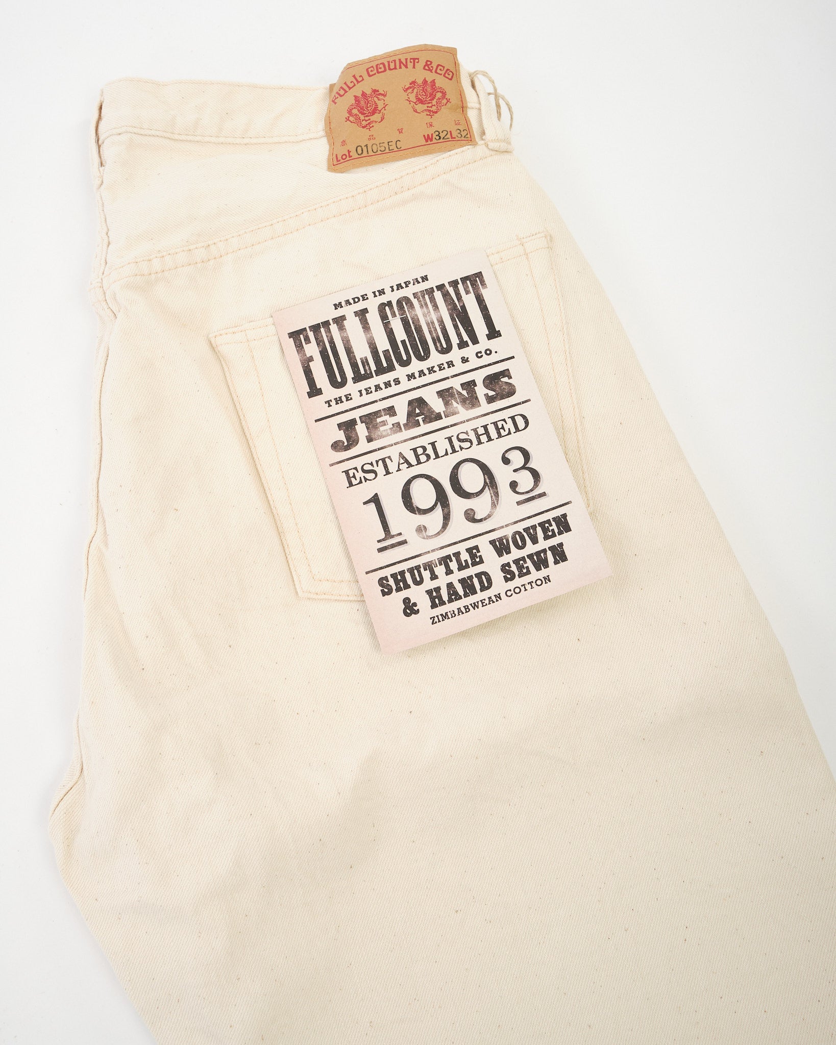 The Full Count 0105EC Wide Ecru Selvedge Denim celebrates Zimbabwean cotton in its purest form. Left completely undyed and unbleached, this 13.7oz selvedge fabric preserves the cotton’s natural tone and character, including subtle flecks of leaf and stem that add organic depth. With wear and washing, these fragments gradually fall away, revealing an even softer, beautifully textured surface.