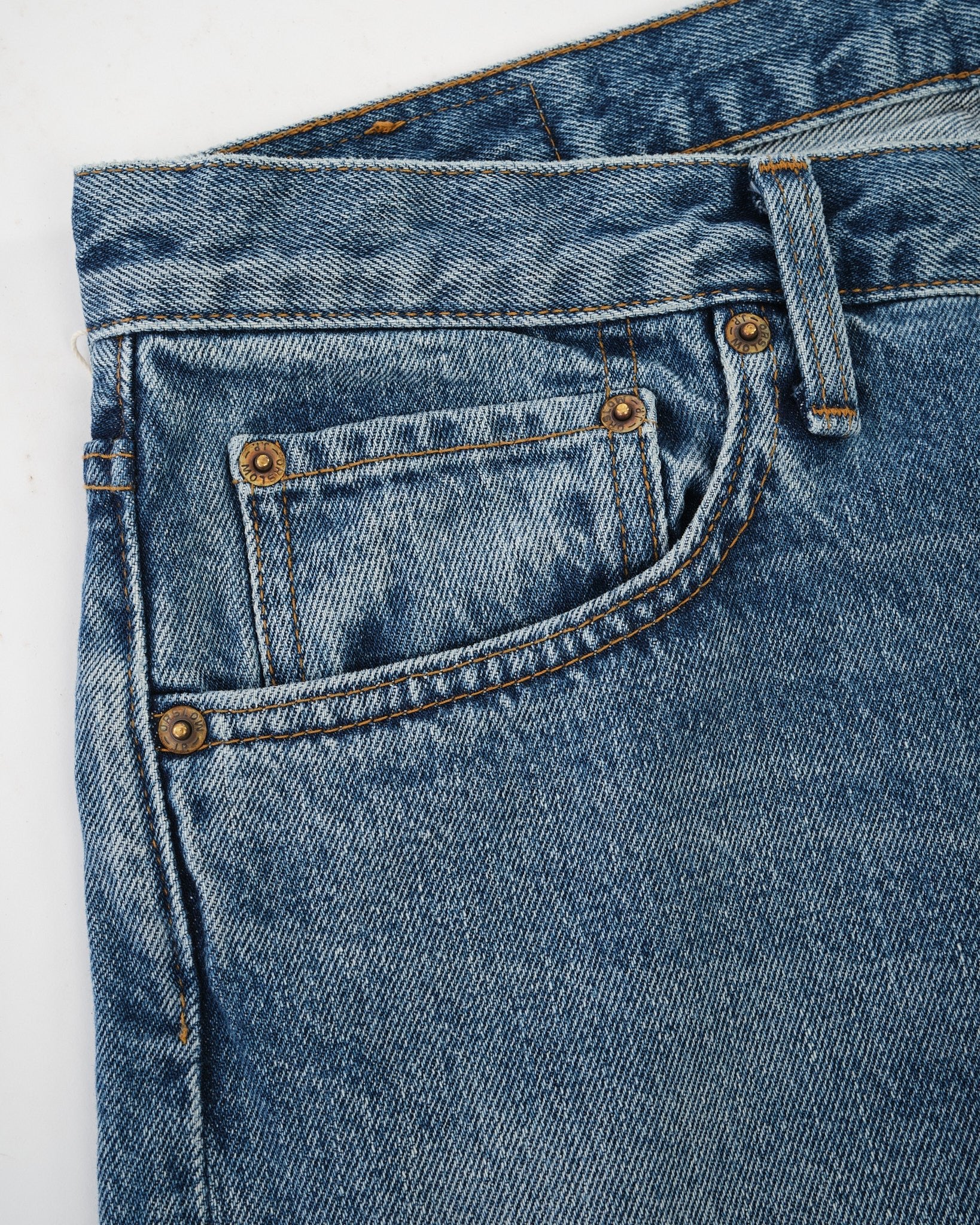 • Yksityiskohdat: Napillinen sepalus, viiden taskun asetelma, kullanväriset tikkaukset, hapettuneet kupariniitit ja paperinen vyötärömerkki