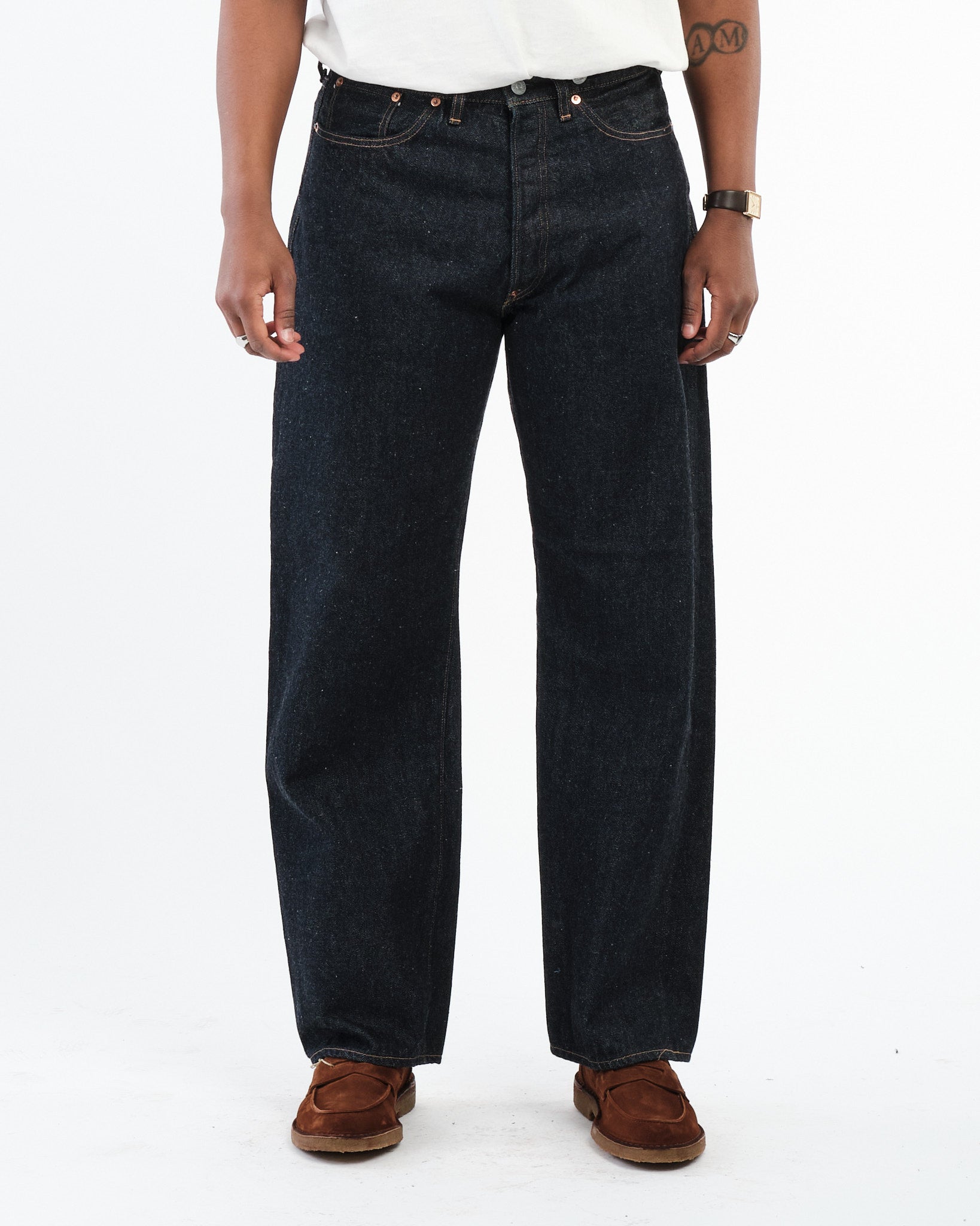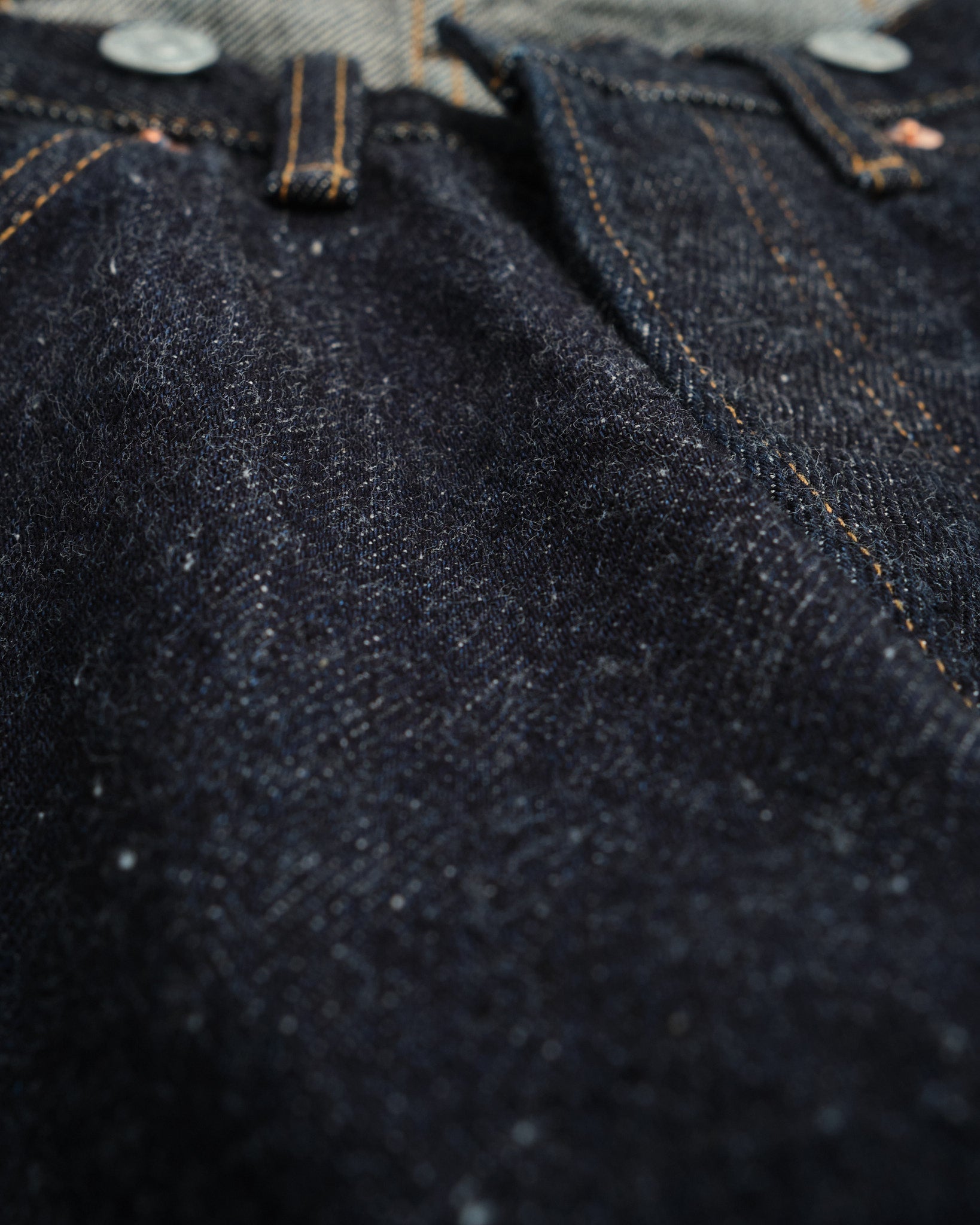 Denim on kudottu matalalla jännitteellä vanhalla kudontakoneella, hitaassa ja harkitussa prosessissa, joka antaa kankaalle ainutlaatuisen, epätasaisen tekstuurin, joka vangitsee 1940-luvun denimhuipun olemuksen. Käyttäessäsi ja pestessäsi näitä housuja, väri ja luonne syvenevät, tuloksena on todella henkilökohtainen ilme, joka kehittyy ajan myötä.