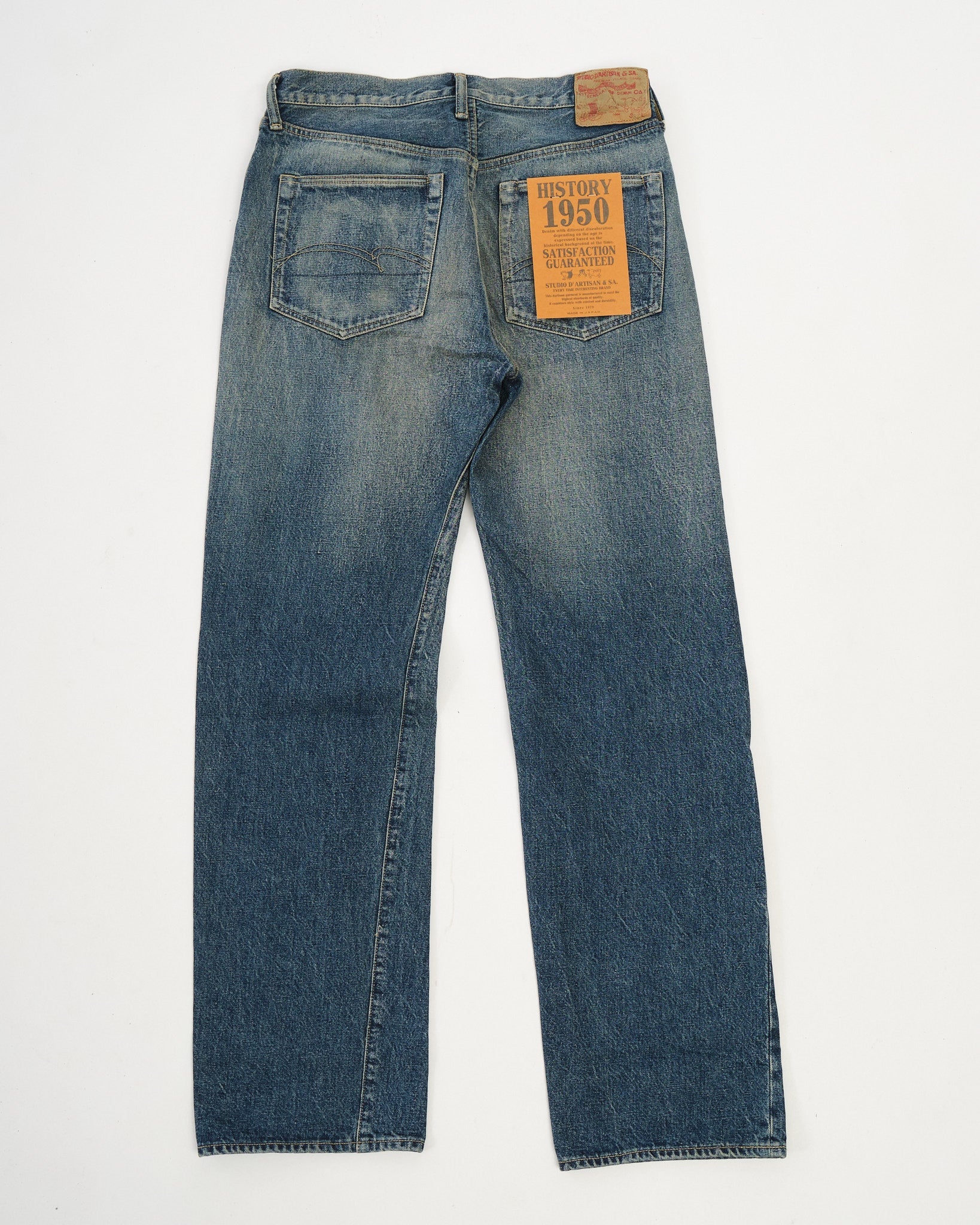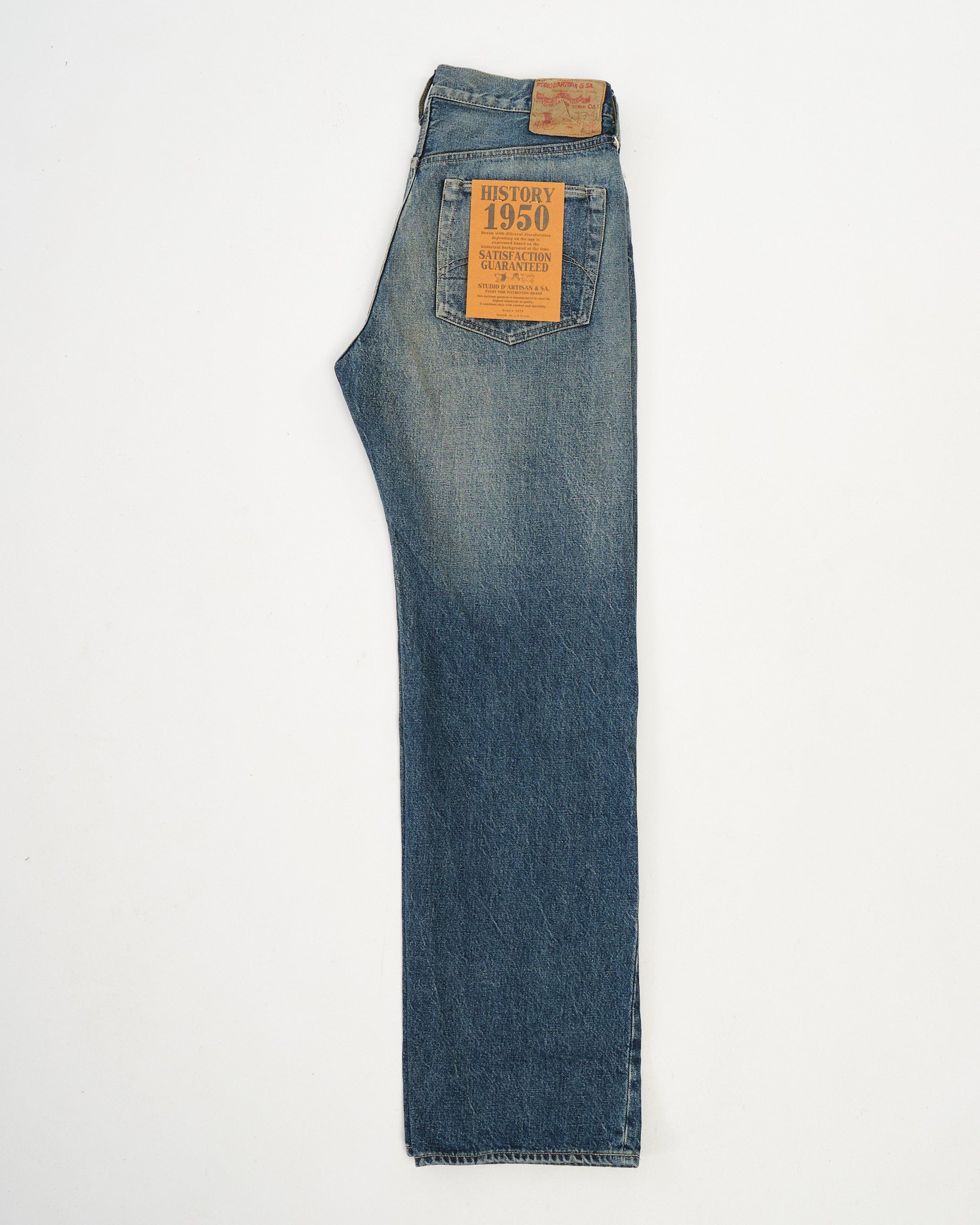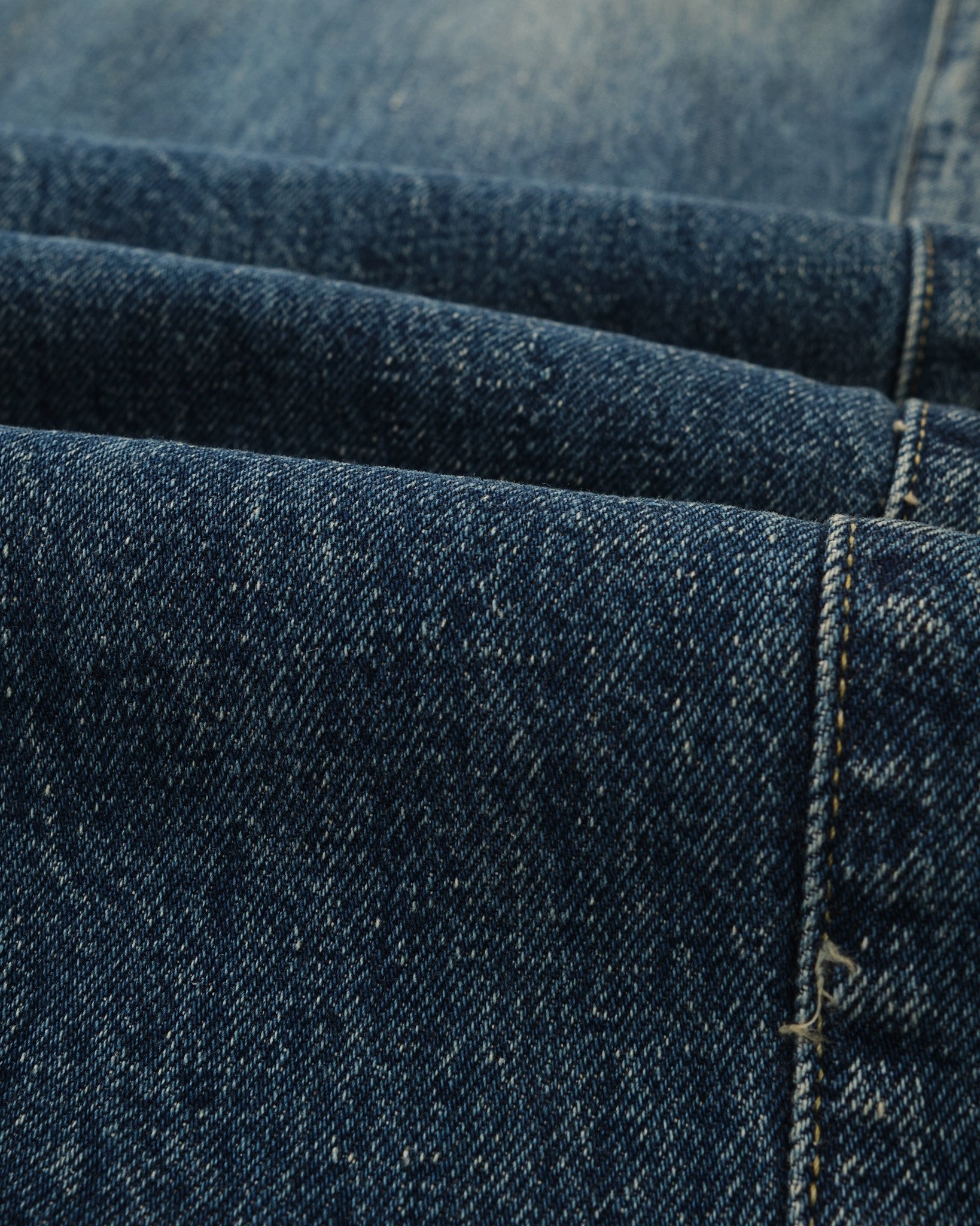 Suunniteltu tiukalla suoralla 103 siluetilla, nämä farkut tarjoavat puhtaan mutta rakenteellisen istuvuuden, pysyen uskollisena 1950-luvun työvaateestetiikalle. Käytetty indigo-pesu tehostaa vintage-tunnelmaa, esitellen hienovaraisia haalistumia ja ryppyjä, jotka korostavat kankaan ainutlaatuista luonnetta.