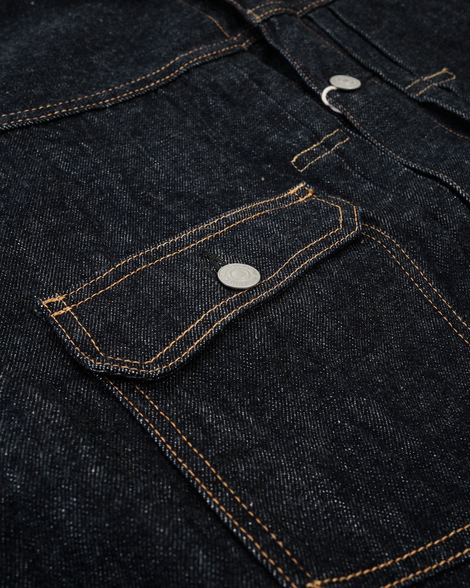 Leikattu 13,5 unssista Japanissa kudottua denimiä, kangas yhdistää 65% Memphis-puuvillaa kiinteyden saavuttamiseksi 35% Zimbabwelaisen puuvillan kanssa pehmeyden ja lujuuden vuoksi. Köysivärjätty 100% puhtaalla indigolla, langat paljastavat ikääntyessään kirkkaan valkoisen ytimen, luoden ajan myötä kauniita haalistumia. Kankaan kudonta tapahtuu muokatulla 1950-luvun Sakamoto-suksiloomilla matalalla jännitteellä, antaen kankaalle karhean tekstuuriin, joka kehittyy ainutlaatuisesti käytössä. Viimeistelty yhdellä pesukäsittelyllä, se on valmis kulutettavaksi säilyttäen samalla luonnollisen puuvillacarakterinsa.