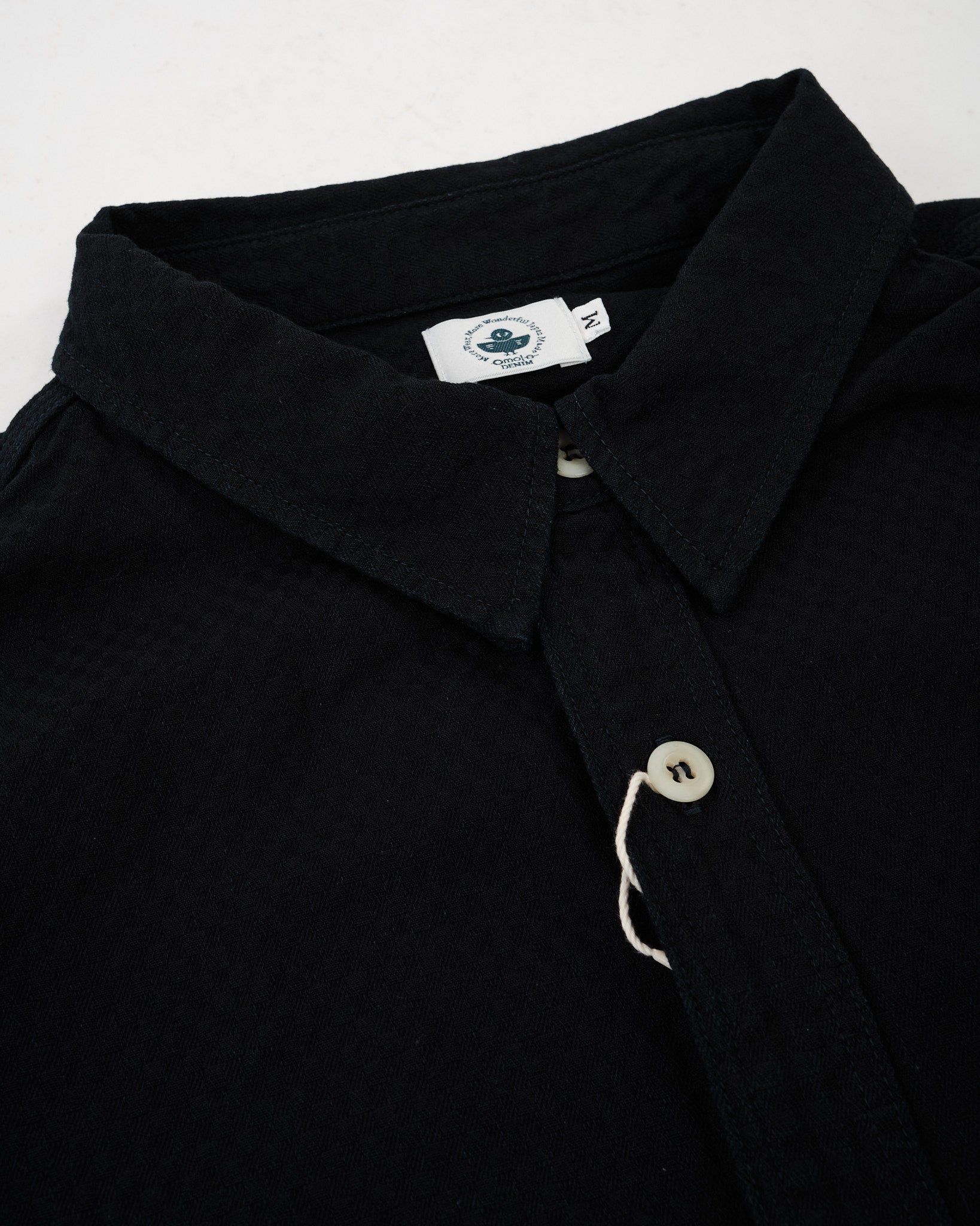 Avainyksityiskohtiin kuuluu OMOTOn sinivihreä “MIMI” -reunus, alkuperäiset metallinapit ja vahvistetut ompeleet pitkäaikaiseen käyttöön. Klassinen työpaitasiluetti tekee tästä ajattoman perusvaatteen, joka yhdistää perinteisen käsityötaidon moderniin tyyliin.