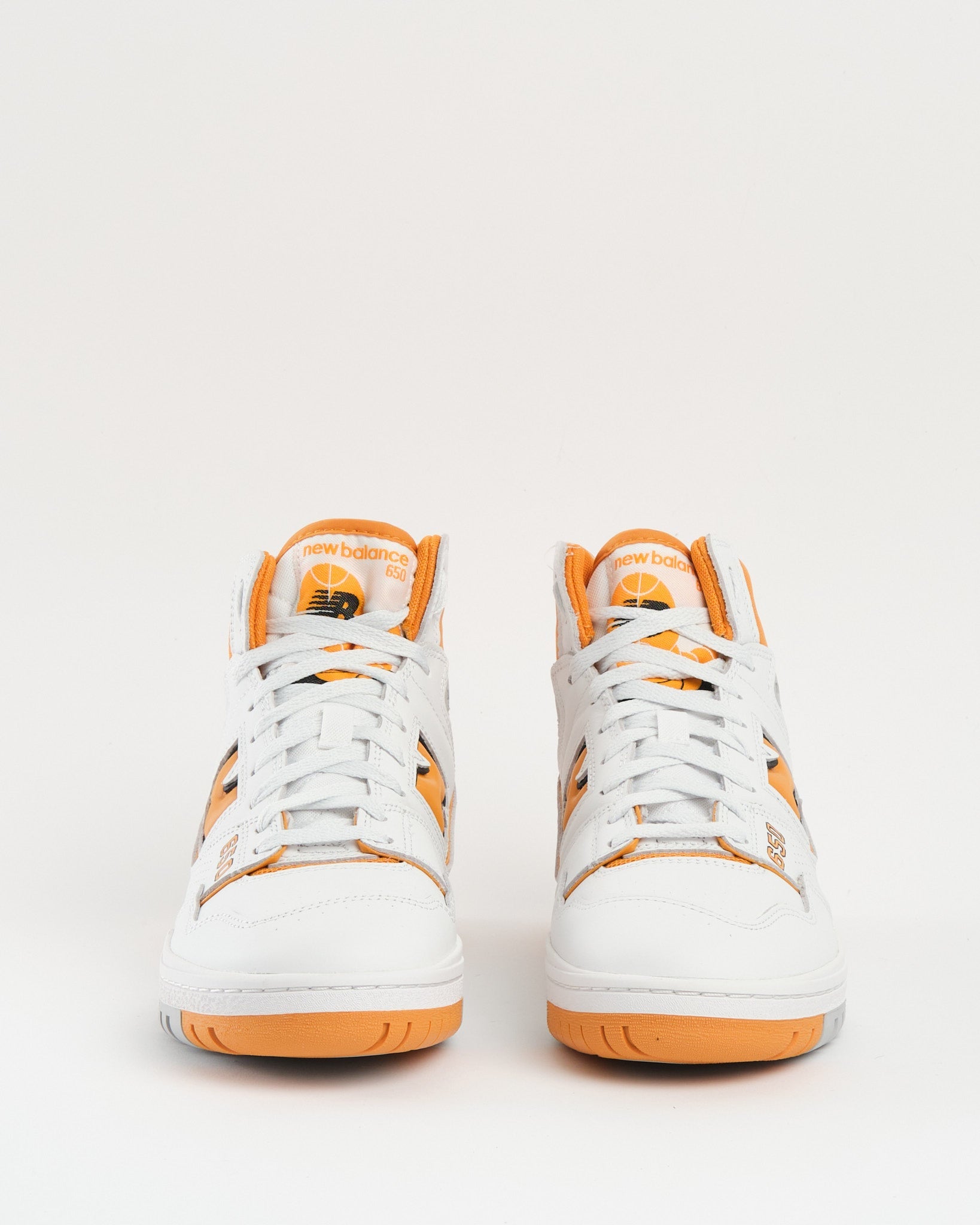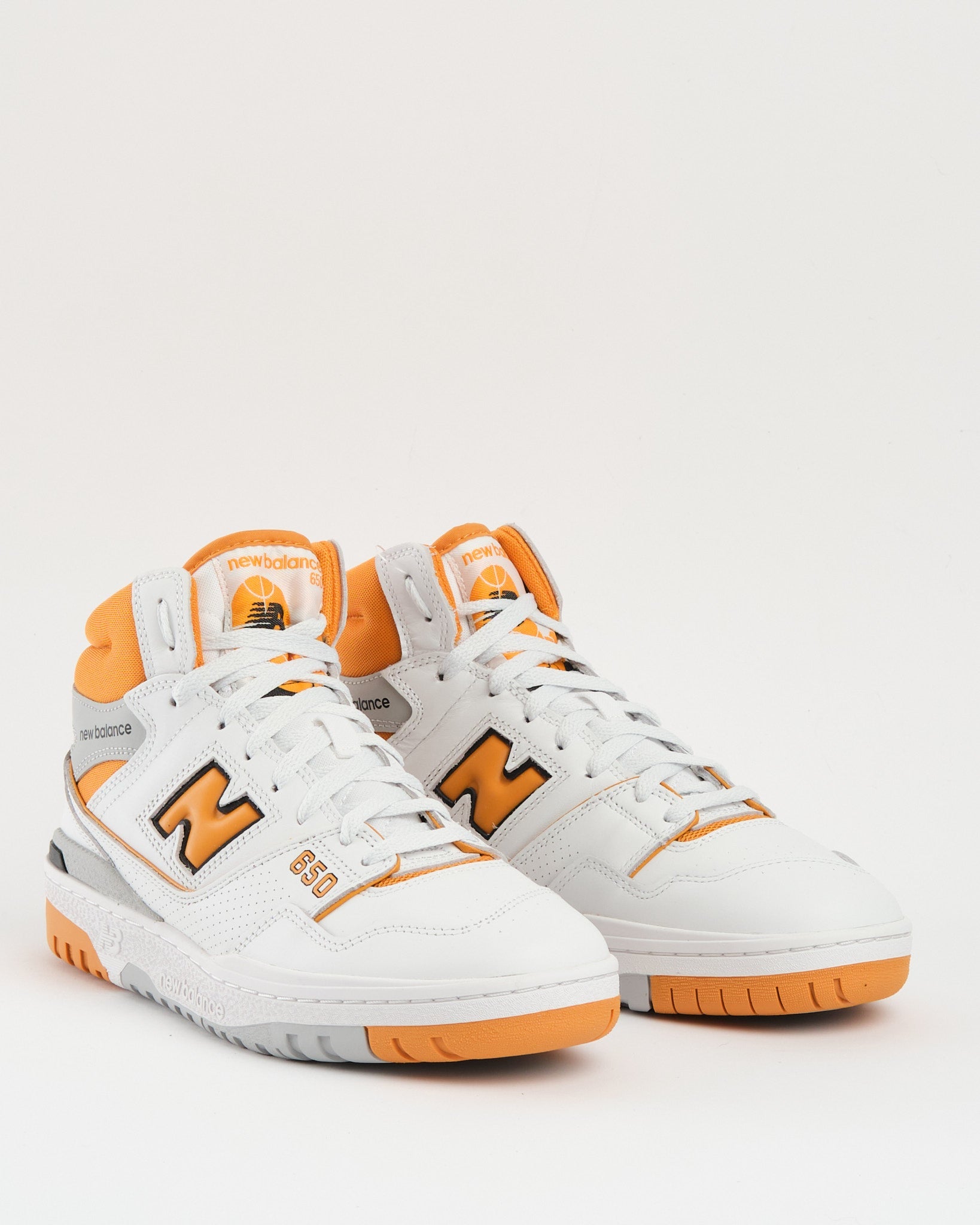 Koe New Balance BB650RCL -tennareiden viehätys kiehtovassa Valkoinen/Kanyon -väriyhdistelmässä. Nämä korkeavartiset kengät kunnioittavat 80- ja 90-luvulla suosittuja paksuja, pehmustettuja koripallokenkiä edustaen aikakautta, joka oli inspiroitunut kenttäsuunnittelusta ja muodista.