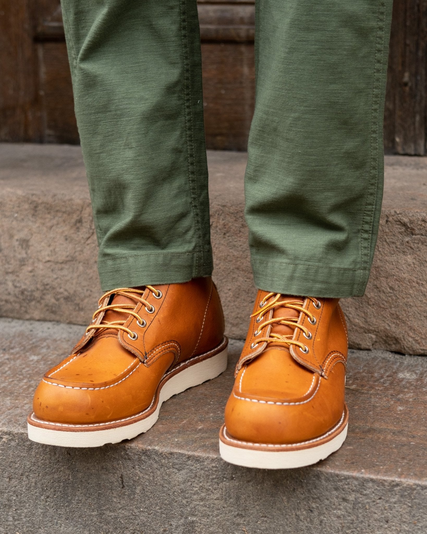 Upota itsesi jalkineiden historiaan 875 CLASSIC MOC TOE -kengällä ORO LEGACY -värissä RED WING SHOES -merkiltä. Sen perustamisesta vuonna 1952 lähtien Classic Moc on ollut suosittu urheilijoiden, maanviljelijöiden ja tehdastyöntekijöiden keskuudessa sen kestävyyden ja vertaansa vailla olevan mukavuuden vuoksi. Tänä päivänä tämä kenkä jatkaa ajattomuuden ilmentämistä yhdistämällä Moc toe -rakenteen ikonisiin Traction Tred -kumipohjiin. Puritan-tikkauksilla ja luotettavalla Goodyear welt -rakenteella tämä kenkä on kestävyyden ja ajattoman tyylikkyyden perikuva.