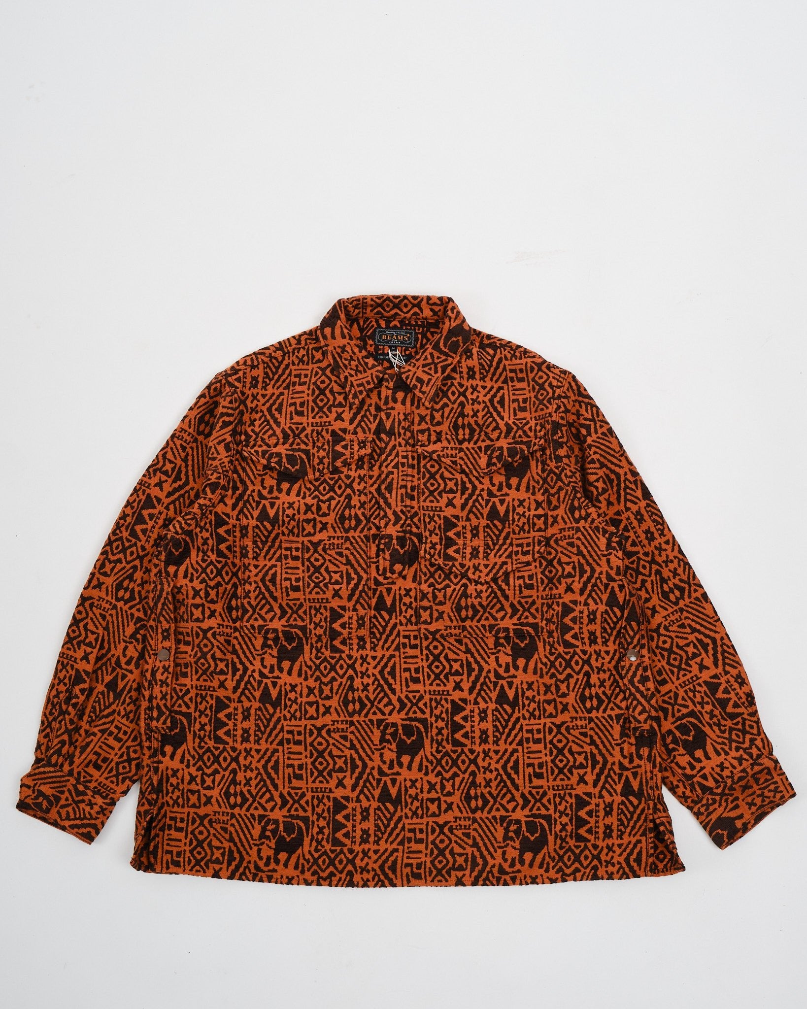 Koe tyylin matka Beams+ Adventure Shirt III -paidalla, joka on suunniteltu terrakotan oranssin ja ruskean värimaailmassa. Tämä paita erottuu batikista inspiroidulla jacquard-kudoksellaan, joka vangitsee tekstiilien olemuksen. Puuvillasekoitteesta valmistettu paita esittelee levitetyn kauluksen, tyylikkään piilotetun etusuljennan ja käytännölliset nepparikiinnitteiset kalvosimet. Kaksi läppätaskua rinnassa lisäävät suunnitteluun ilmettä, kun taas suora helma varmistaa ulkonäön, valitsitpa sitten pukea sen sisään tai pitää sen ulkona.