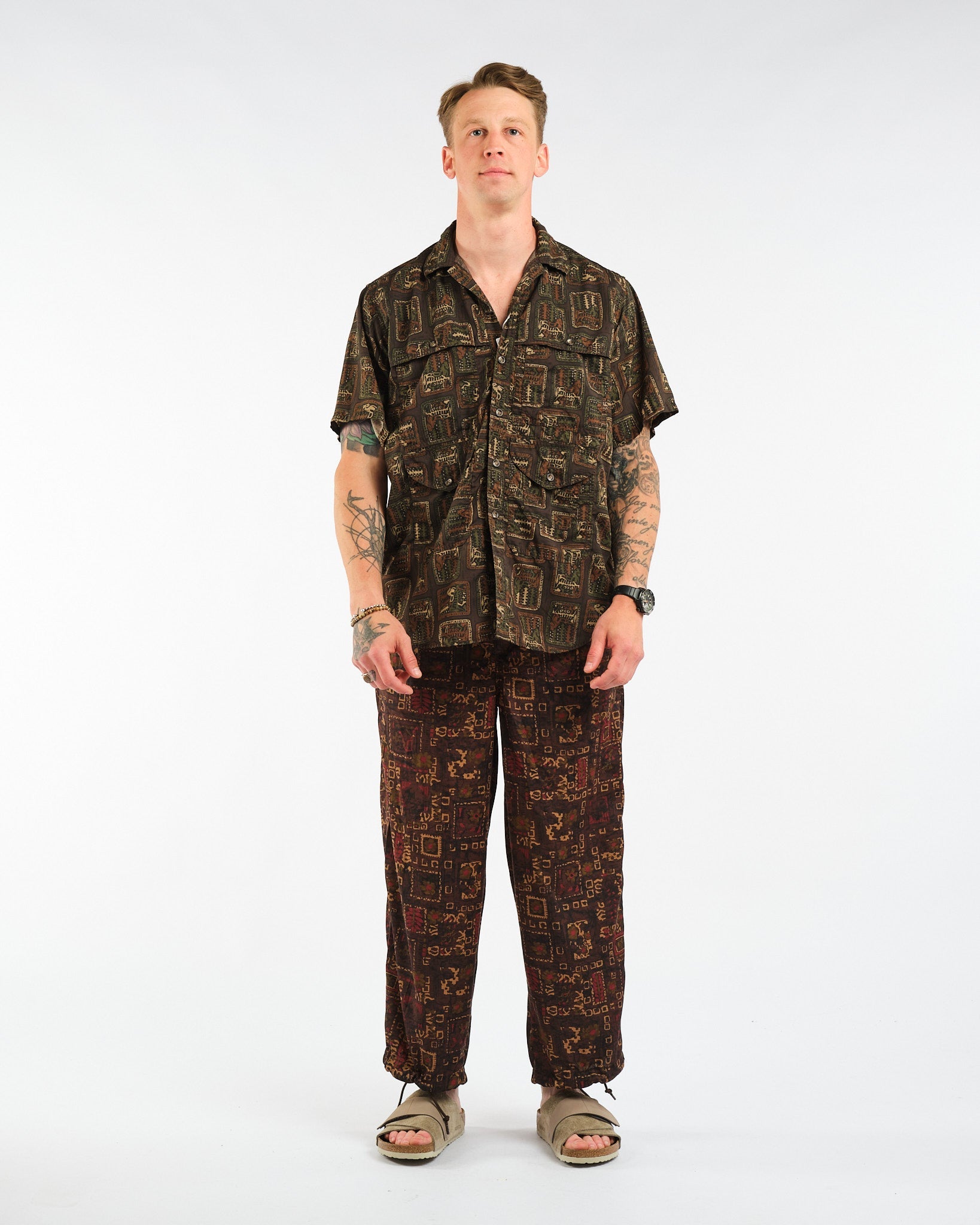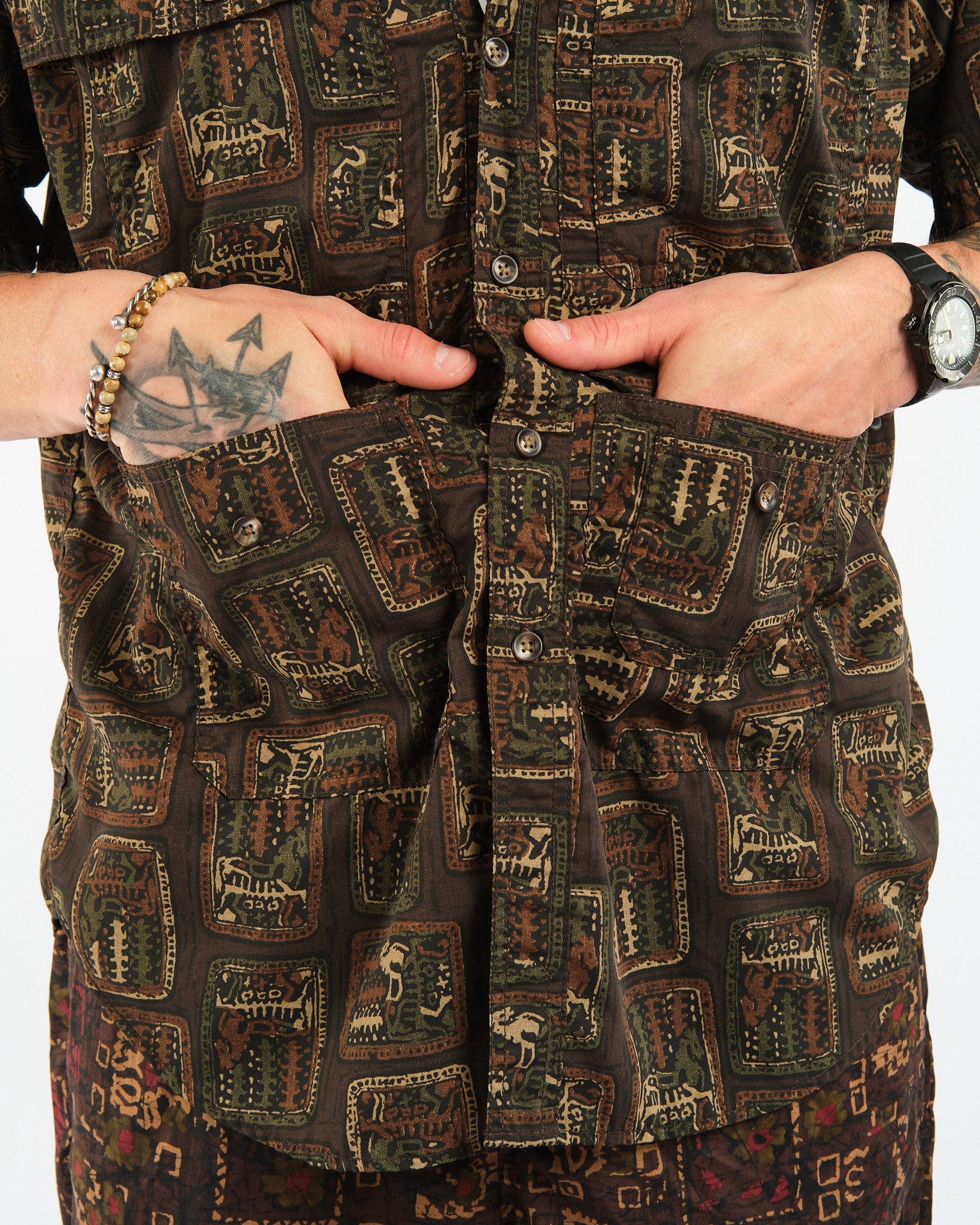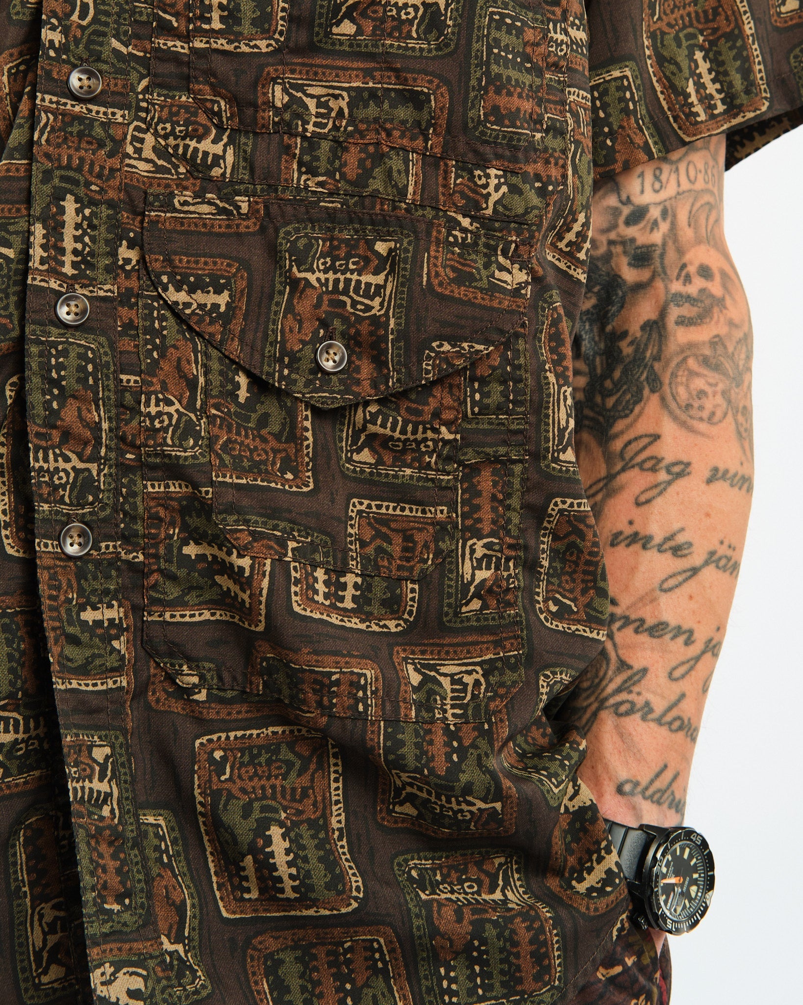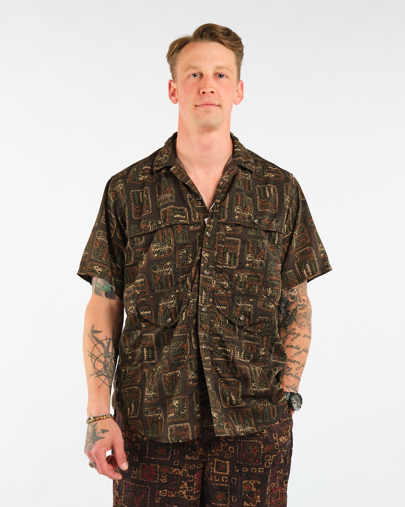 Vapauta rohkea tyylisi Adventure Shirt II Polyester Broad Animal Print -paidalla Beams Plusilta. Tämä 100% polyesterista valmistettu paita, joka on koristeltu kokonaan eläinprintillä, tuo villin elementin vaatekaappiisi. Siinä on kääntökaulus ja napillinen etusuljenta, tarjoten hienostuneen mutta seikkailunhaluisen ilmeen. Varustettu kahdella itsekankaalla tehtyillä läppätaskulla rinnassa ja alla, tämä paita ei uhraa toiminnallisuutta tyylille. Kaareva helma ja takakappale lisäävät erottuvuutta suunnitteluun. Japanissa valmistettu, tämä regular fit -paita lupaa laatua ja tyyliä.