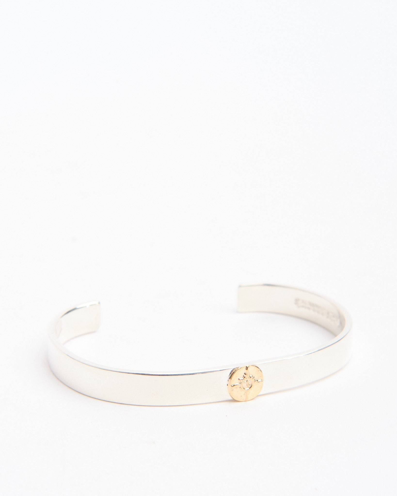 The Flat Hammered 8mm Plane Bungle with K18 in M size balances bold craftsmanship with everyday wearability. Handcrafted in Japan from Britannia Silver 950, this bracelet features a slimmer 8mm profile that still carries the character of a hammered surface, each mark adding depth and reflection. A touch of 18k yellow gold brings warmth and contrast, highlighting the beauty of mixed metals. Reinforced with First Arrows’ special heat-treatment process, the silver is bright yet durable, designed to age gracefully as its tone darkens and plays against the gold’s enduring glow. Inspired by Native American jewelry but refined for modern life, this bungle is versatile enough to stand alone or to be layered with other pieces.