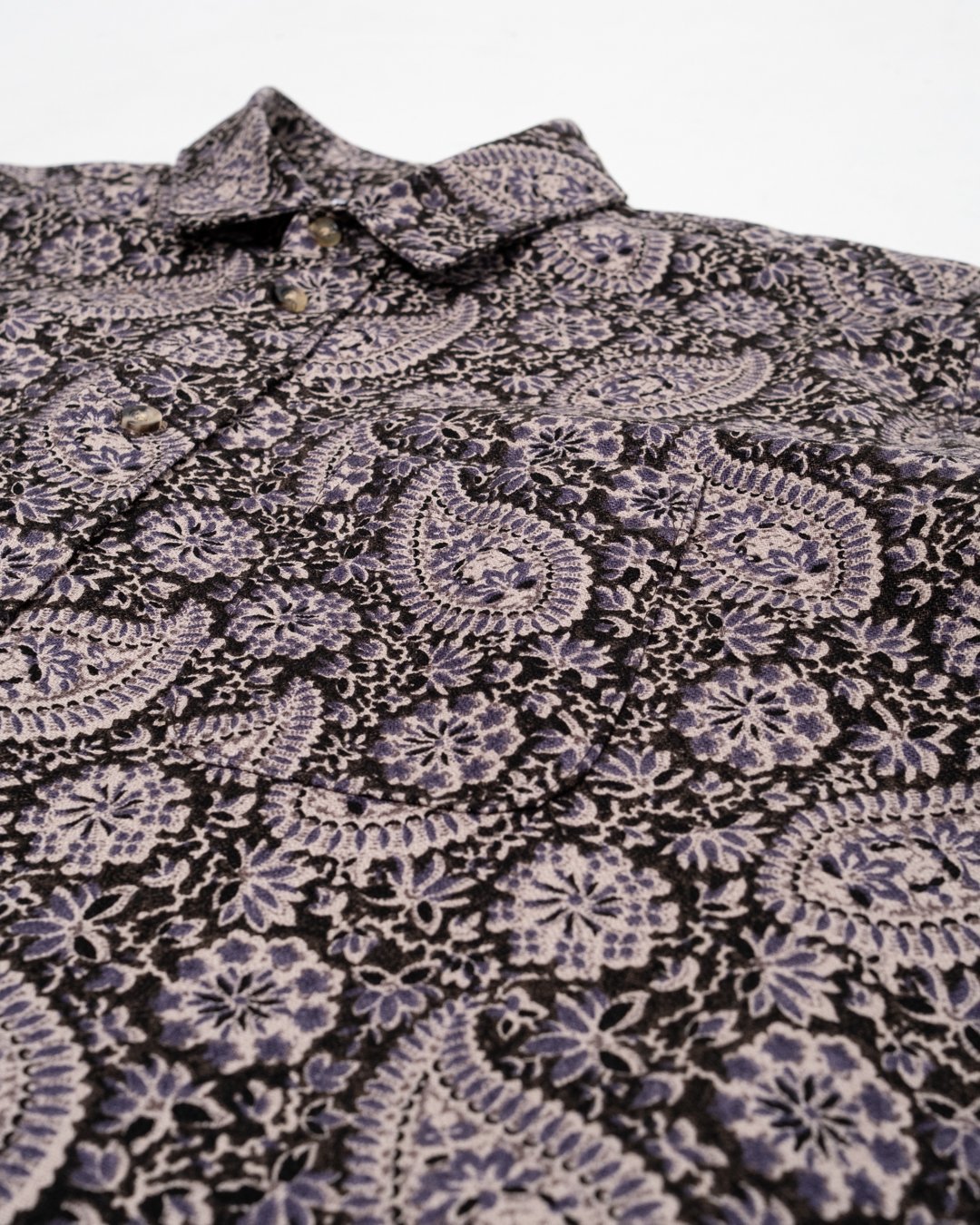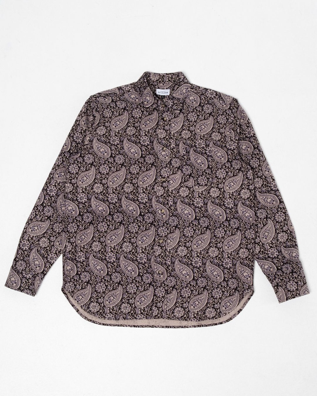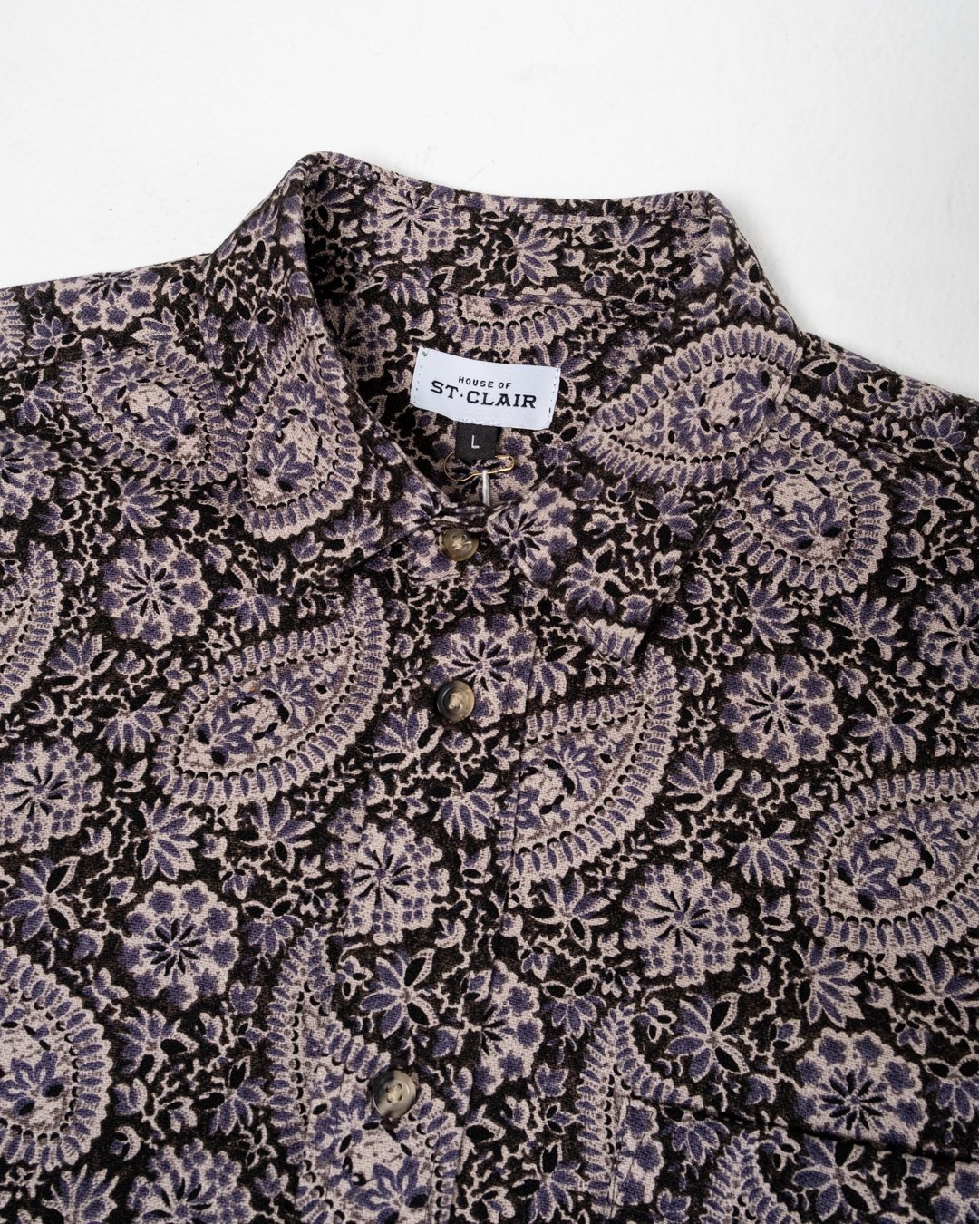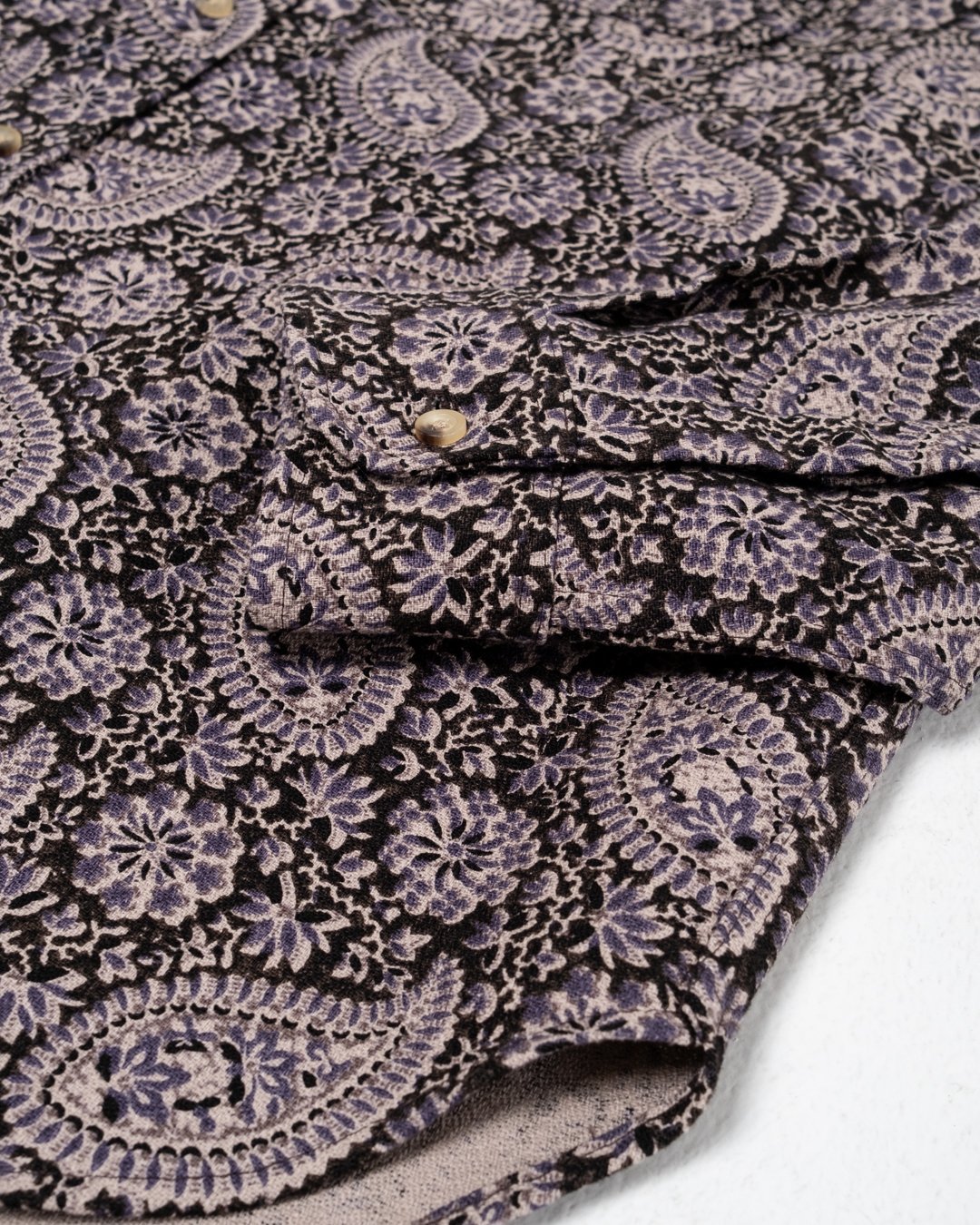 Broadway-paita, violetti paisley House of St. Clairilta. Nappipaita 100% japanilaisesta puuvillamelonikankaasta. Yksi rintatasku, suora helma sivuhalkioilla. Aidot sarvinapit. Valmistettu USA:ssa.
