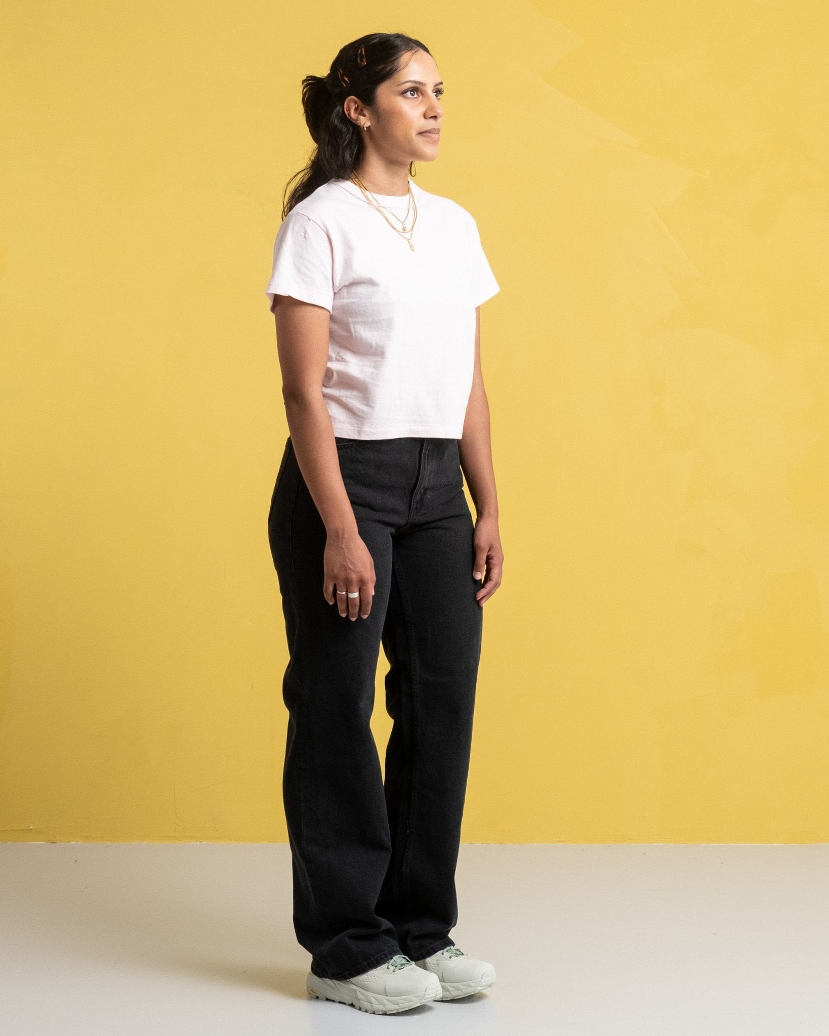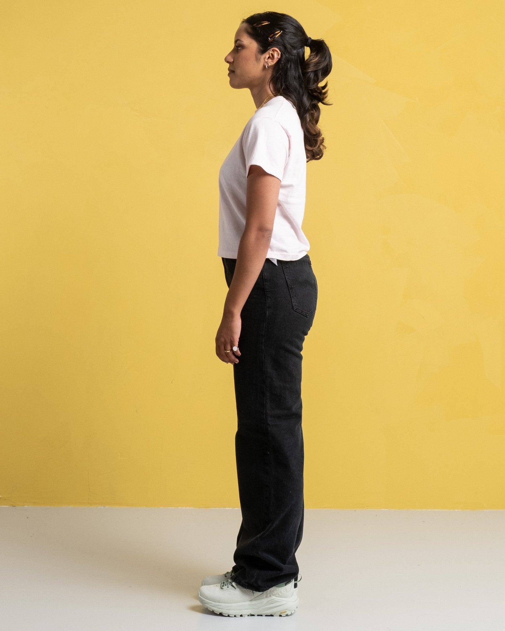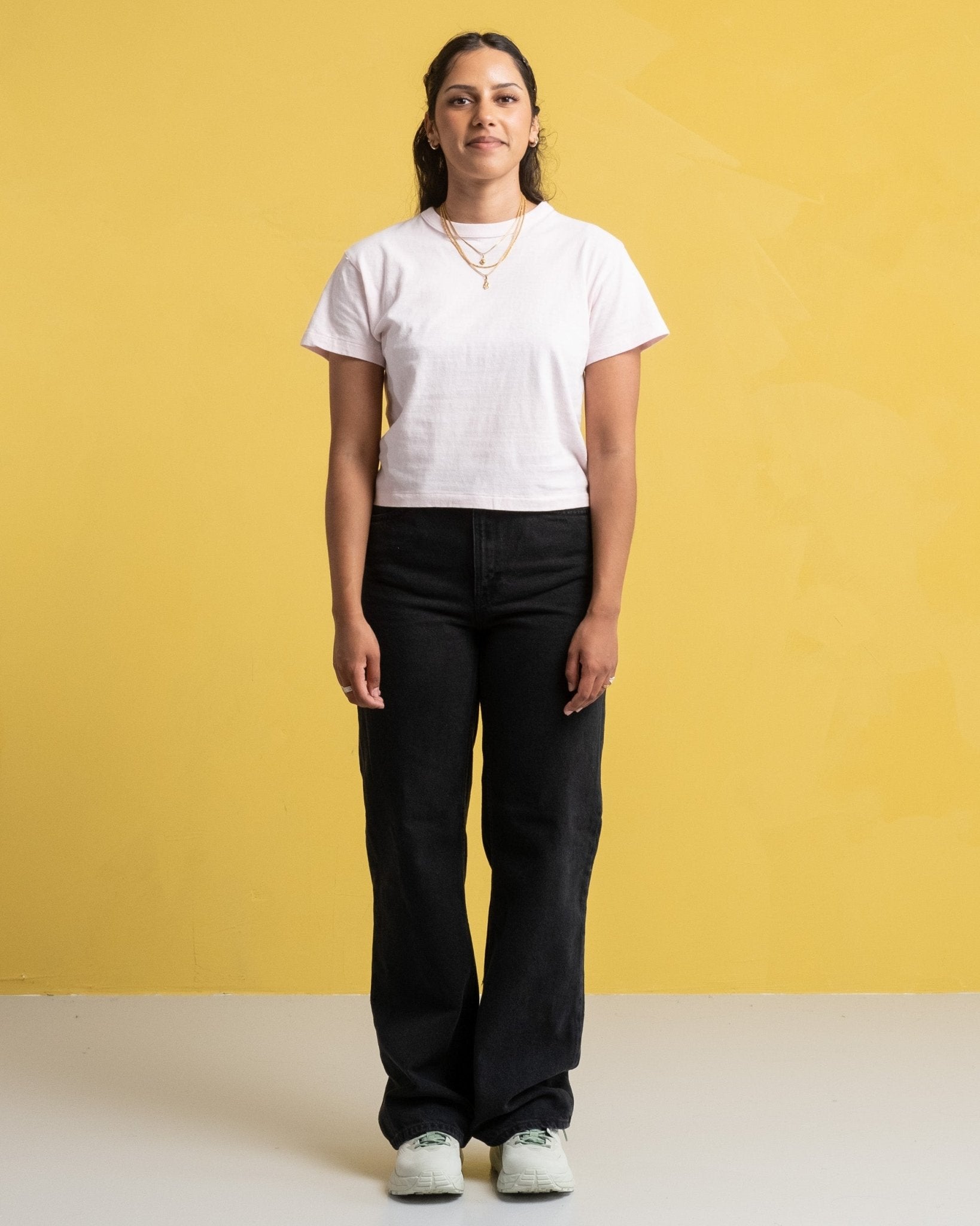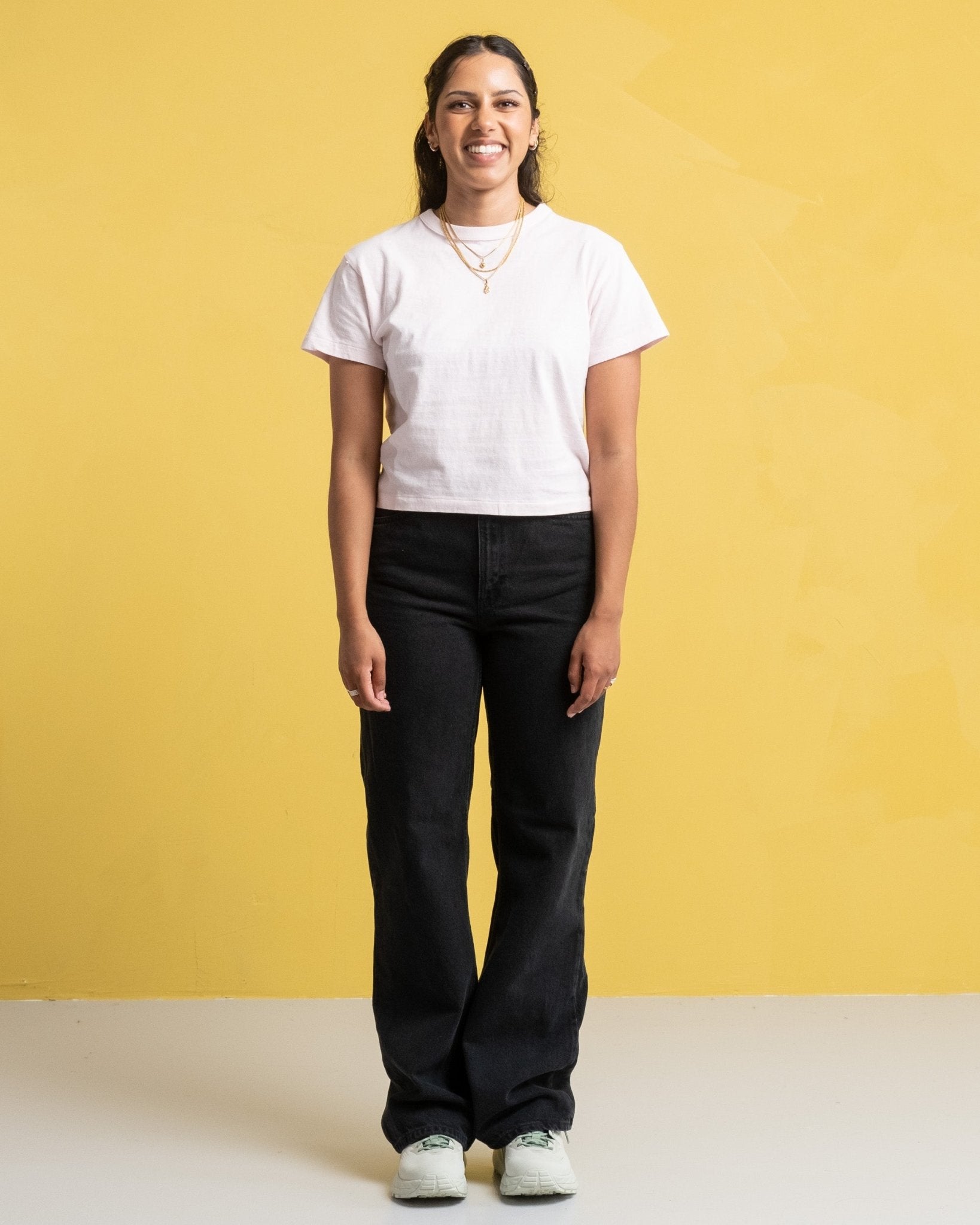 Celeste on 170 cm pitkä, normaalivartaloinen ja käyttää kokoa 28/30.