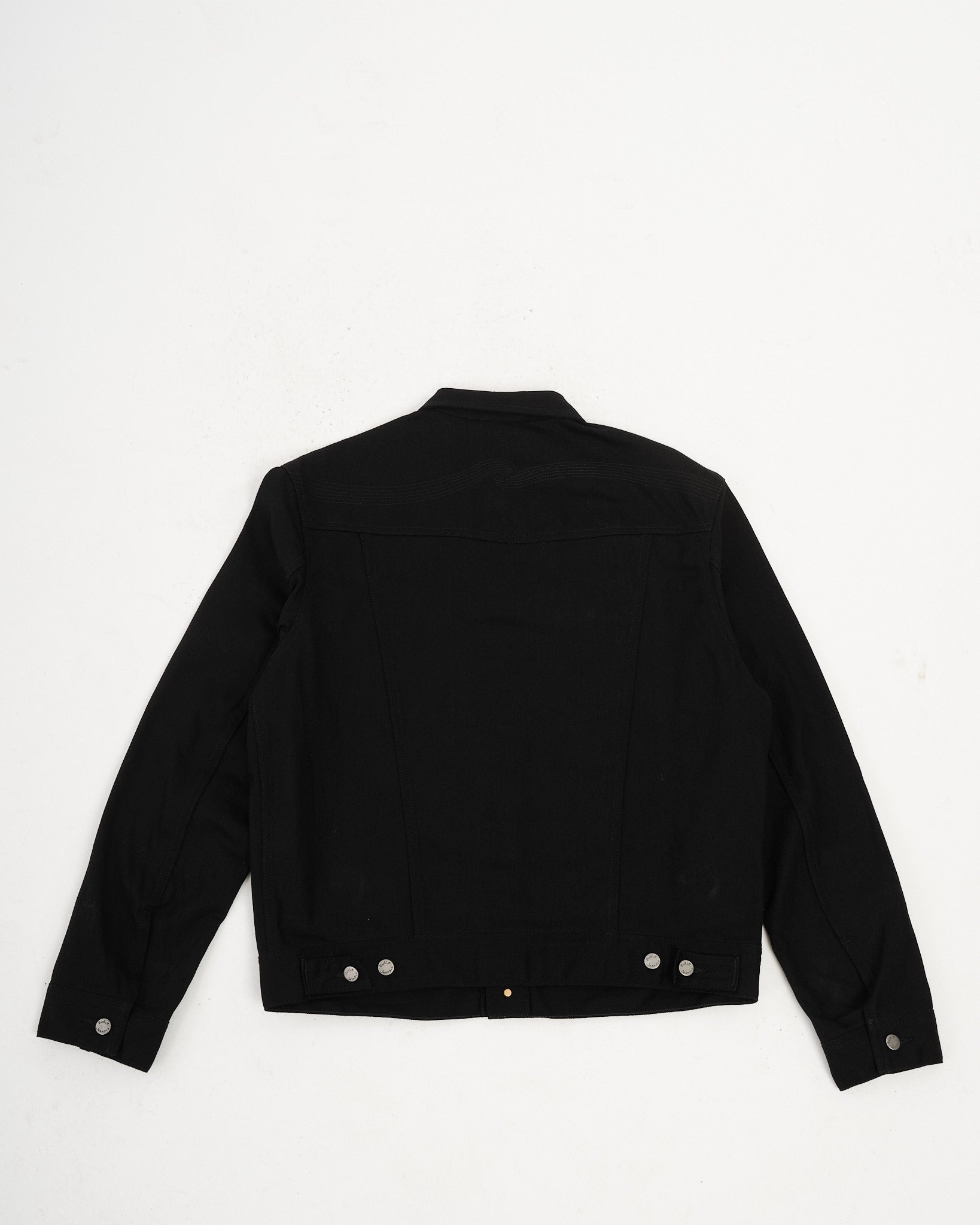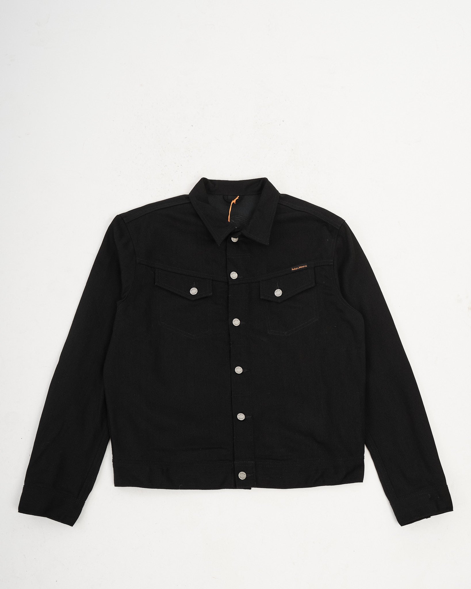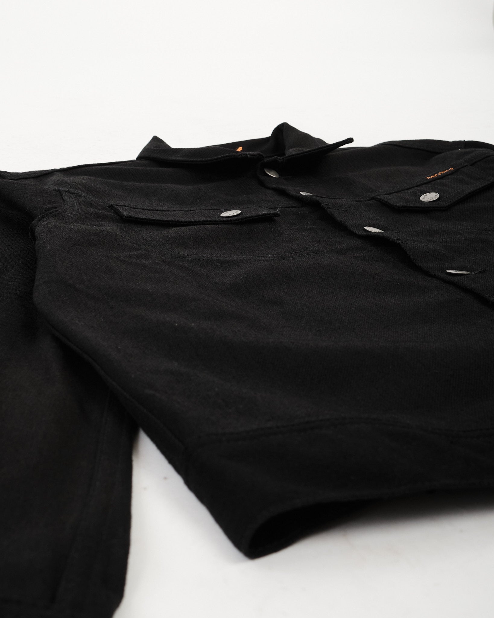 Nudie-klassikko, Conny, palaa Dry Black Tar -versiossa — kapealinjainen farkkutakki, jossa on tunnusomaiset epäsymmetriset rintataskut ja kirjailtu takakappale. Valmistettu 12,3 unssin jäykästä luomufarkusta, tämä “musta päälle värjätty musta” kangas on aluksi sysimusta ja sileä, pehmeän tuntuinen. Ajan myötä se haalistuu tunnelmallisiin harmaan sävyihin ja paljastaa hienovaraisia marmorimaisia kontrasteja. Sen renkuloiminen rakenne tarjoaa puhtaan pinnan, jossa on vain häivähdys pystysuoria juovia, jotka vähitellen heräävät eloon. Viimeistelty antiikkihopeisilla napeilla, mustalla langalla läpi koko takin ja klassisella Jacron-läpällä, se on tehty kauniisti kehittymään.