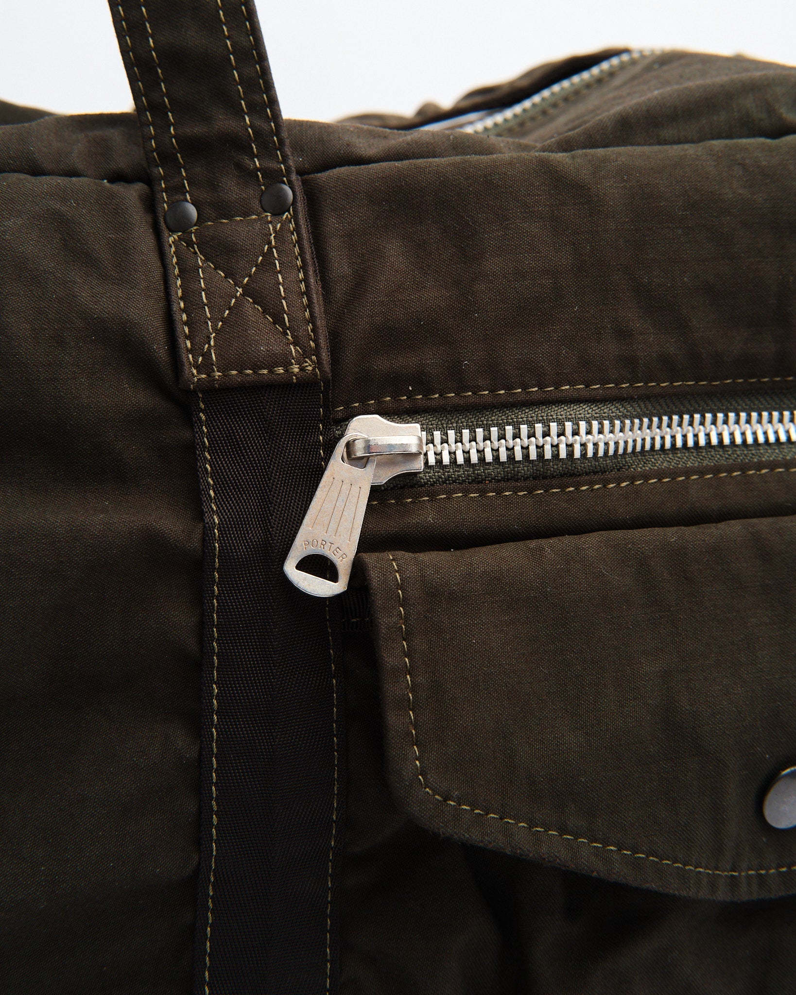 PORTER BY YOSHIDA Crag 2-Way Boston Bag (L) Khakin värissä on osa PORTER CRAG -sarjaa, joka on tunnettu ainutlaatuisesta tuotevärjäys prosessistaan, mikä tuloksena on syviä, rikkaita värejä ja erottuvaa tekstuuria. Valmistettu takasatiinikankaasta, tiheästä nylonin ja puuvillan sekoituksesta, tämä reppu on kestävä, mutta tarjoaa pehmeän, jämäkän tekstuurin. Kaksikylpyvärjäys -tekniikka syventää värin syvyyttä ja takaa hienovaraiset vaihtelut, antaen jokaiselle kappaleelle oman ainutlaatuisen luonteensa.