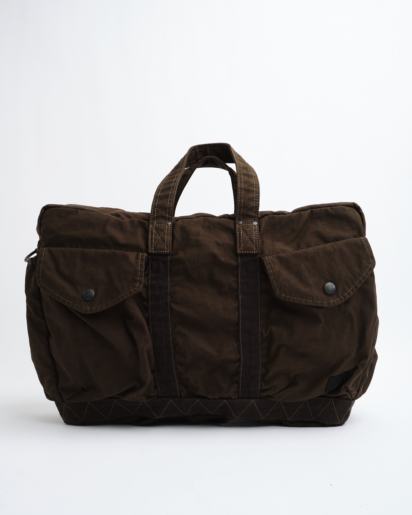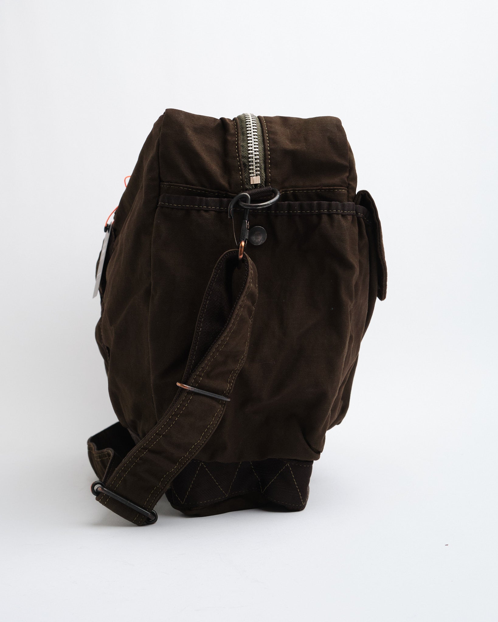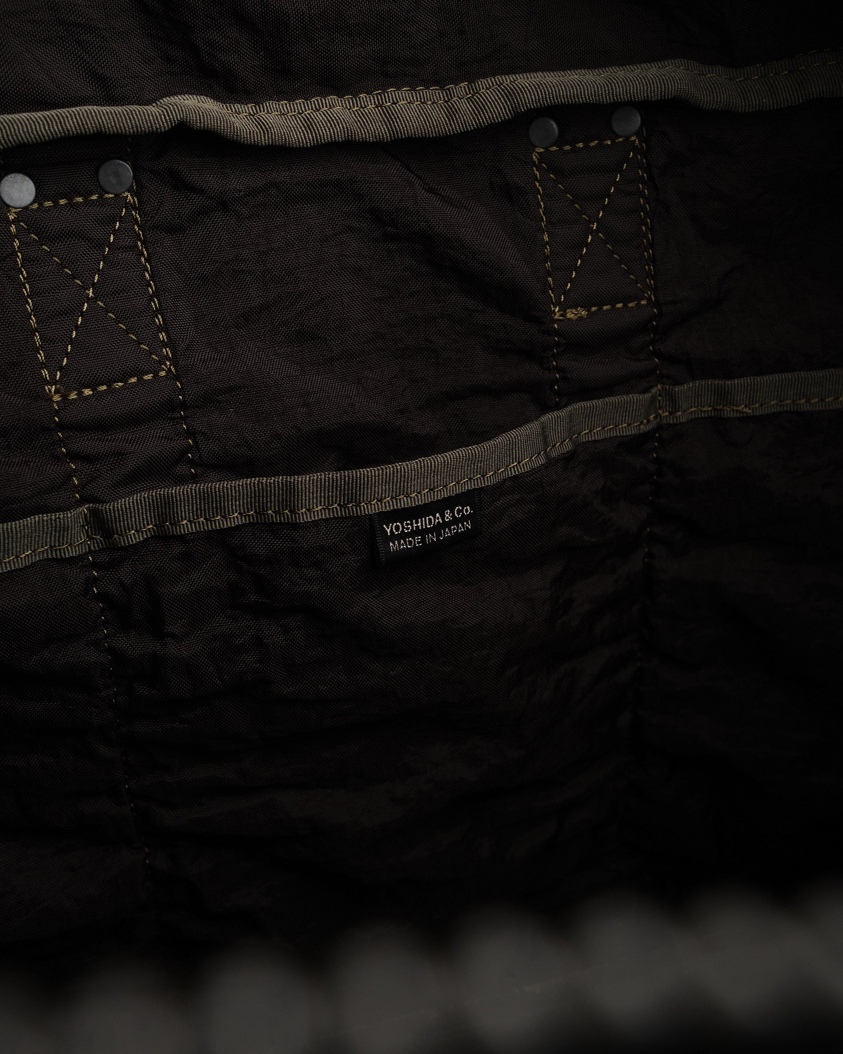 PORTER-YOSHIDA & CO. CRAG 2WAY BOSTON BAG (S) khakinvärisenä on monipuolinen ja kestävä kumppani päivittäiseen käyttöön ja matkustukseen. Japanissa valmistettu laukku on tehty tiheästä nylonista ja puuvillasekoitteesta, joka on värjätty vaatevärjäystekniikalla ainutlaatuisen värin ja tekstuurin saavuttamiseksi. Laukussa on tilava päälokero, useita taskuja tavaroiden järjestämiseen ja joustavuus kantaa sitä kädessä tai irrotettavalla olkahihnalla. Sen sotilasinspiroima design yhdistää toiminnallisuuden ajattomaan viehätykseen, heijastaen ylivoimaista japanilaista käsityötaitoa.