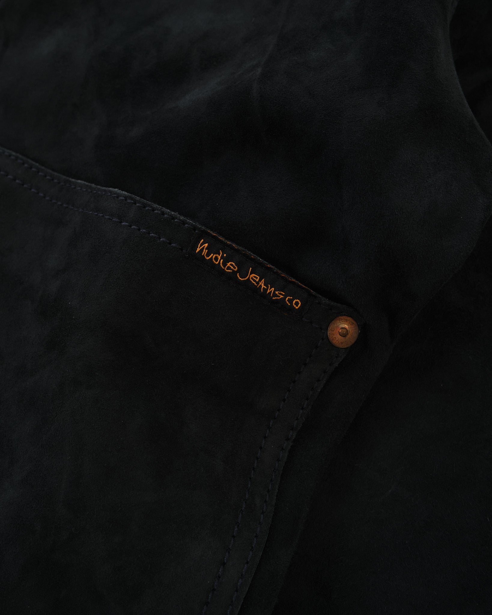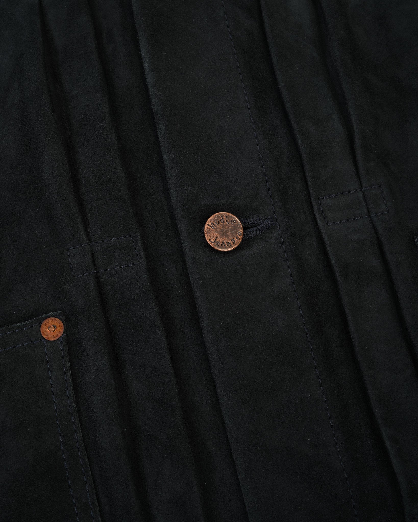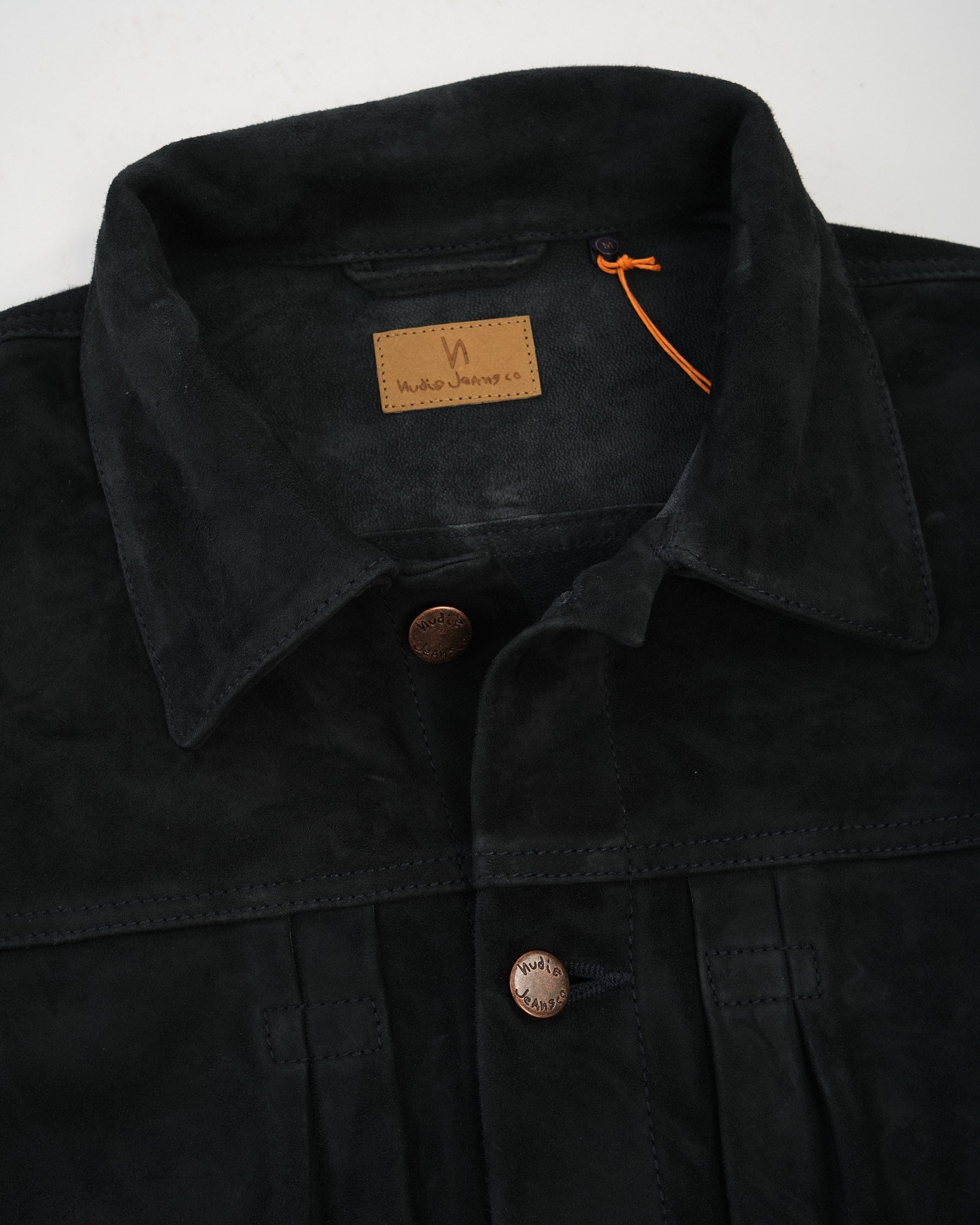 NUDIE JEANS CO. DANTE II MOKKANAHKATAKKI NAVY on hienostunut otos klassisesta farkkutakin siluetista, valmistettu poikkeuksellisen pehmeästä ja taipuisasta vuohenmokkanahasta. Tumma, vaaleansininen sävy korostaa mokkanahan rikasta tekstuuria, antaen sille vaivattoman tyylikkään ilmeen.