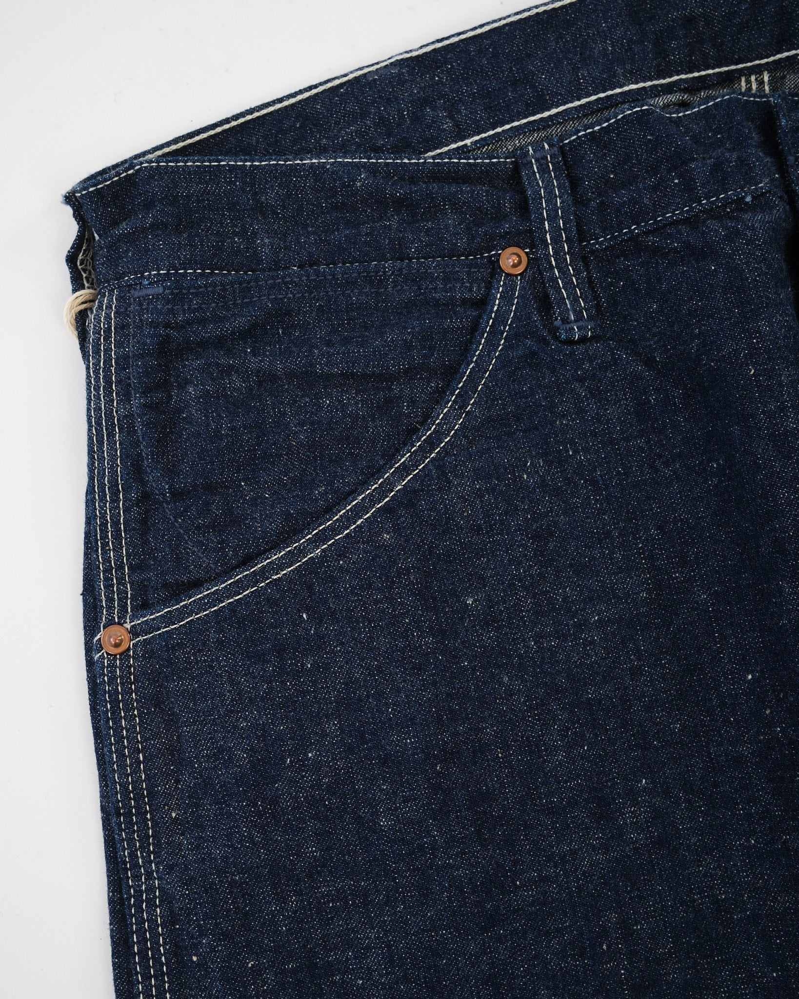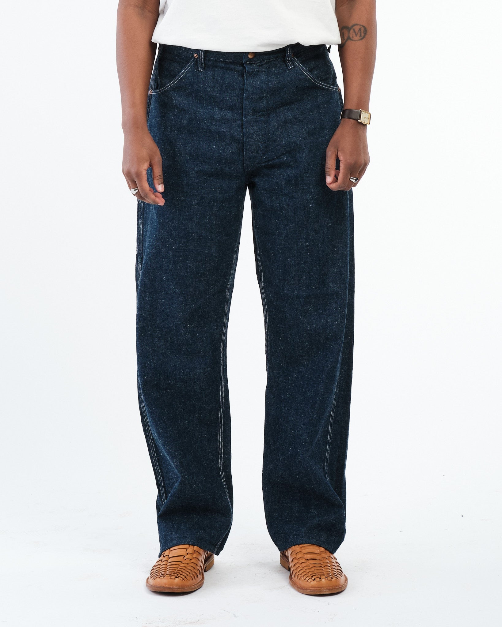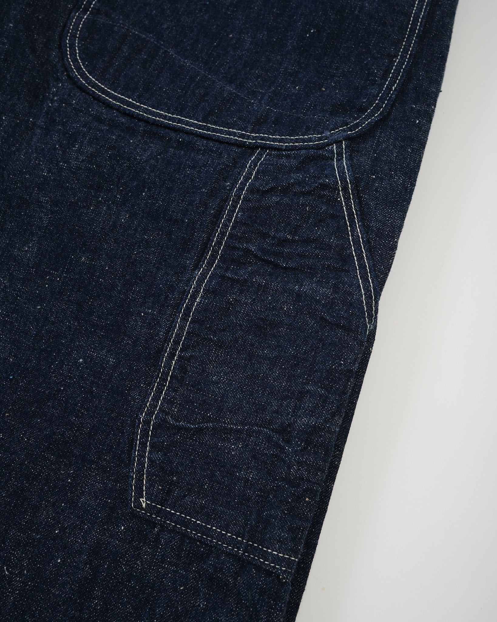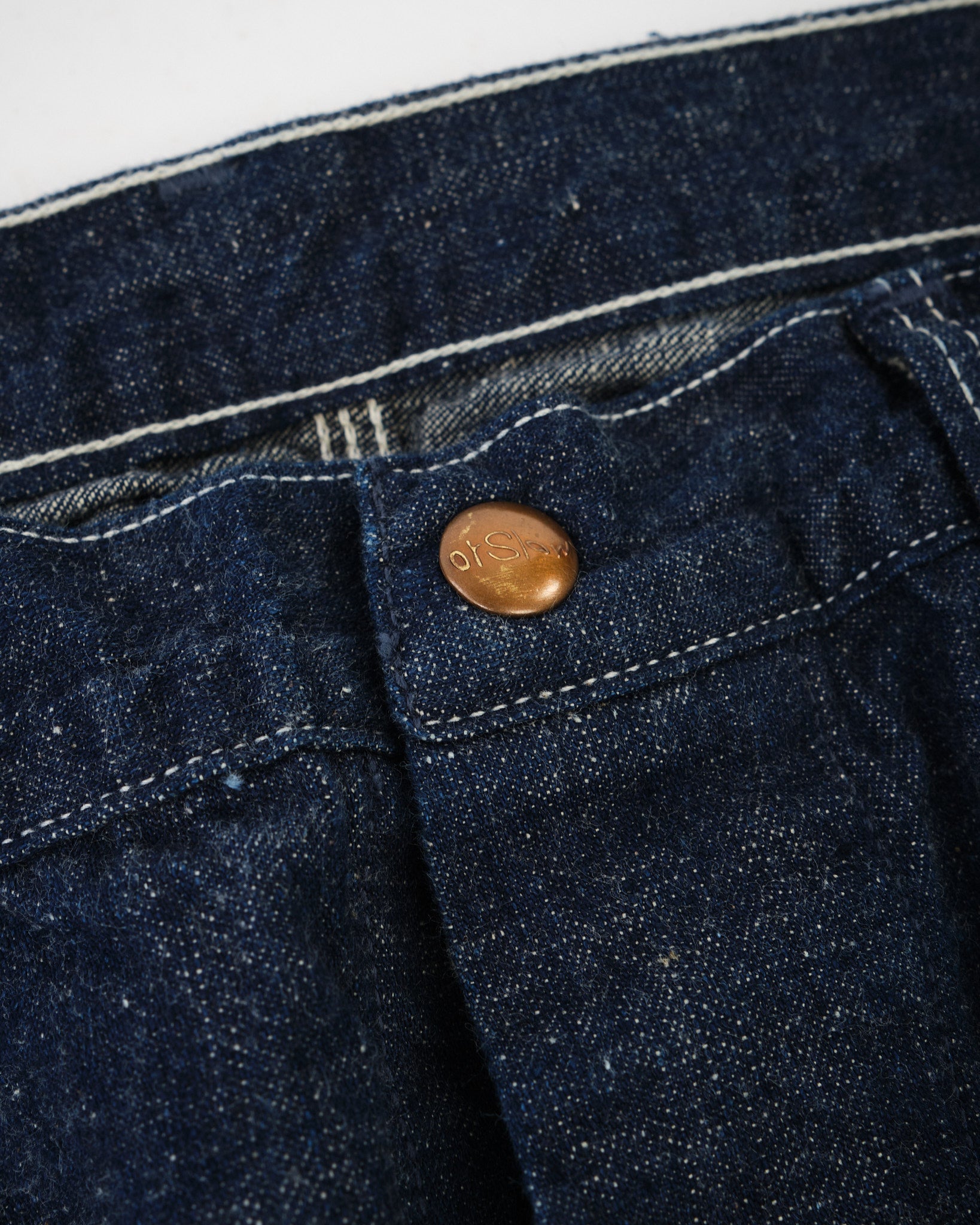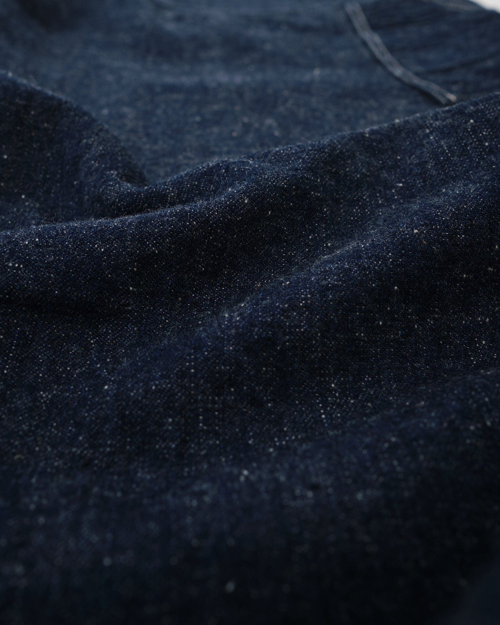 Syvä indigosininen väri, joka on saavutettu orSlown erottuvalla "yksi pesu" -käsittelyllä, tarjoaa rikkaan värin, joka kehittää ajan myötä ainutlaatuisen patinan, lisäten vaatteen luonnetta. Kontrastina valkoinen tikkaukset korostavat housujen rakennusyksityiskohtia.