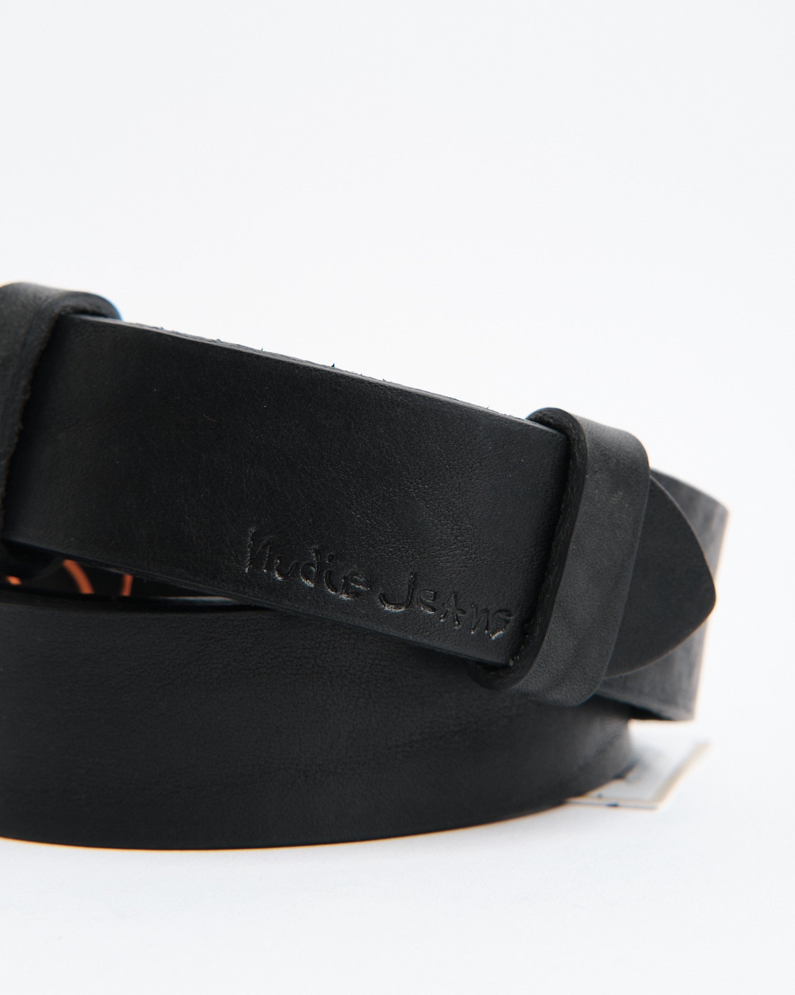 Dwayne Nahkavyö Musta Nudie Jeans Co:lta. Valmistettu kasviparkitusta täysjyvä nahasta, joka vanhenee kauniisti. Kaksi lenkkiä, metallisolki ja Nudie Jeansin painettu logo. 100% nahkaa ja 28 mm leveys. Koot ovat senttimetreinä. Valmistettu Puolassa.