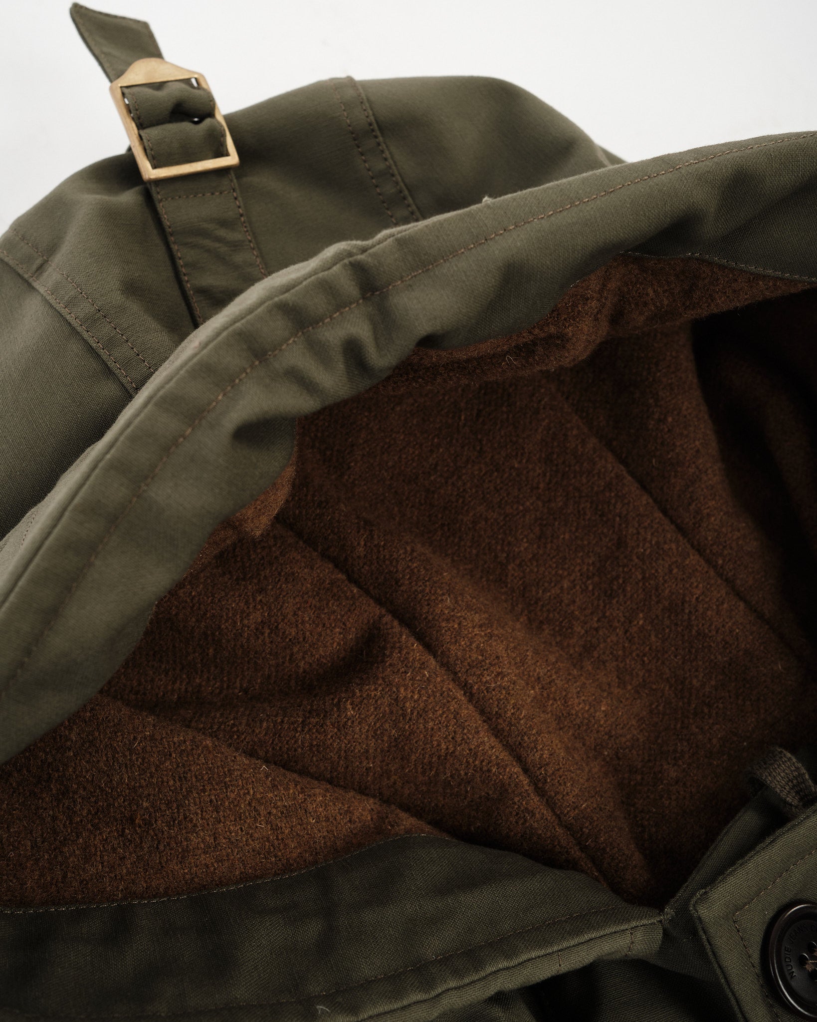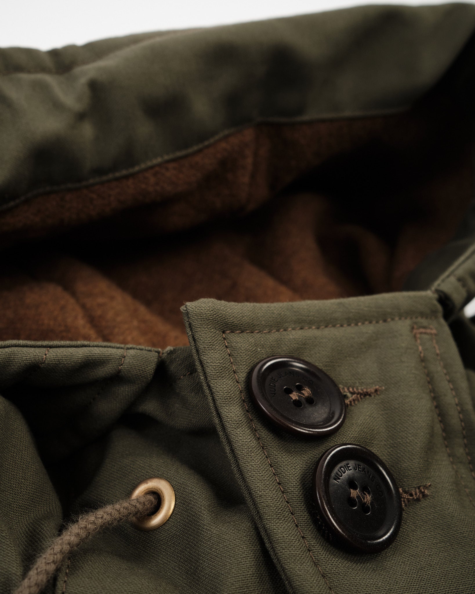 Sisäpuolelta löydät kierrätetystä kuidusta valmistetun vuorin, joka lisää juuri sopivan määrän lämpöä. Ulkopuolella kaikki on kiinni yksityiskohdista: luonnonkorozonapit, kultaviimeistelyt ja puhdas siluetti, joka tasapainottaa käytännöllisyyttä ja yksinkertaisuutta. Valmistettu Portugalissa Nudien kestävän kehityksen silmällä pitäen, tämä on parkatakki, joka kulkee puheiden mukana — hiljaa mutta itsevarmasti.
