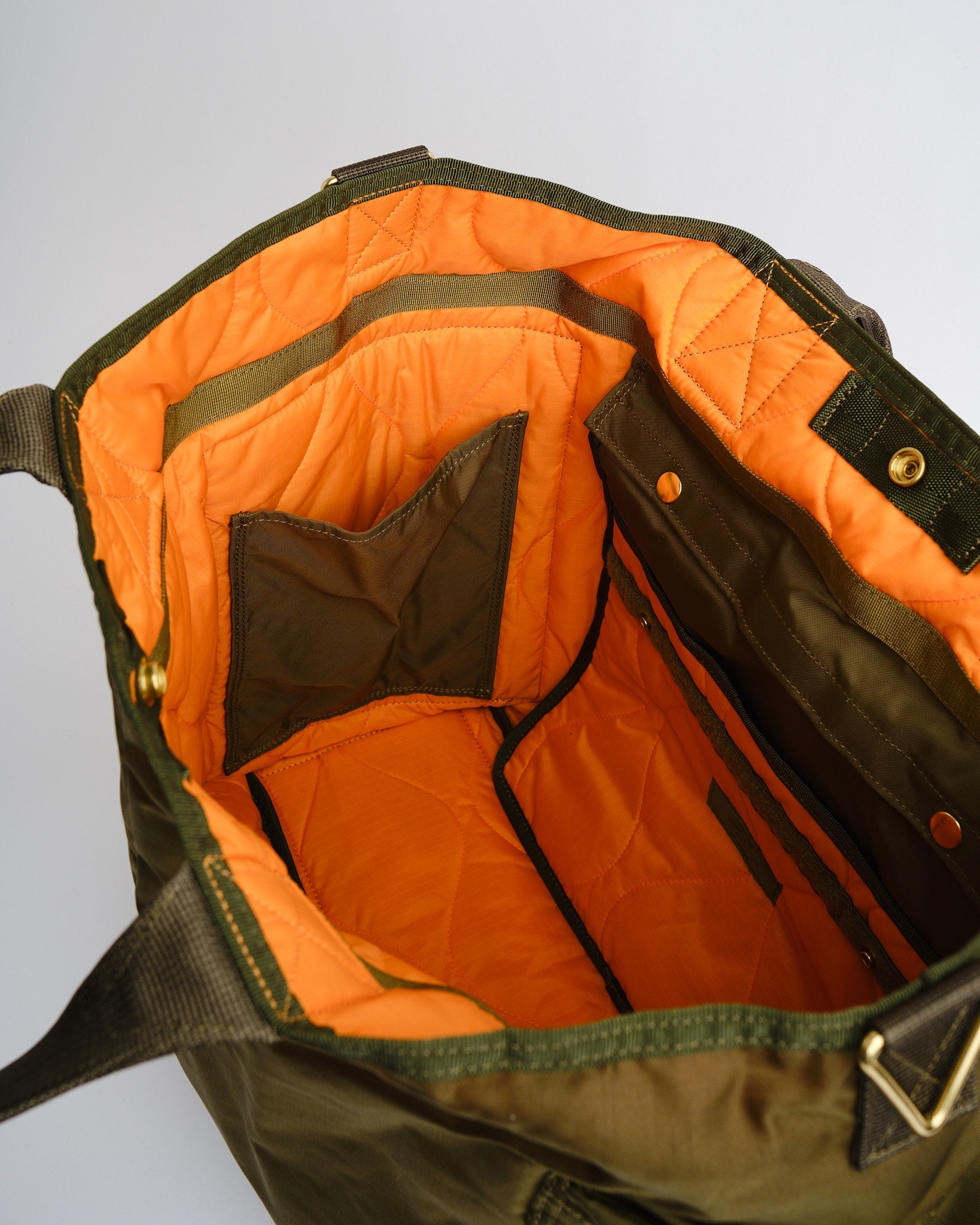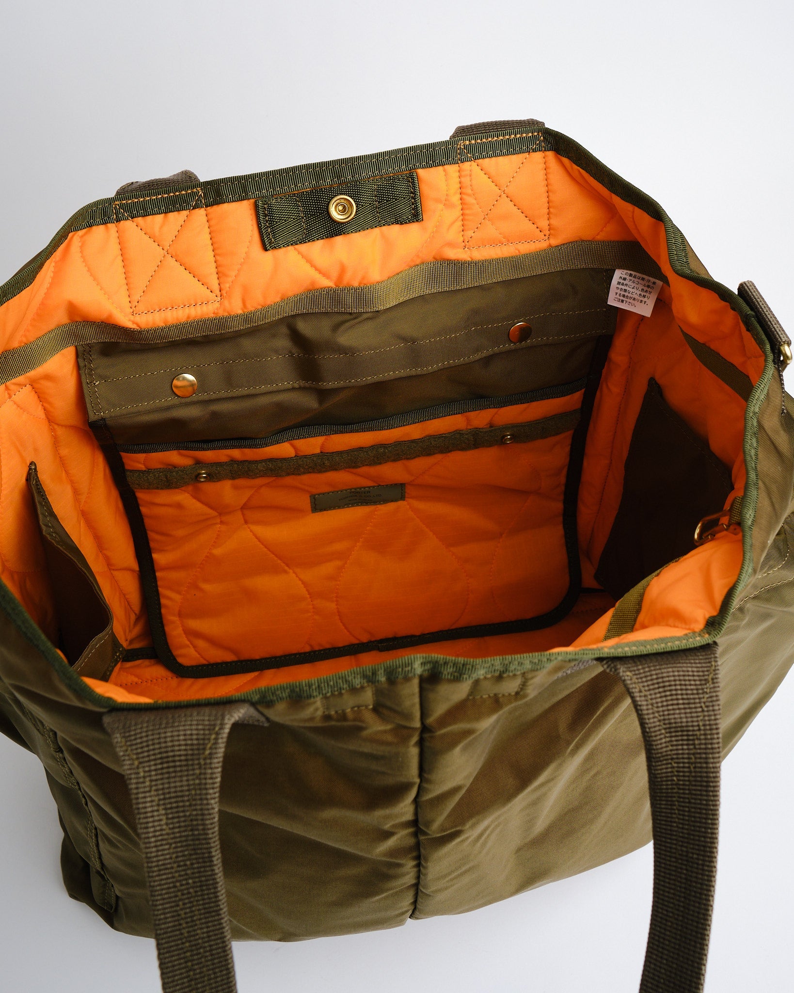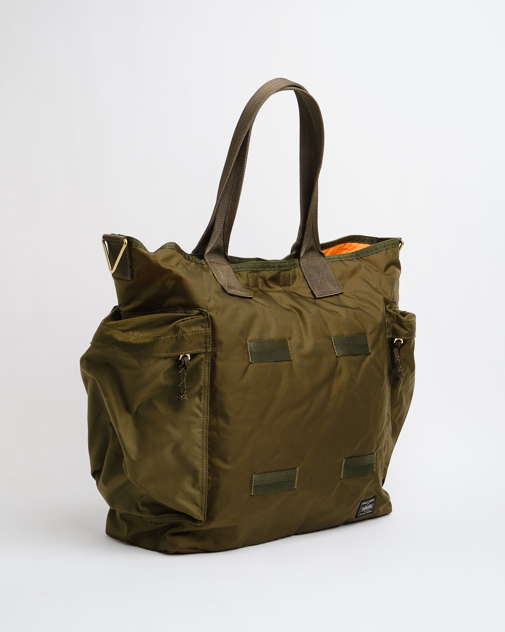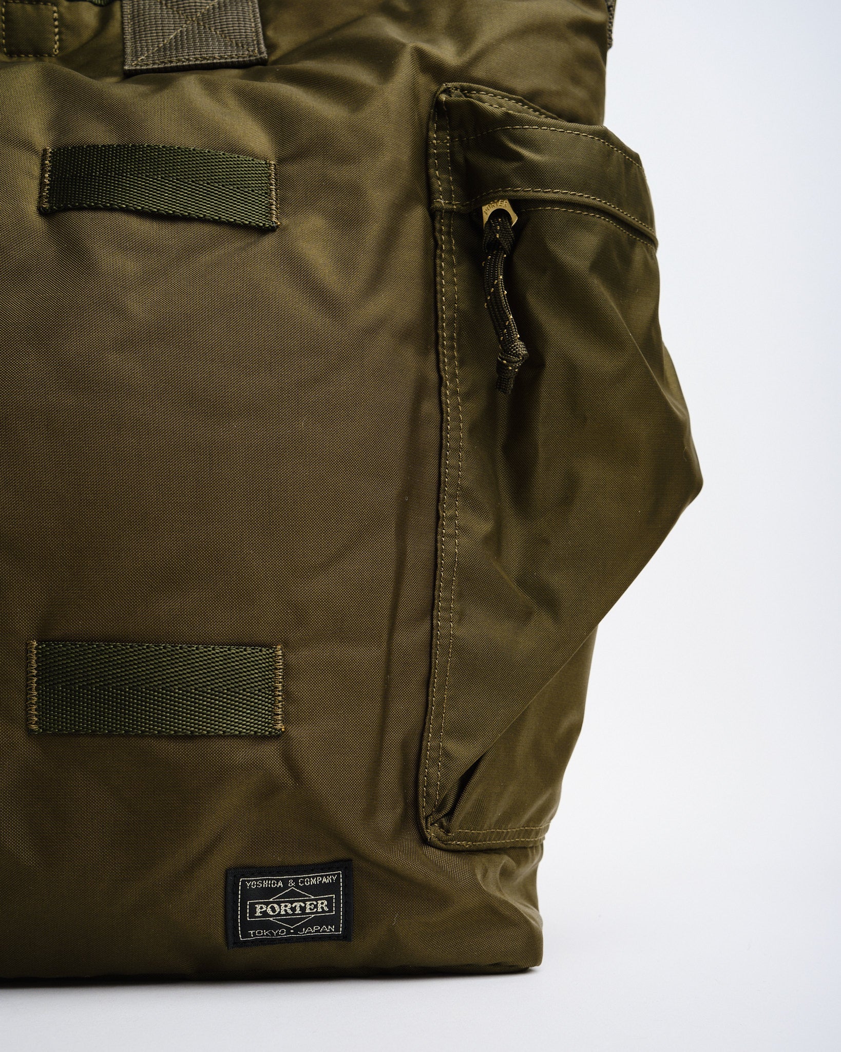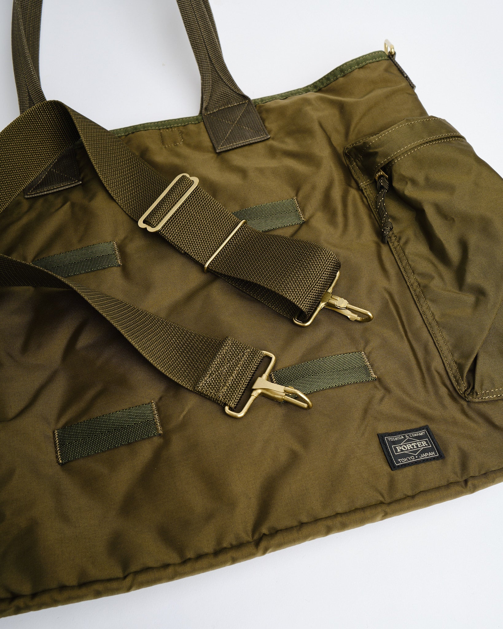 PORTER BY YOSHIDA Force 2-Way Tote Bag on osa PORTER FORCE -sarjaa, joka on saanut inspiraationsa sotilasesteettisyydestä ja sotilastavaroiden satunnaisista värierovaisuuksista. Erityinen piirre on hienovarainen väriero etutaskun ja laukun pääosan kankaan välillä, luoden vaikutelman eri kangaserien käytöstä. Tämä sarja juhlistaa sotilasvaatteissa ja -varusteissa luonnollisesti esiintyviä epäsäännöllisiä värimaailmoja.