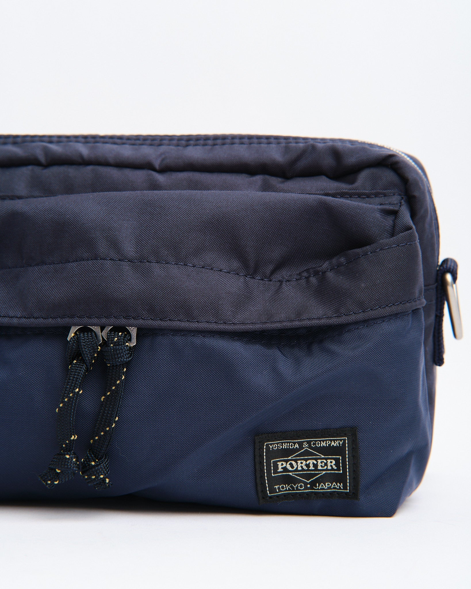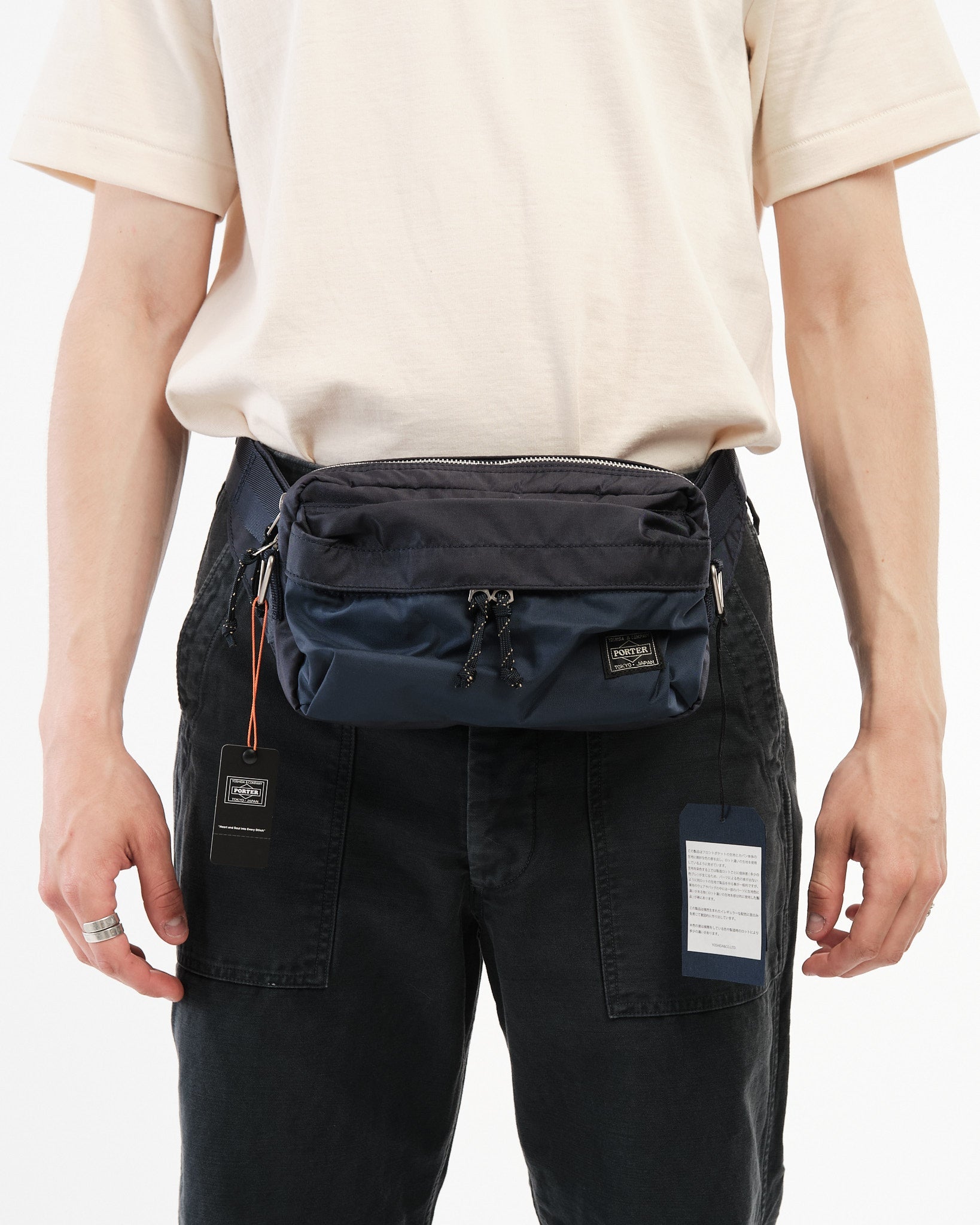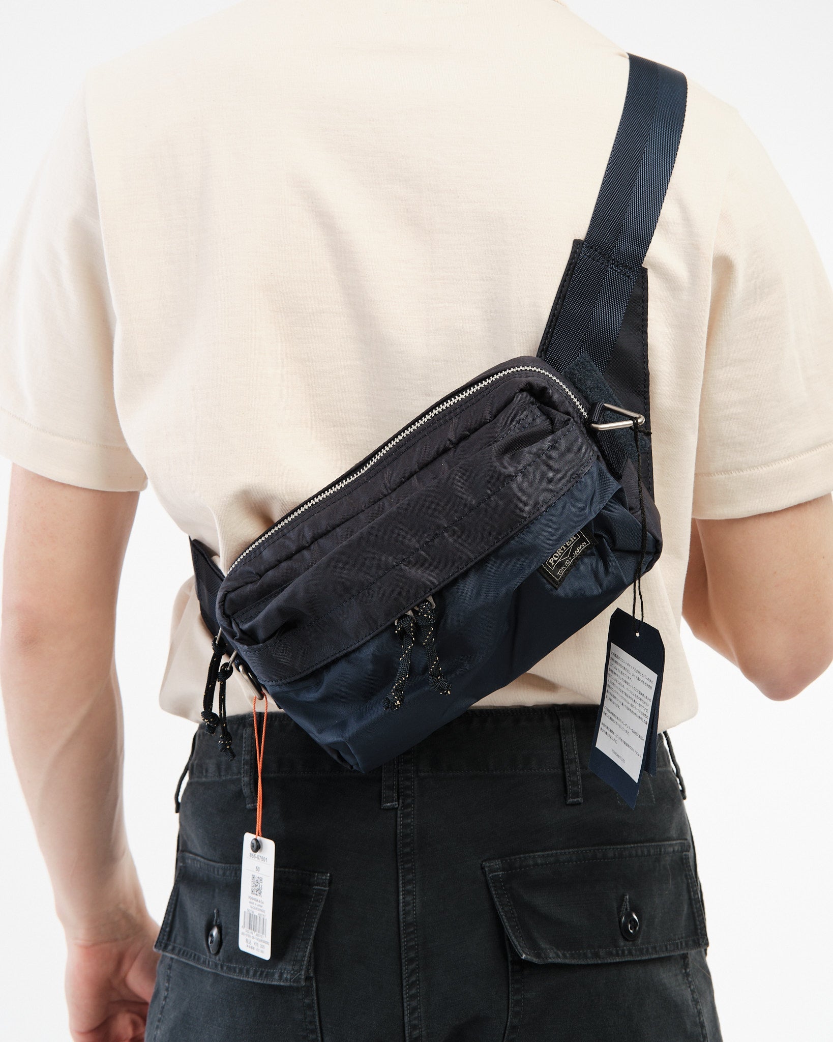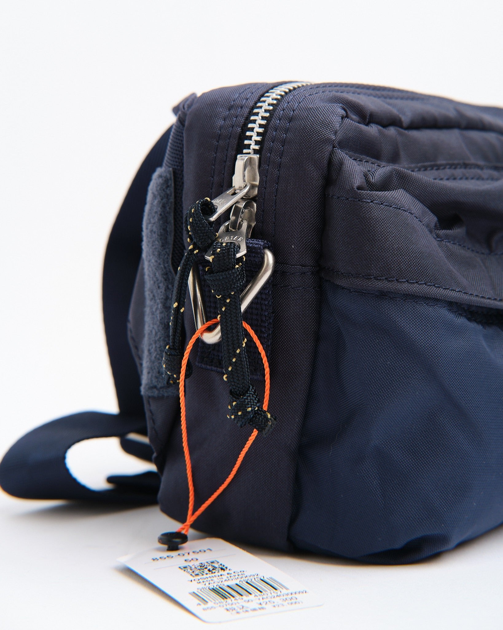 PORTER BY YOSHIDA Force 2-Way Waist Bag on osa PORTER FORCE -sarjaa, joka on saanut inspiraationsa sotilaallisesta estetiikasta ja sotilastavaroiden satunnaisista värierosta. Tämän suunnittelun määrittelevä piirre on hienovarainen väriero etutaskun kankaan ja laukun pääosan kankaan välillä, mikä saa sen näyttämään siltä, kuin eri kangaseriä olisi käytetty. Tämä sarja omaksuu sotilasvaatteissa ja -varusteissa luonnostaan esiintyvät epäsäännölliset värimaailmat.