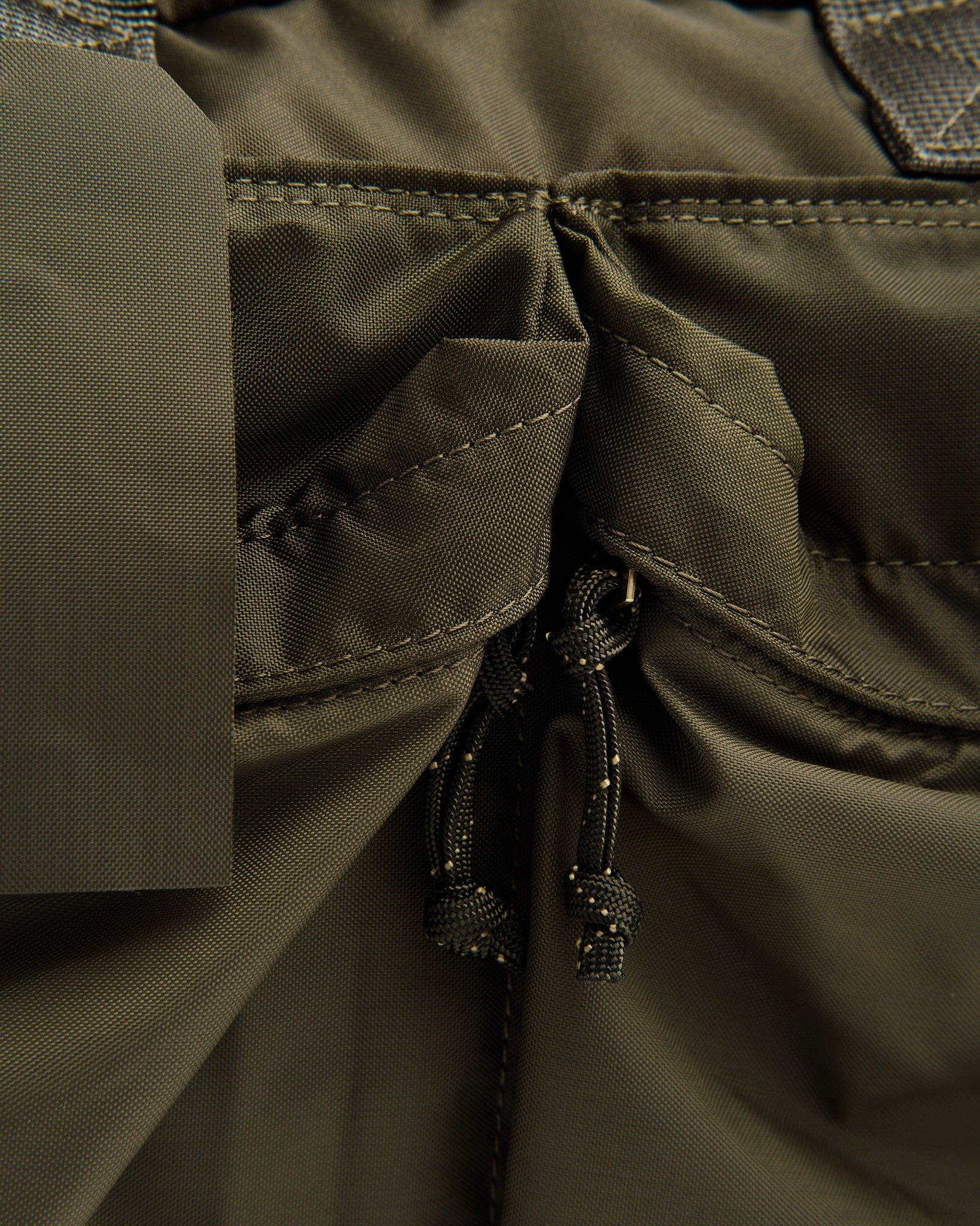 Valmistettu teollisuustason kankaasta, joka on kudottu 210 denierin 6 nylon vahvalla langalla, alun perin käytetty kumiveneissä, laukku on erittäin kestävä. Sisusta ylpeilee hätäväri oranssilla vuorilla, jotka on inspiroitu sotilastakin vuorista, ja ominaisuuksiin kuuluu tikattu ripstop-nylon lisääntyneen kestävyyden vuoksi.