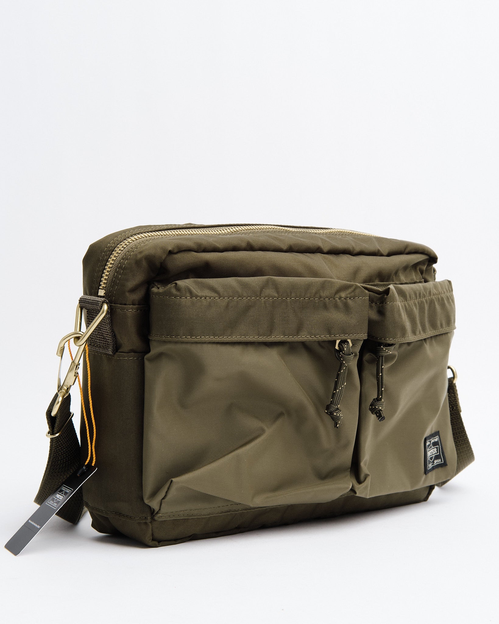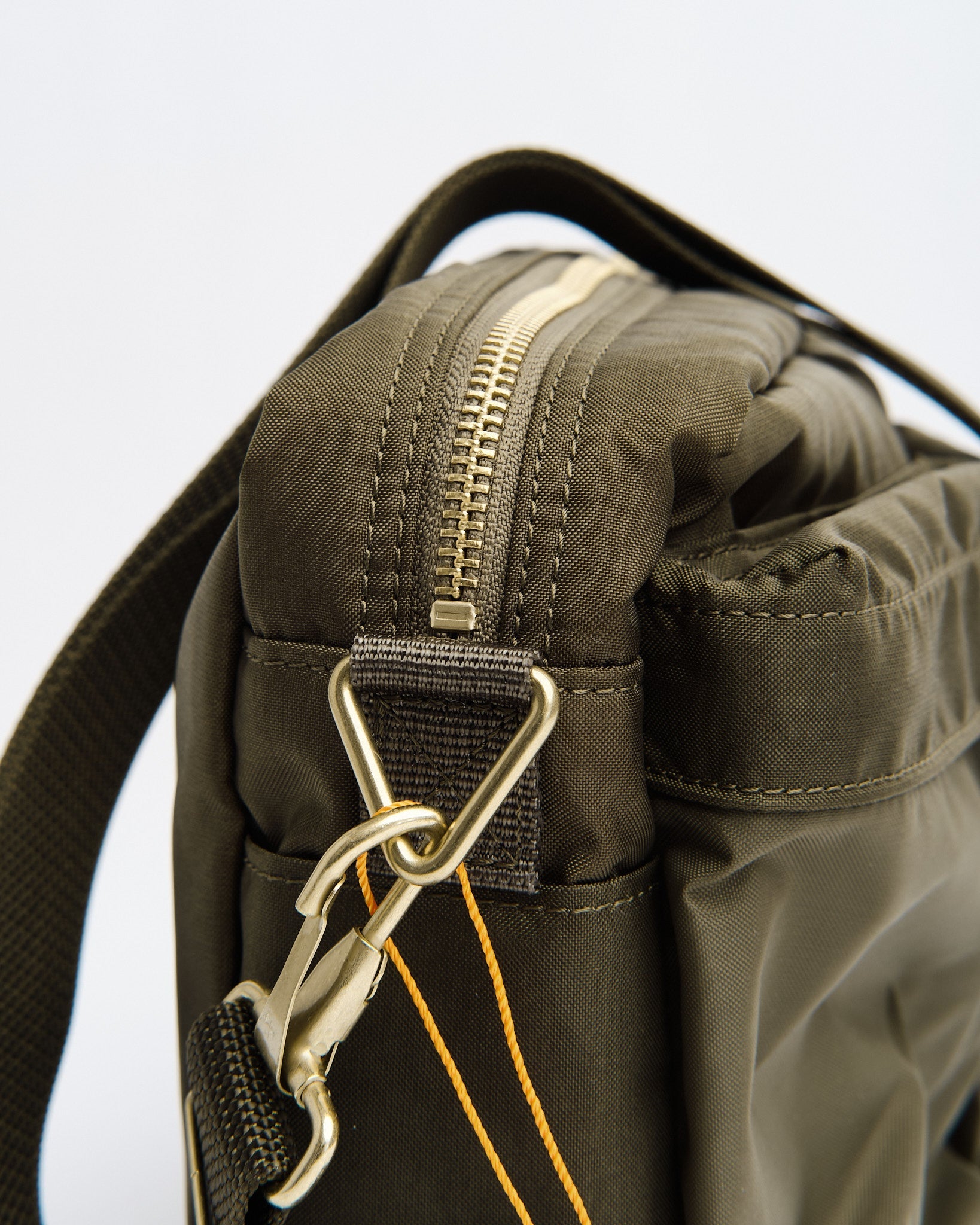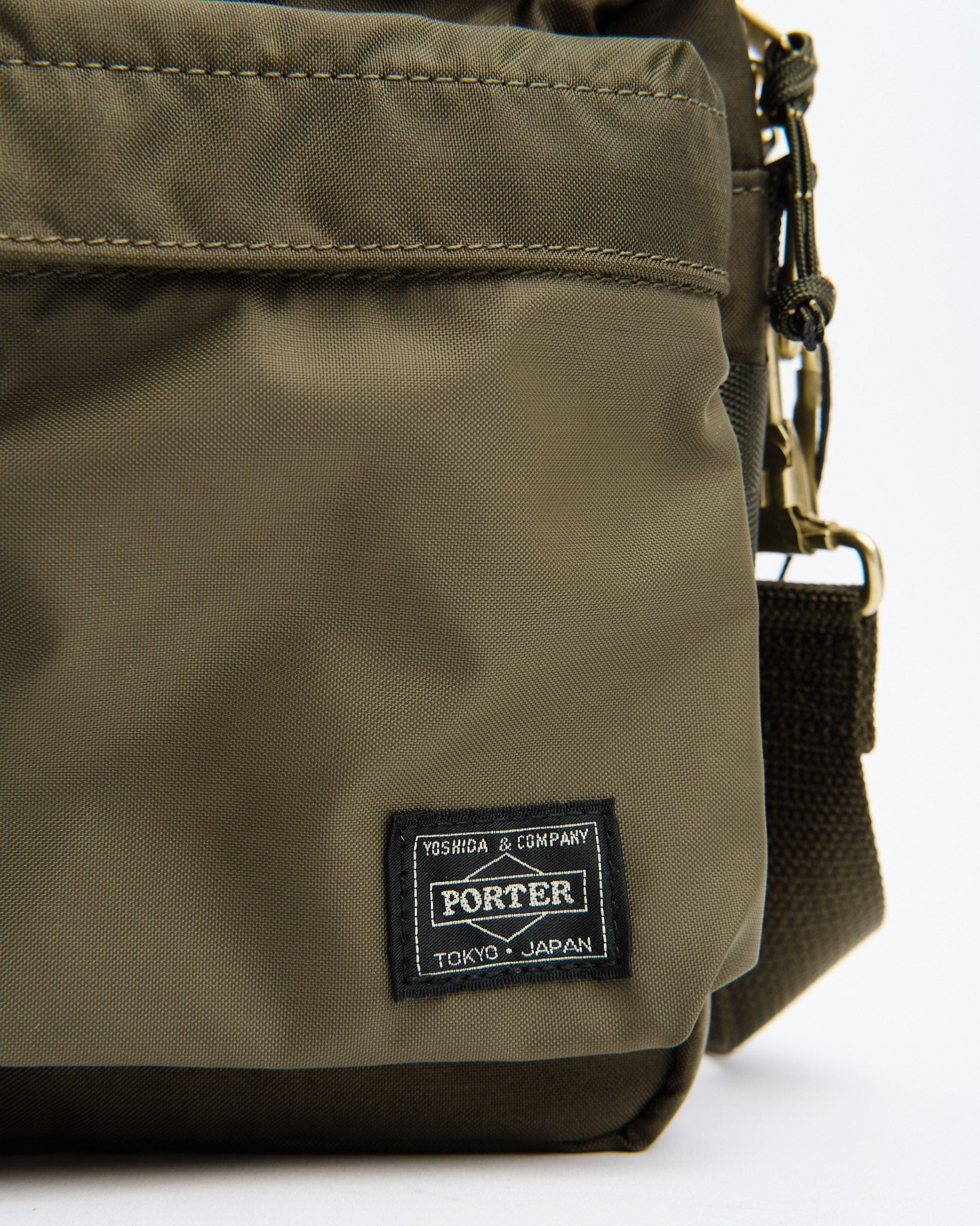 PORTER BY YOSHIDA Force Shoulder Bag (S) on osa PORTER FORCE -sarjaa, joka saa inspiraationsa sotilasesteettisyydestä ja sotilastuotteiden satunnaisista värierovaisuuksista. Tämän suunnittelun erottuva piirre on hienovarainen väriero etutaskun ja laukun pääosan kankaan välillä, antaen vaikutelman eri kangaserien käytöstä. Tämä sarja juhlistaa näitä epäsäännöllisiä värimaailmoja, joita usein löytyy sotilasvaatteista ja -varusteista.