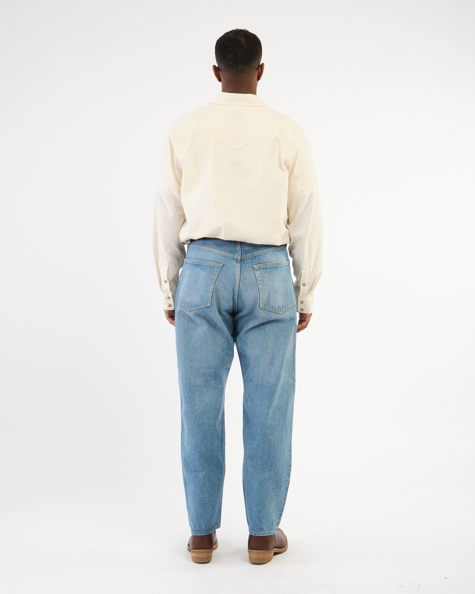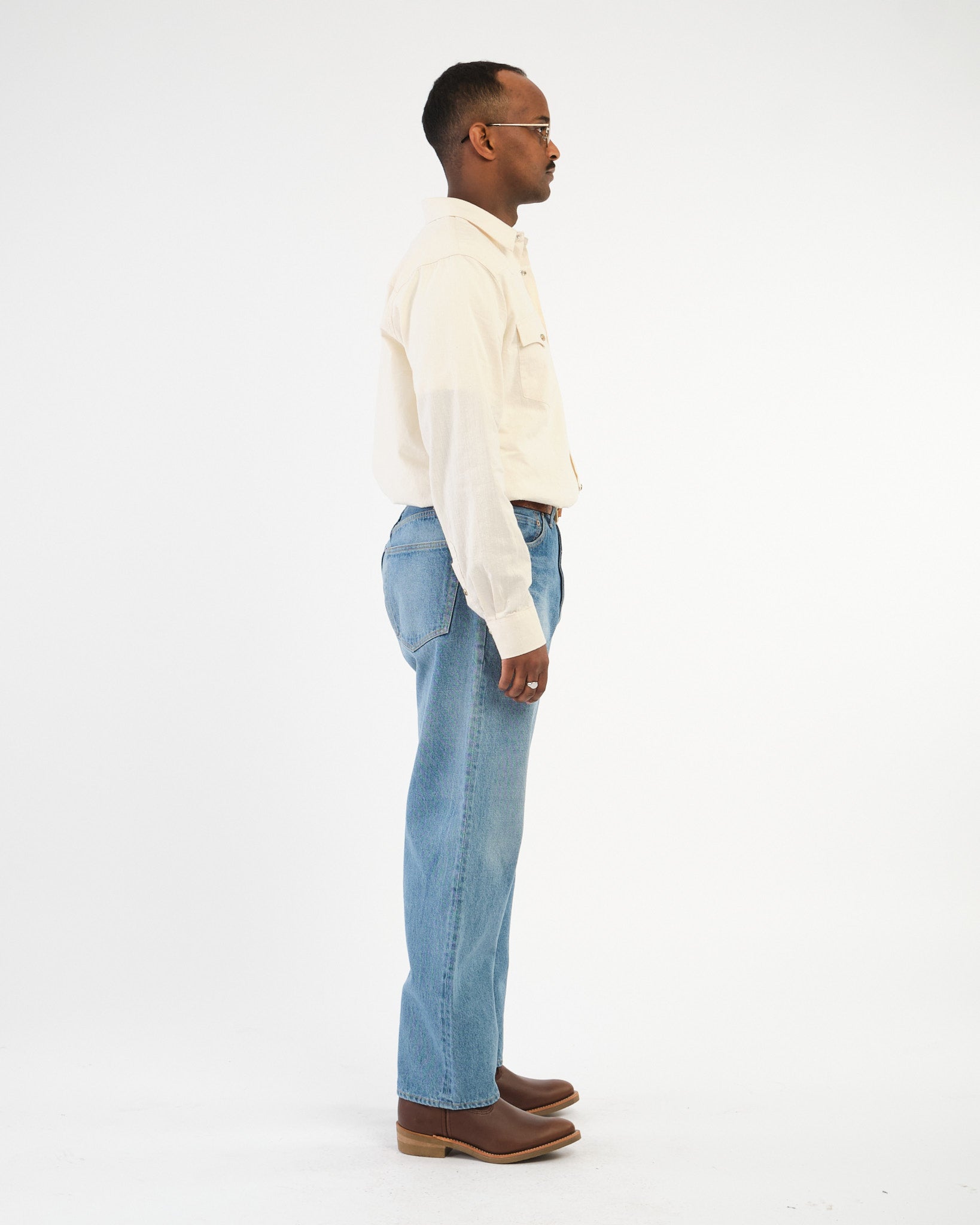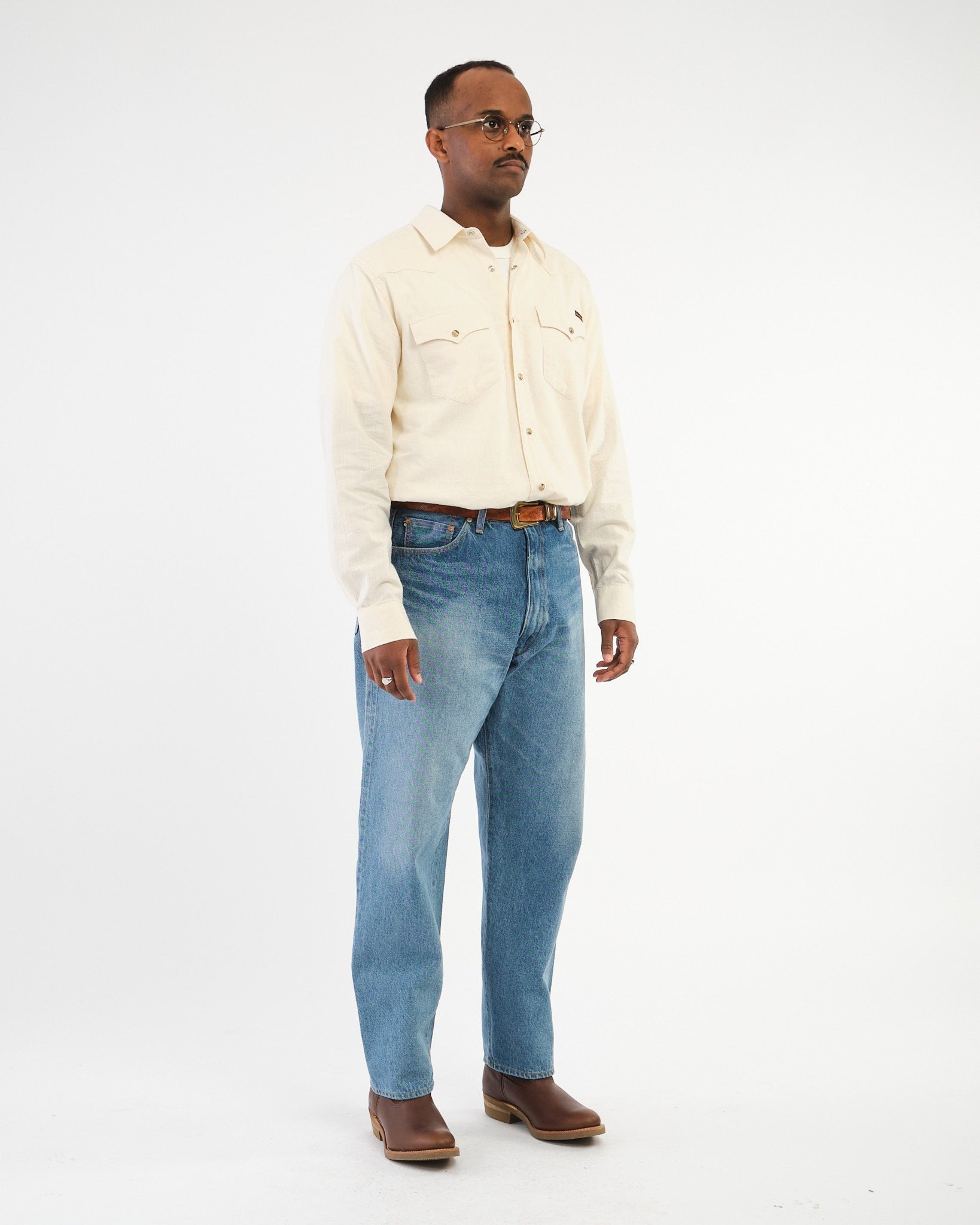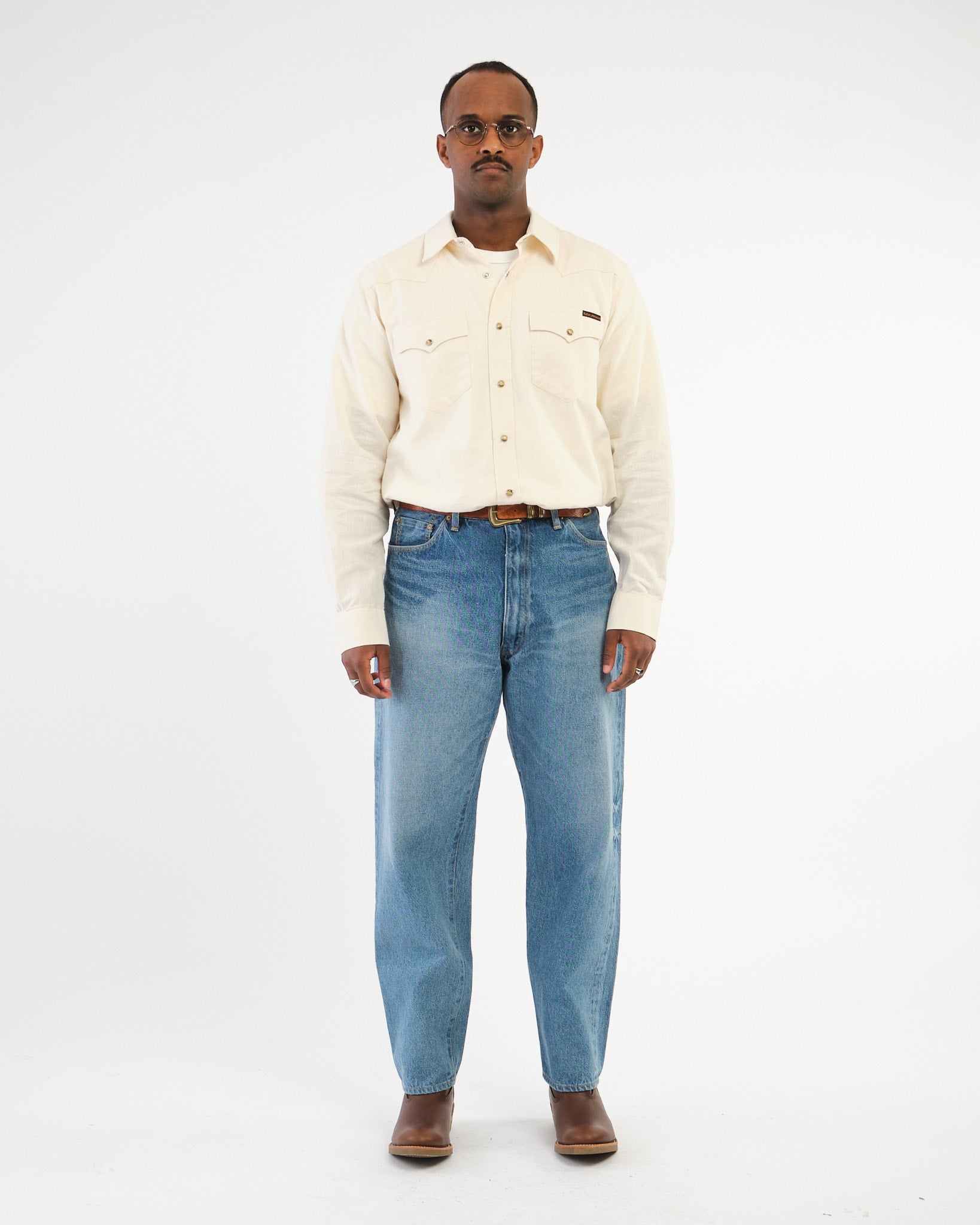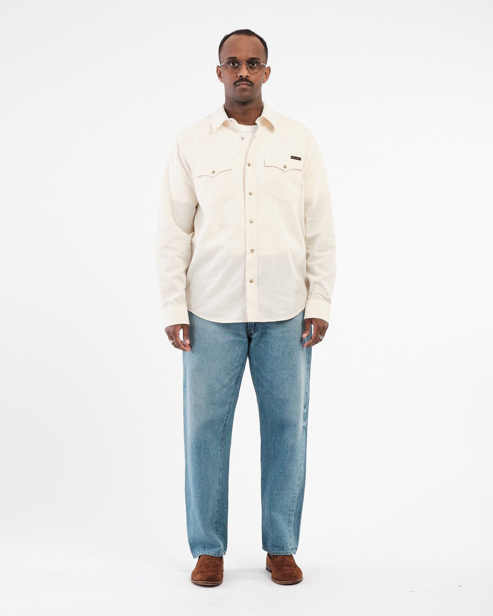 Sano howdy George Chambray Western -paidalle värissä Ecru – paita, jossa on ripaus cowboy-asennetta ja paljon ekotietoista charmia. Kudottu 100% luomupuuvillasta, tämä neppy-kangas on raaka ja tekstuuriltaan persoonallinen, mikä antaa sille hienovaraista visuaalista luonnetta. Yksityiskohdissa on kaikki: terävät Western-tyyliset yokerit edessä ja takana, tekomargariinipäällysteiset nepparit ja logoetiketti, joka kertoo sinun tuntevan Nudiesi. Regular-mitoitus pitää asiat rennoina, kun taas kaareva helma ja kahden napin kalvosimet lisäävät hienostunutta viimeistelyä. Valmistettu Turkissa ja ommeltu sitoumuksella reiluun palkkaan, tämä paita on yhtä vastuullinen kuin se on rosoinen.