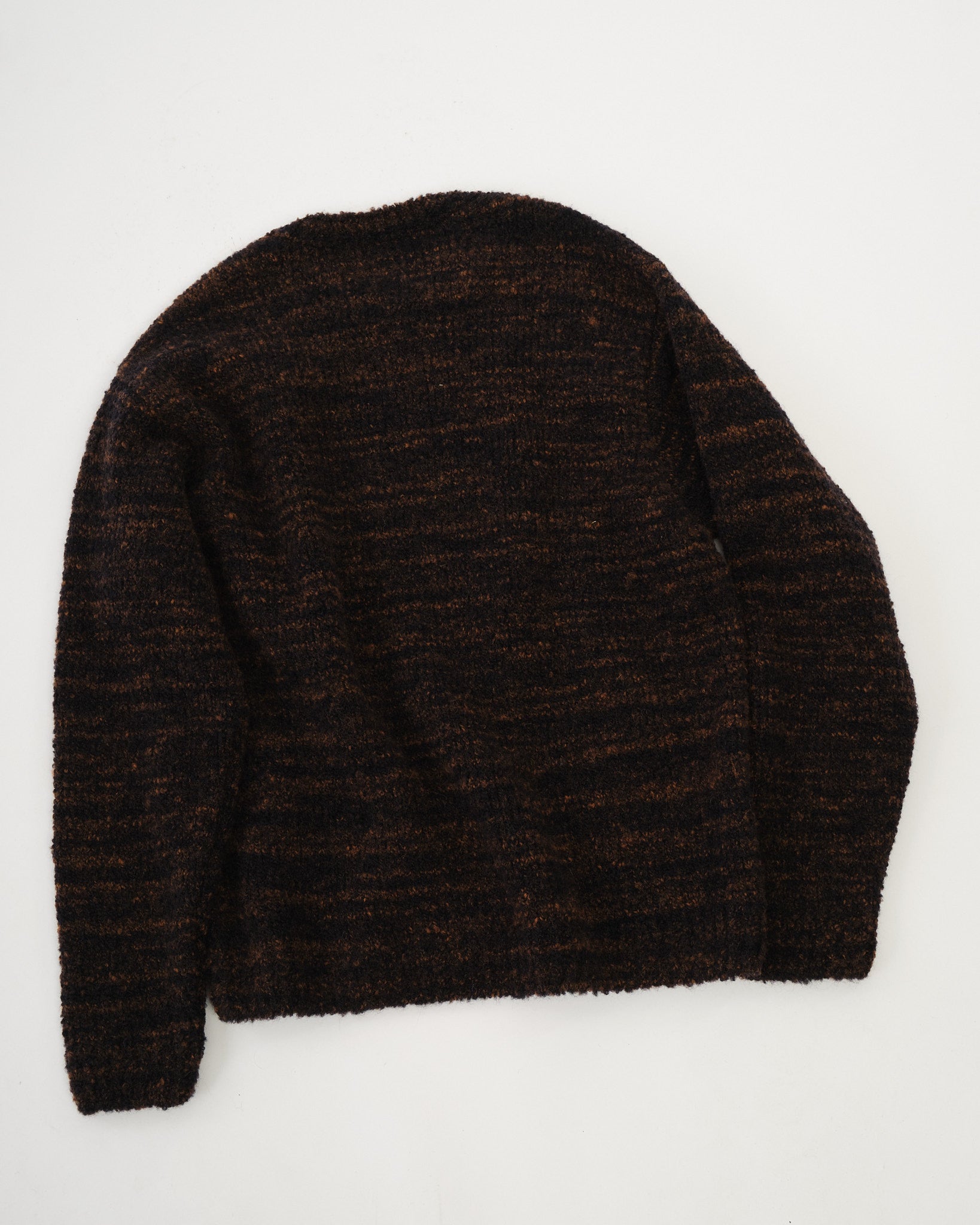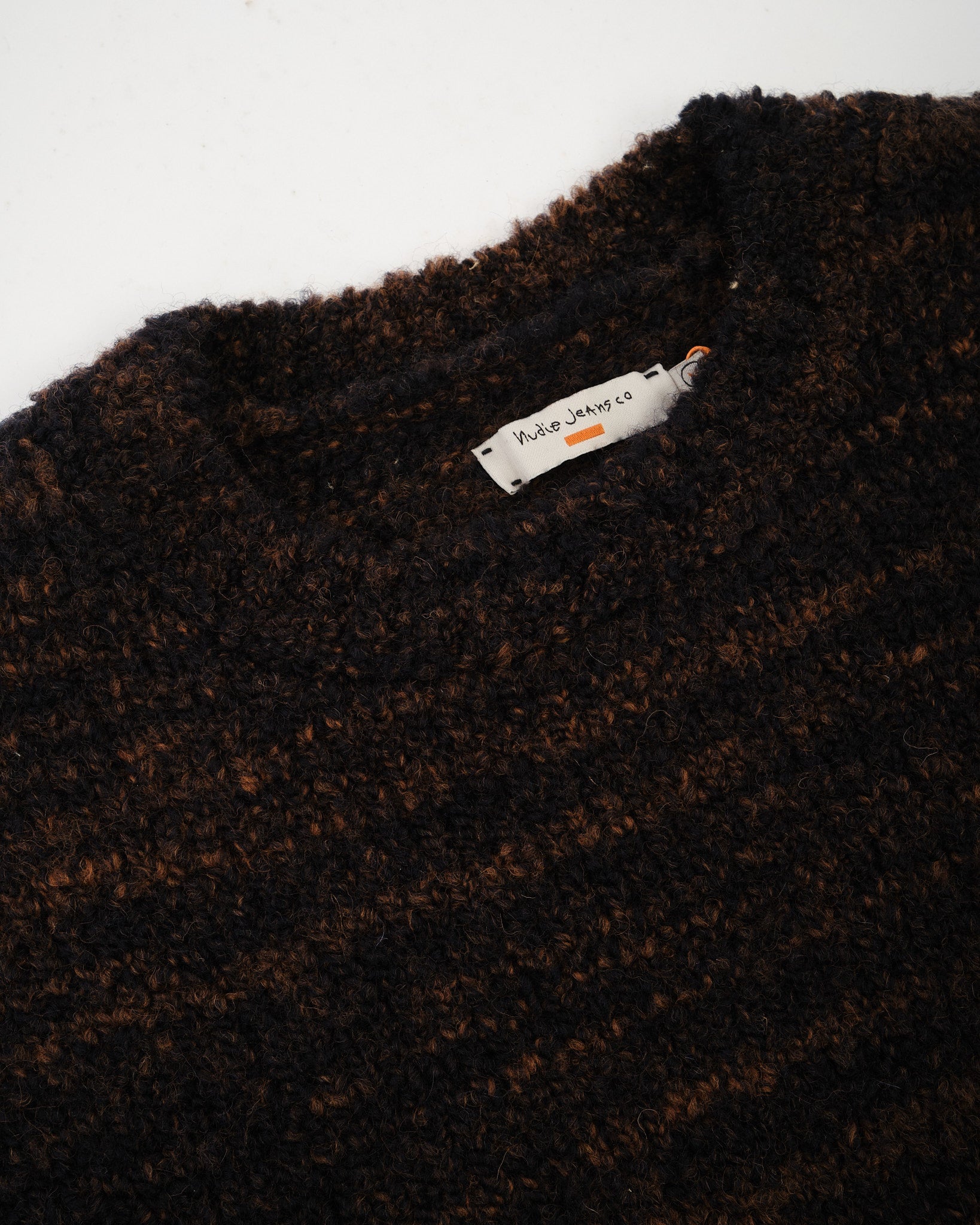 NUDIE JEANS CO. GURRA BOUCLE -NEULEPAITA NAVY/ORANSSI on kevyt miehistönkauluksinen neulepaita, jolla on ainutlaatuinen teksturoitu, villainen neulos. Valmistettu käyttäen epäsäännöllistä, nukkaista lankaa, se yhdistää syvän laivastonsinisen ruosteenoranssiin, luoden rikkaan täplikäs bouclé-efektin, joka lisää syvyyttä ja luonnetta kankaaseen.