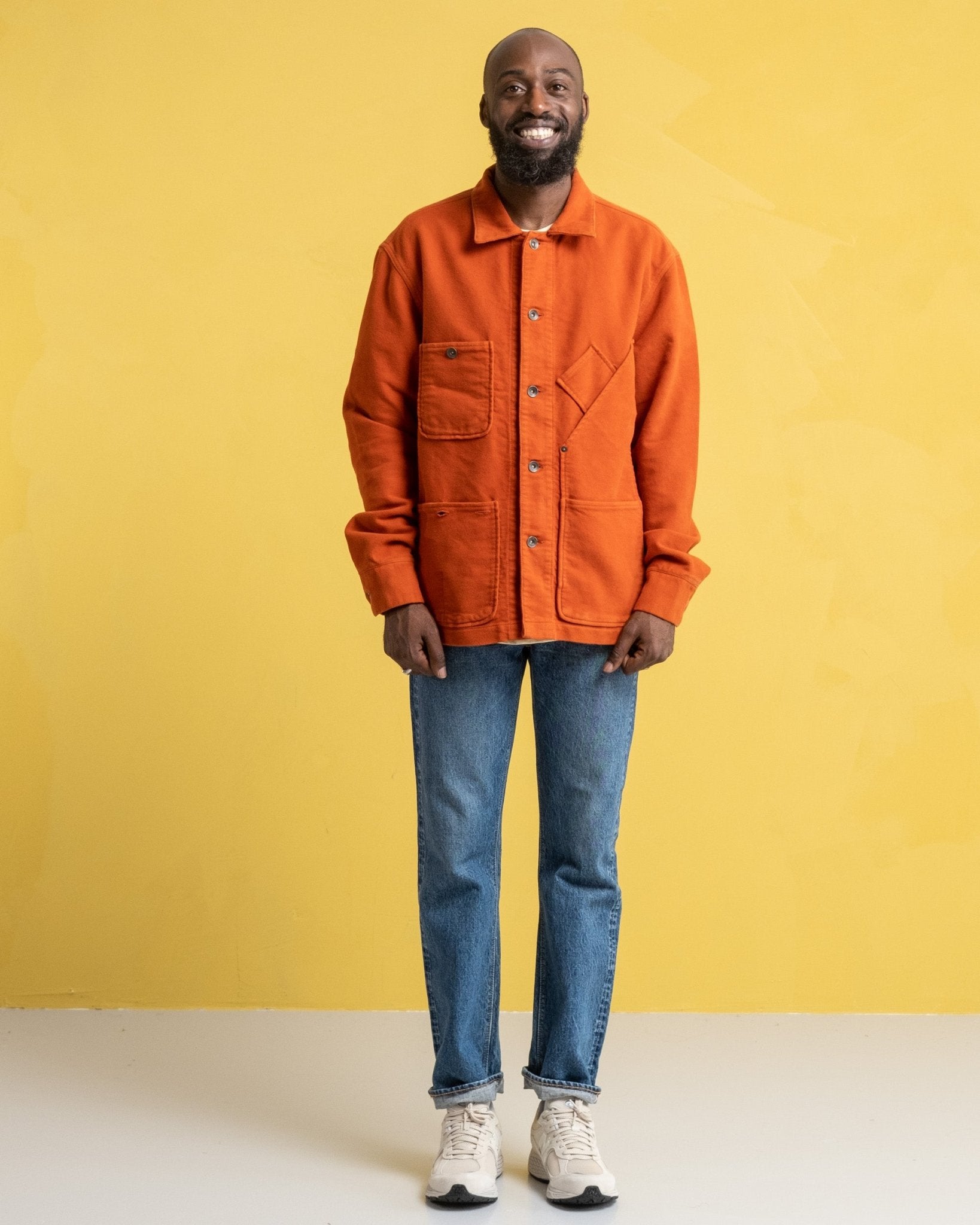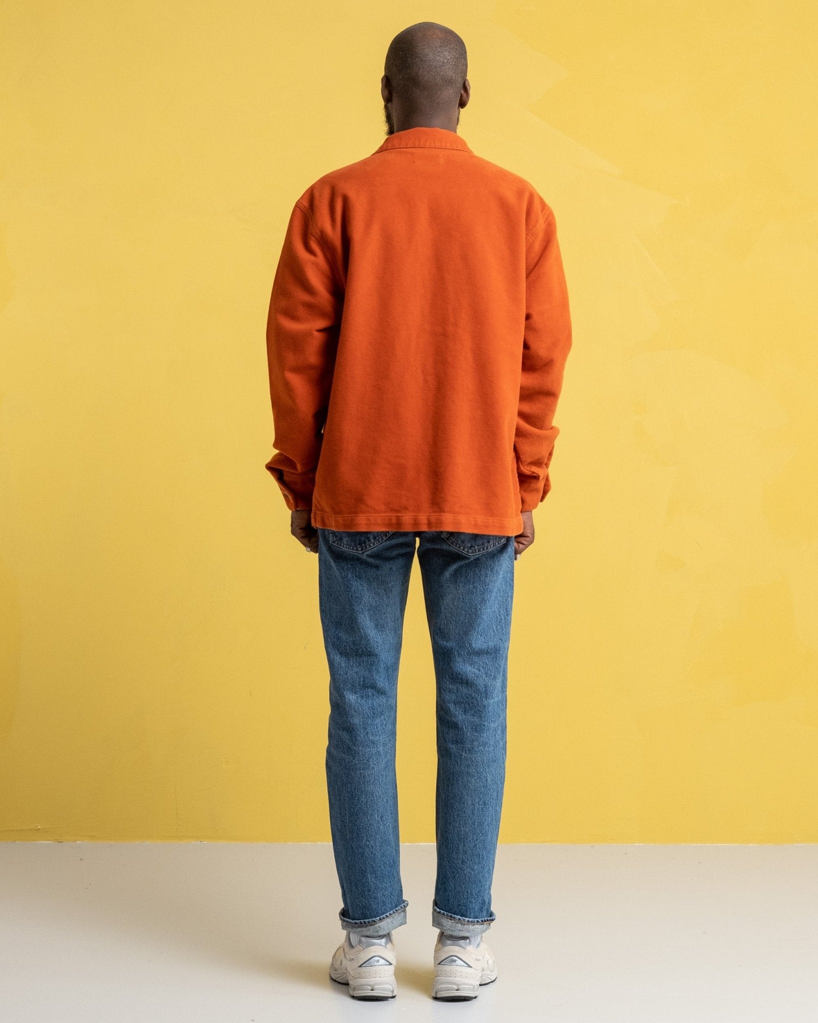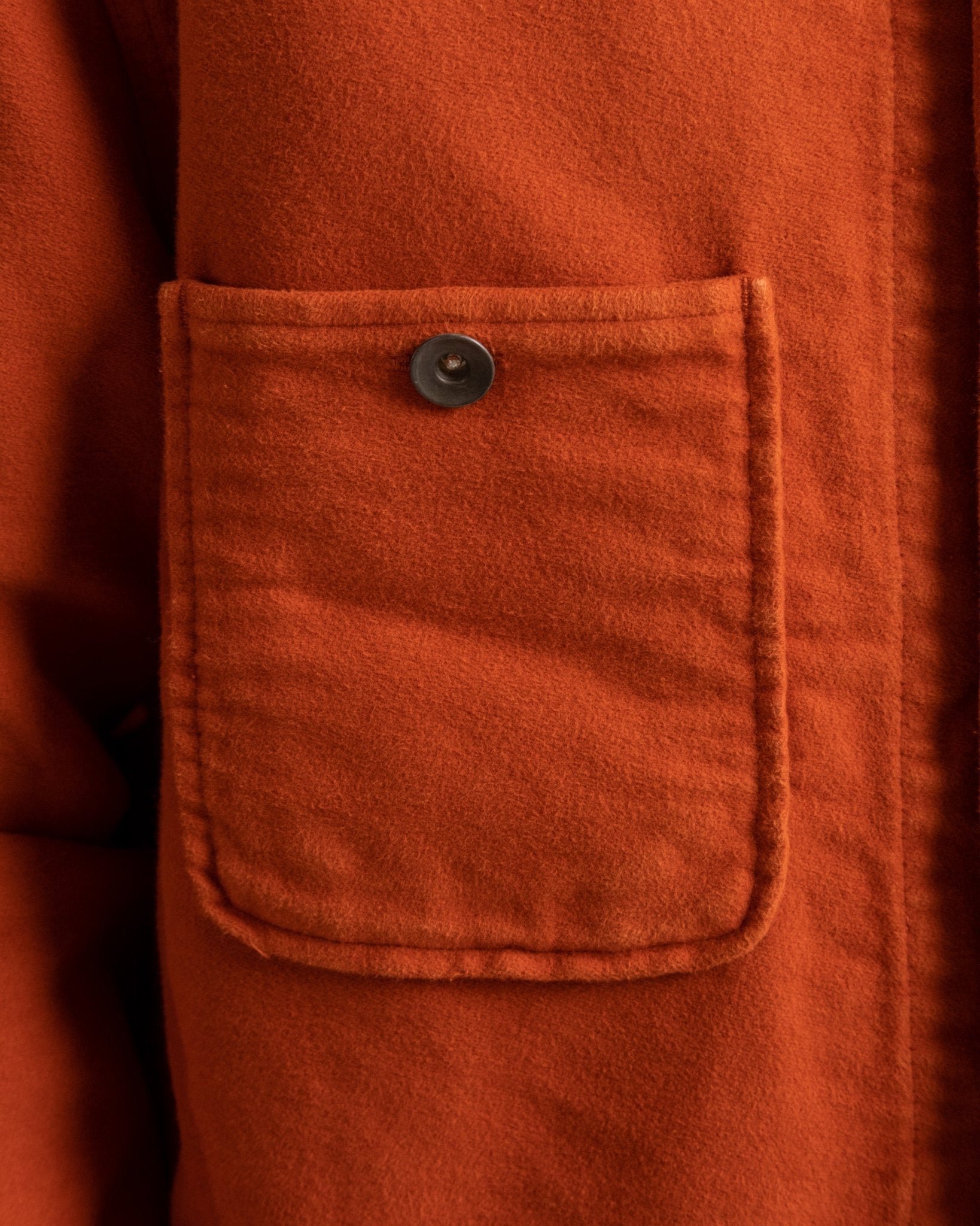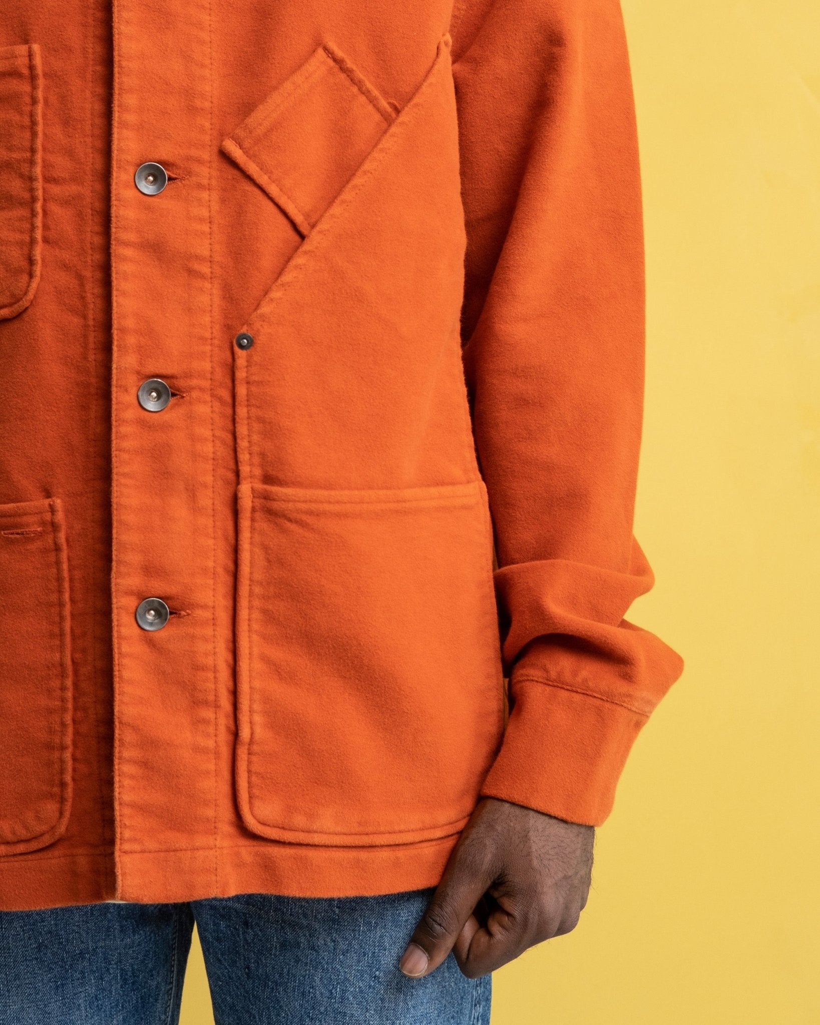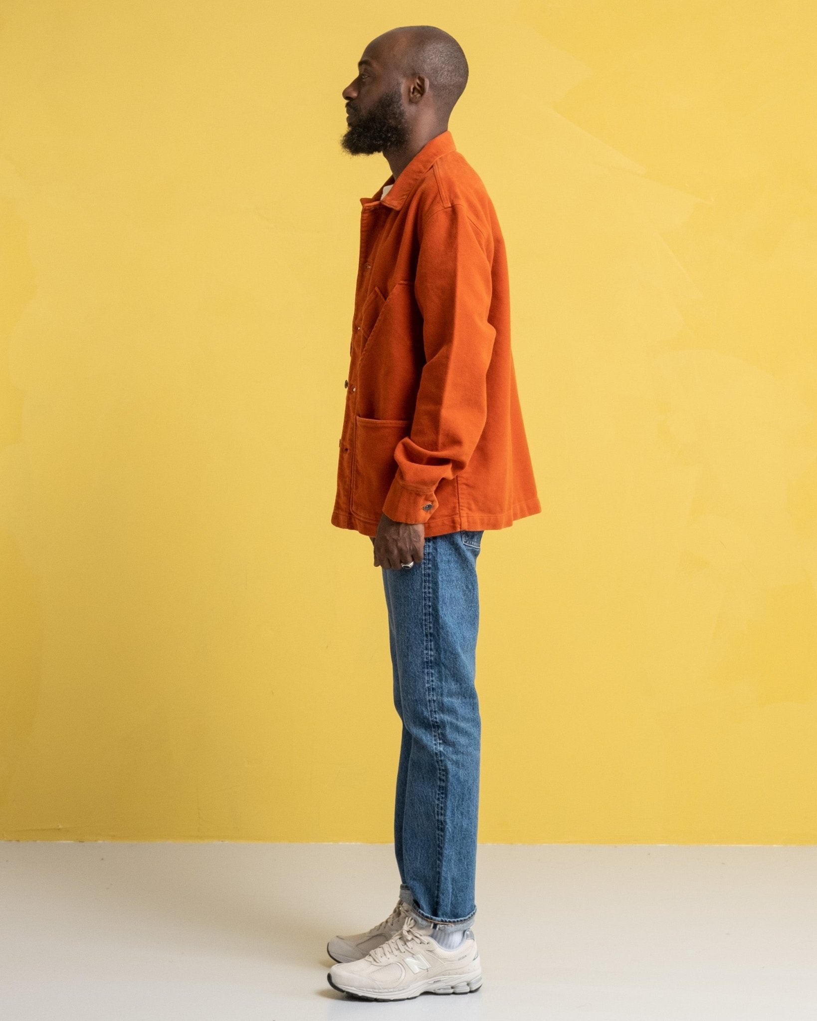 Coverall Jacket International Orange -takki Tellasonilta, valmistettu miellyttävästä 13,5 oz amerikkalaisesta molskiinista, ommeltu San Franciscossa. Neljä suurta ulkotaskua ja silmälasitasku edessä sekä yksi sisätasku. Paranee ja näyttää paremmalta mitä enemmän sitä käyttää. Metallinapit edessä ja hihansuissa. Värjätty vaate. Valmistettu USA:ssa.