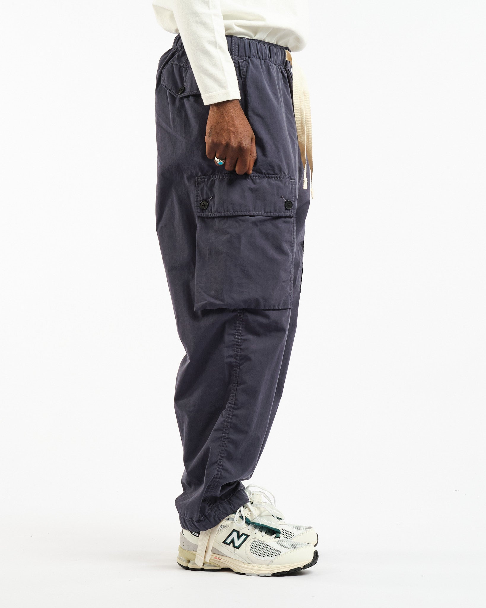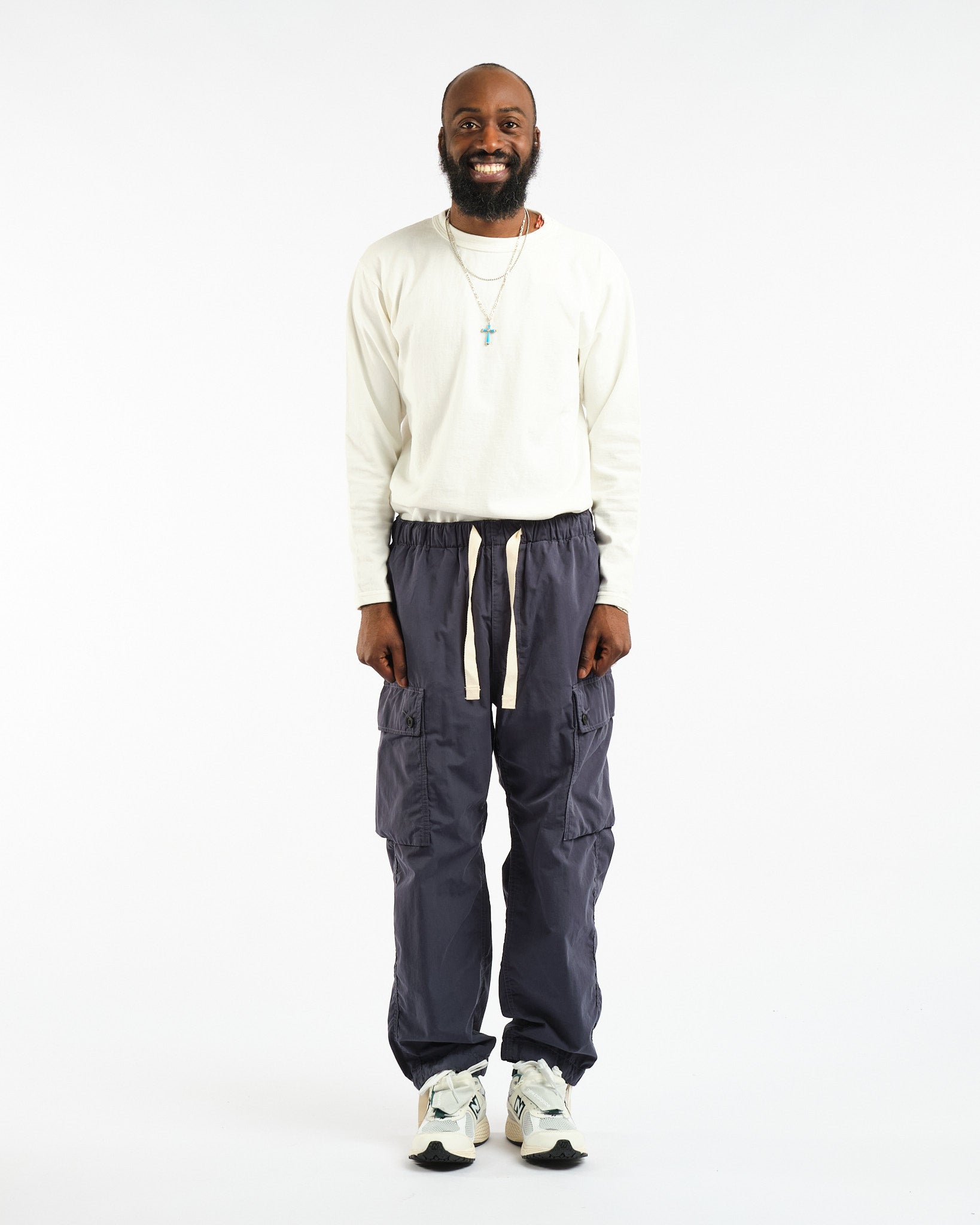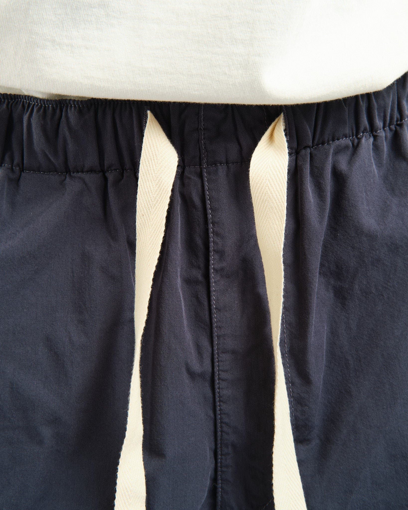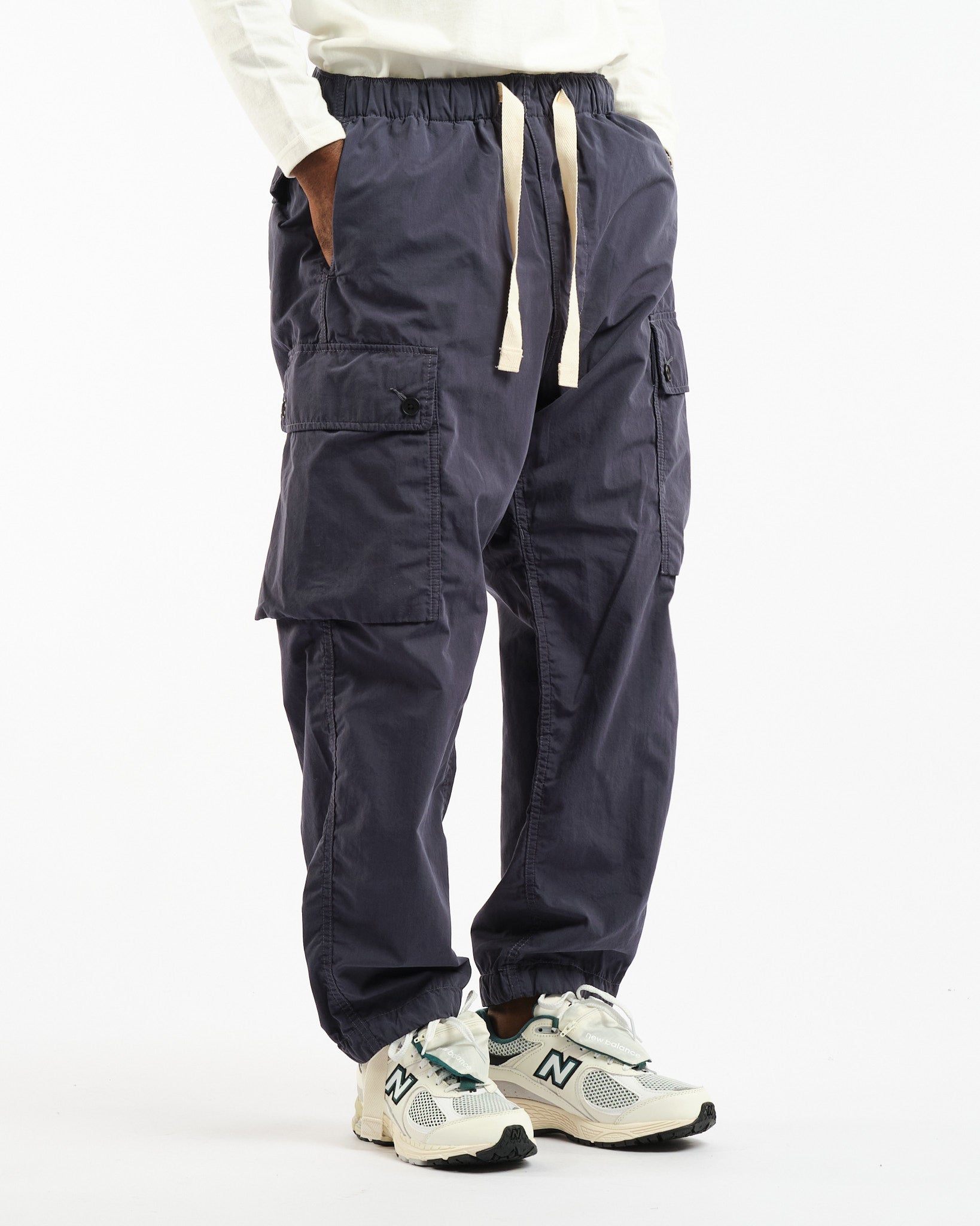Valmistaudu mihin tahansa seikkailuun Nanamican Easy Cargo -housuilla värissä Marine Navy. Nämä housut on valmistettu broadcloth-kankaasta, jossa on peittävä ydinsäie, jossa polyesteriydin on kääritty puuvillan ympärille lisäämään kestävyyttä. Pestu viimeistely antaa housuille tyylikkään ilmeen, ja luonnollisen värinen puhdistamaton kangas, jota on käytetty lantion vuorauksessa, lisää kokonaisuuden mukavuutta. Taskujen suunnittelu perustuu 50-luvun sotilascargo-housuihin, ja leveästi kapeneva siluetti on väljä lantiolta ja kapenee kohti lahjetta. Napit ovat luonnollisia orgaanisia pähkinänappeja, ja tukinapit ovat simpukkanappeja, joissa on merellinen tuntu. Koon säädettävän vyötärön ja lahkeiden ansiosta nämä housut ovat täydelliset mihin tahansa seikkailuun.