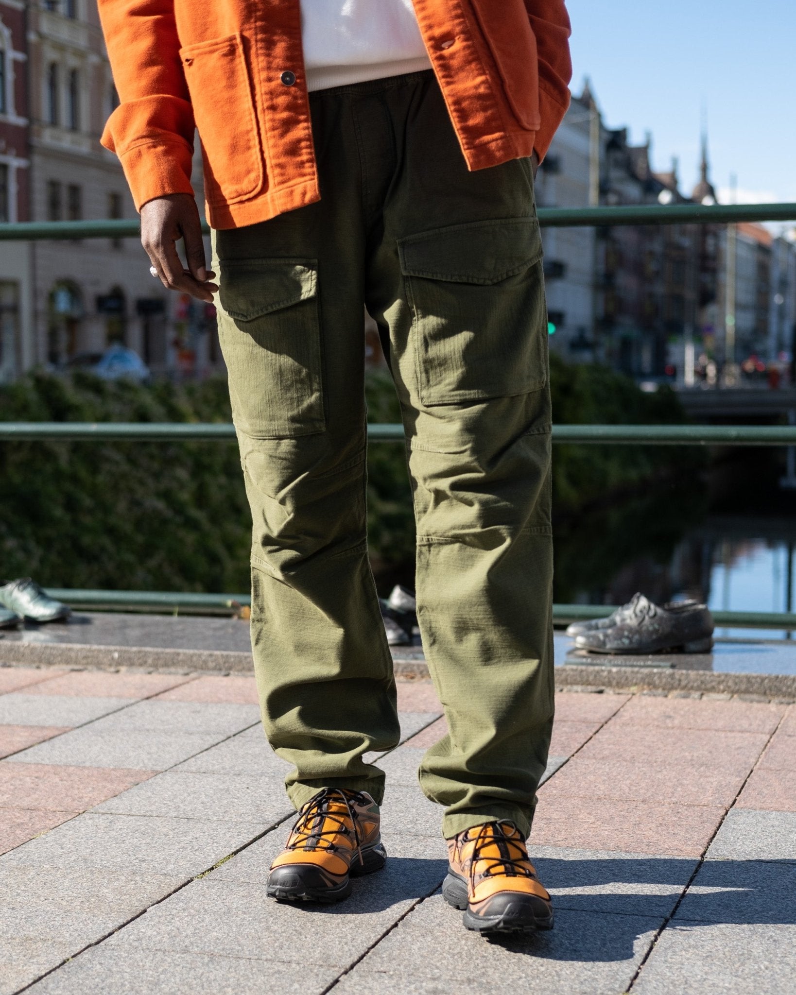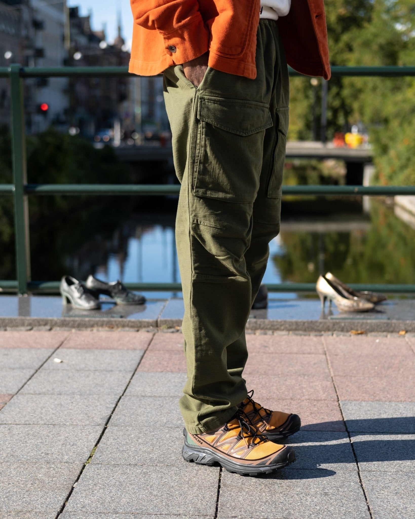 Easy Pant Sateen Olive Tellasonilta on rento kapeneva malli, joka on valmistettu 100% puuvillasatiinista. Siinä on kaksi tavallista sivutaskua ja kaksi reisitaskua nepparikiinnityksellä. Siinä on myös kiristysnauhalla kiristettävä joustava vyötärönauha ja vahvistettu haara-alue paremman kestävyyden varmistamiseksi. Valmistettu Italiassa.