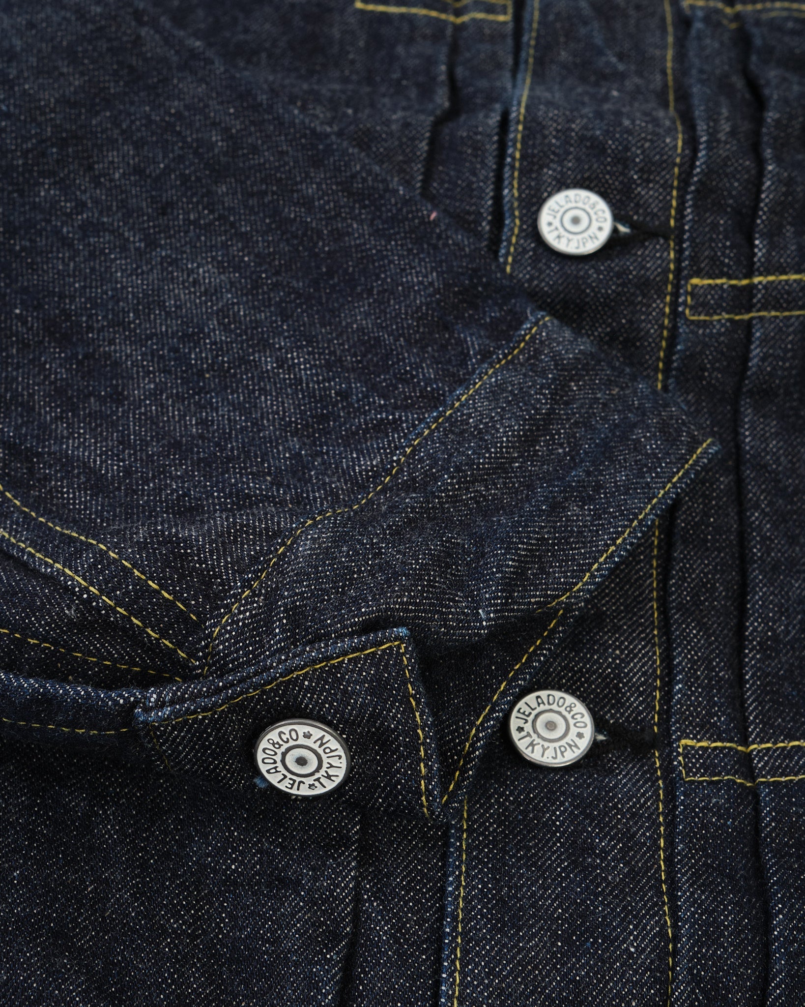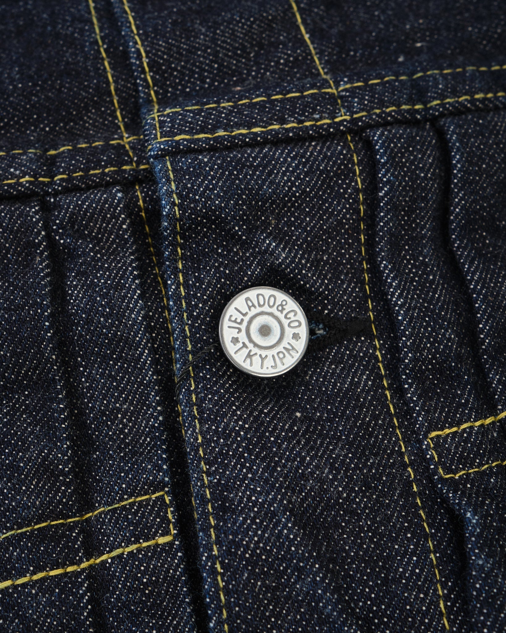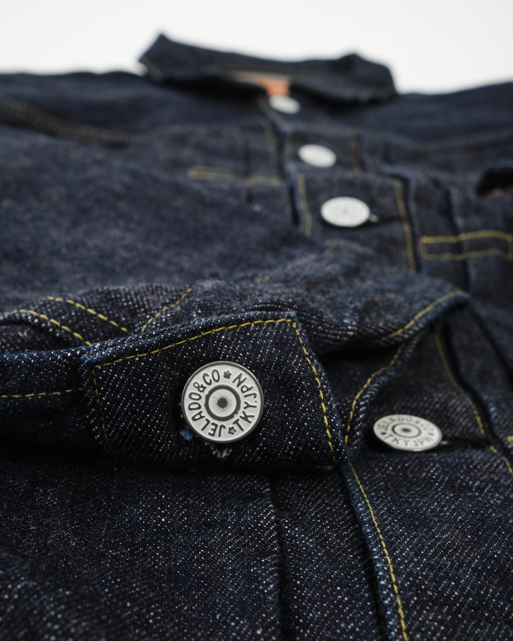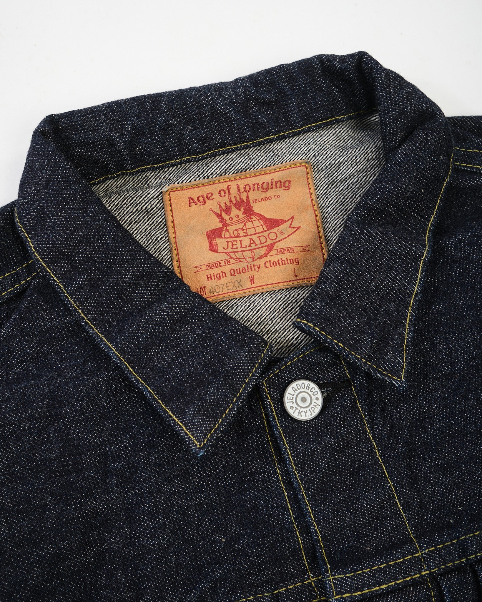 JP94407E 407EXX Denim Jacket on JELADOn ensimmäinen 1. tyyppinen farkkutakki, joka on valmistettu LASTRESORT BLACK TAG -denimistä saavuttamaan vielä villimpi ja vintage-tyyppisempi tunne. Tämä 15oz reunavahvistettu kangas analysoitiin huolellisesti ja rakennettiin uudelleen DEADSTOCK XX -denimistä, tarjoten ainutlaatuisen näkökulman alkuaikojen denim-käsityöhön.