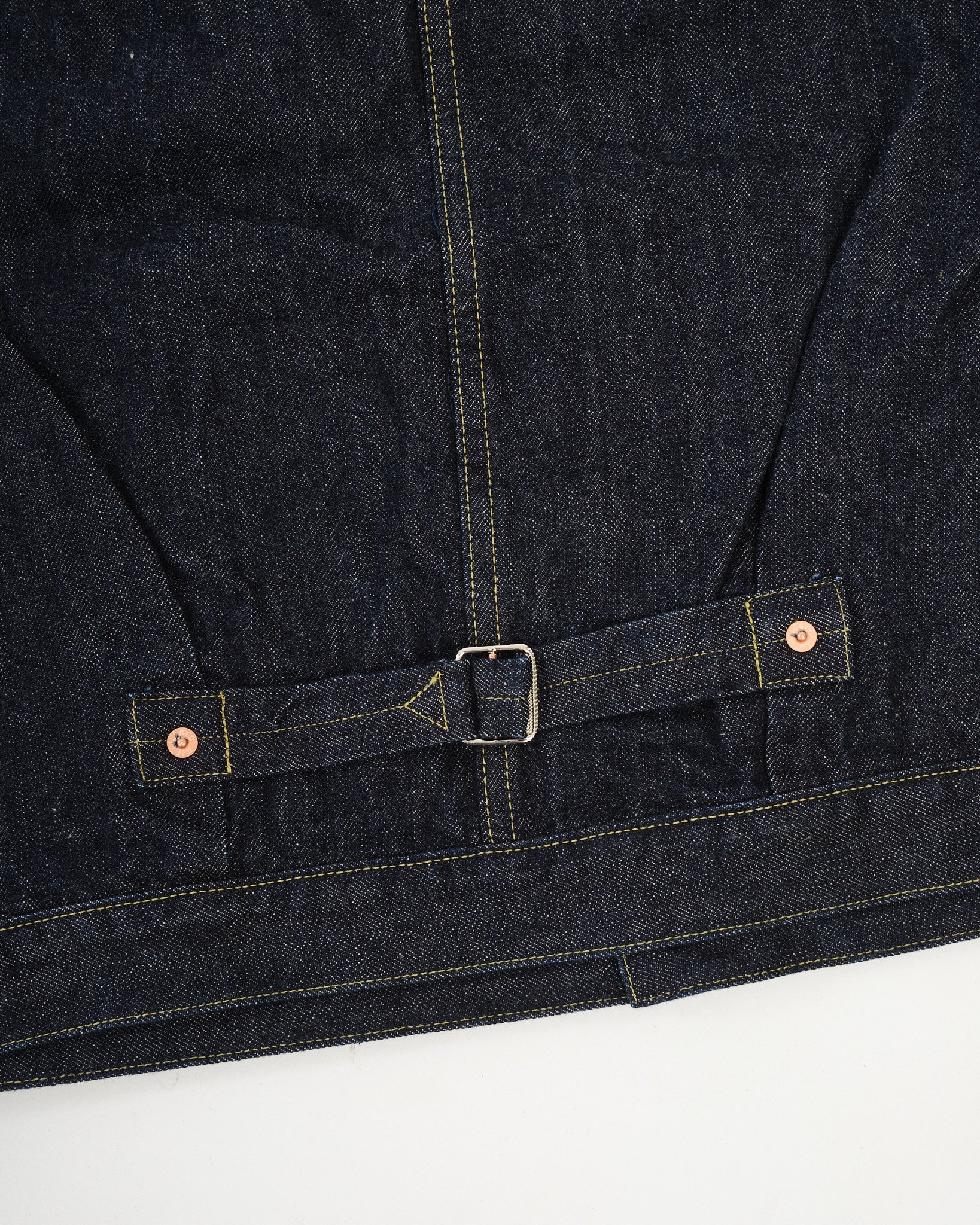 Suunniteltu vintage-tarkkuus mielessä, rullatut saumat käyttävät #20 lankaa, kun taas pääsaumat on ommeltu #30 langalla. Aitoja viimeistelyjä, kuten hevosennahkainen laikku, yksipuoleinen kirjailtu rayon-välilehti, pinnoitetut rautanapit ja kupariniitit, korostavat sen ajatonta luonnetta. Koot L ja sitä suuremmat sisältävät T-selkäsuunnittelun kankaan leveyden rajoitusten vuoksi, pysyen uskollisena historiallisille tuotantomenetelmille.
