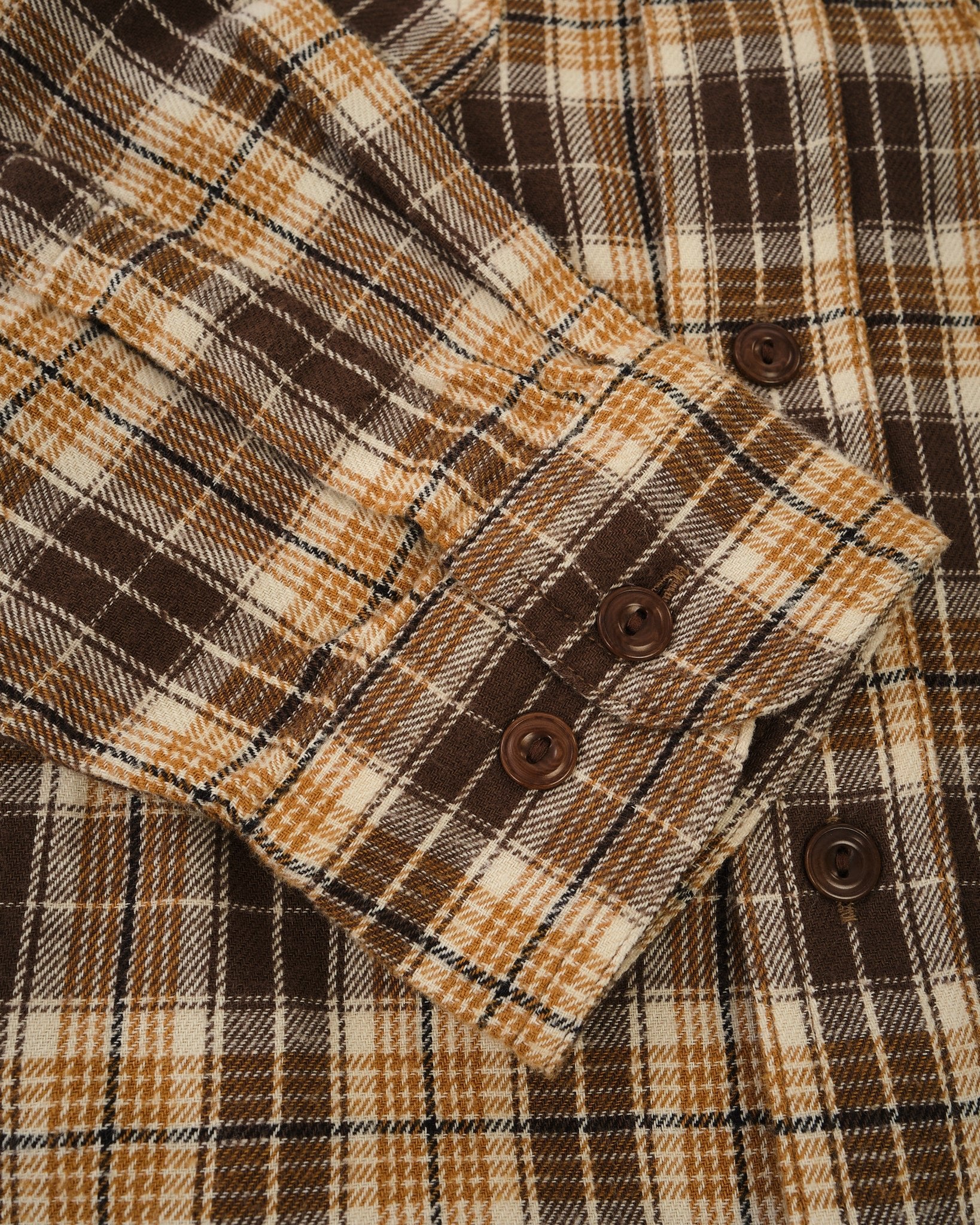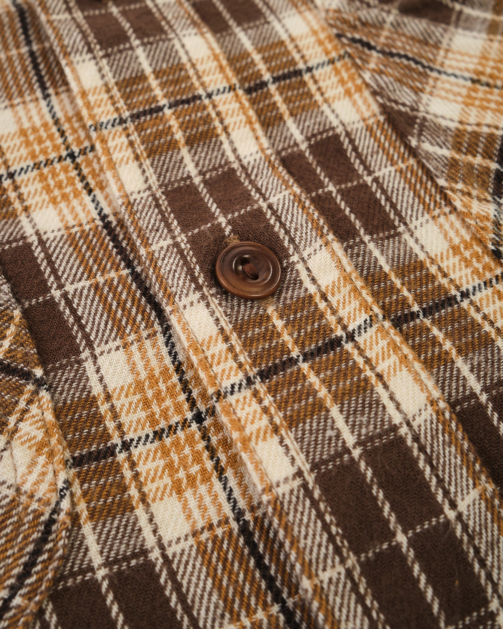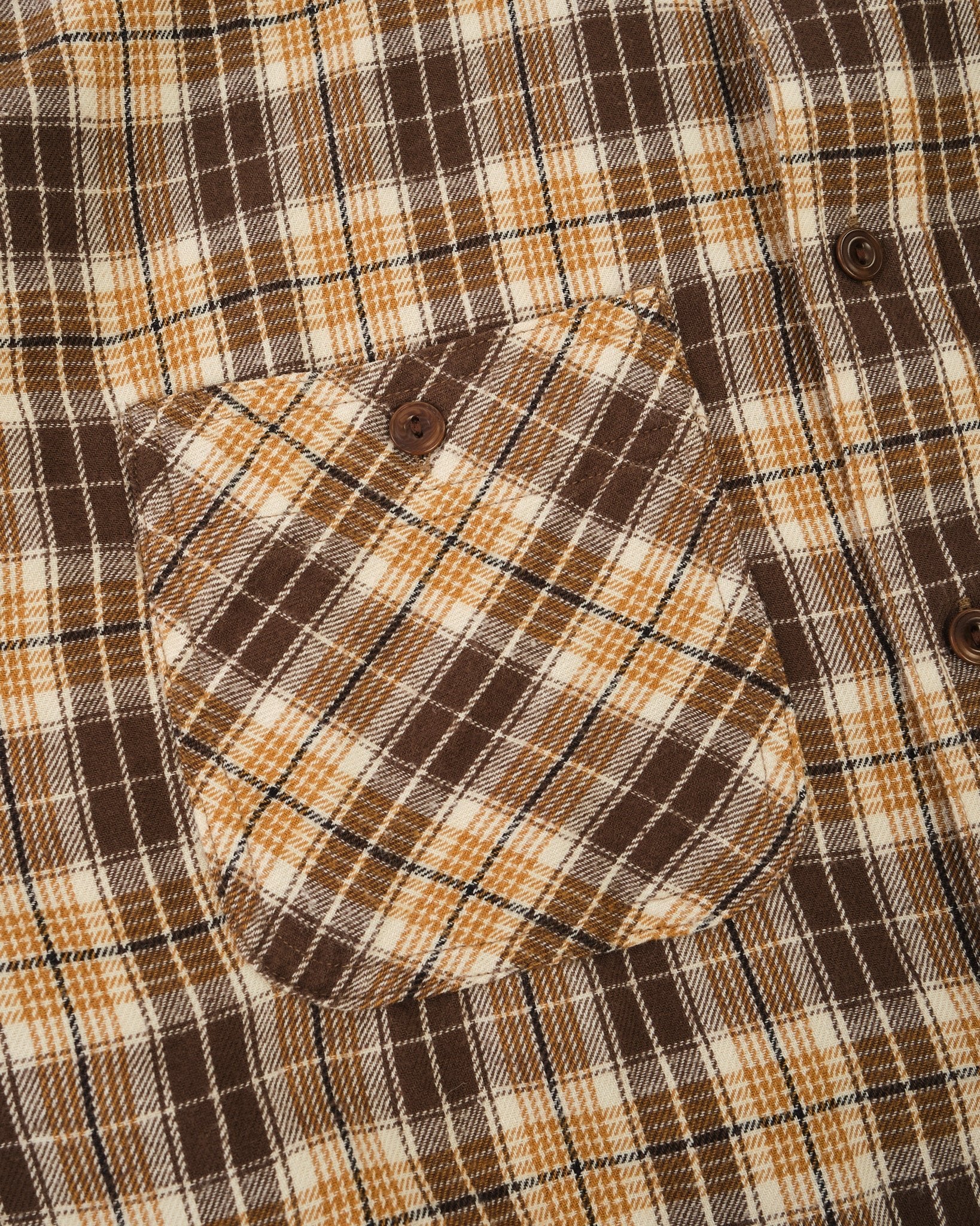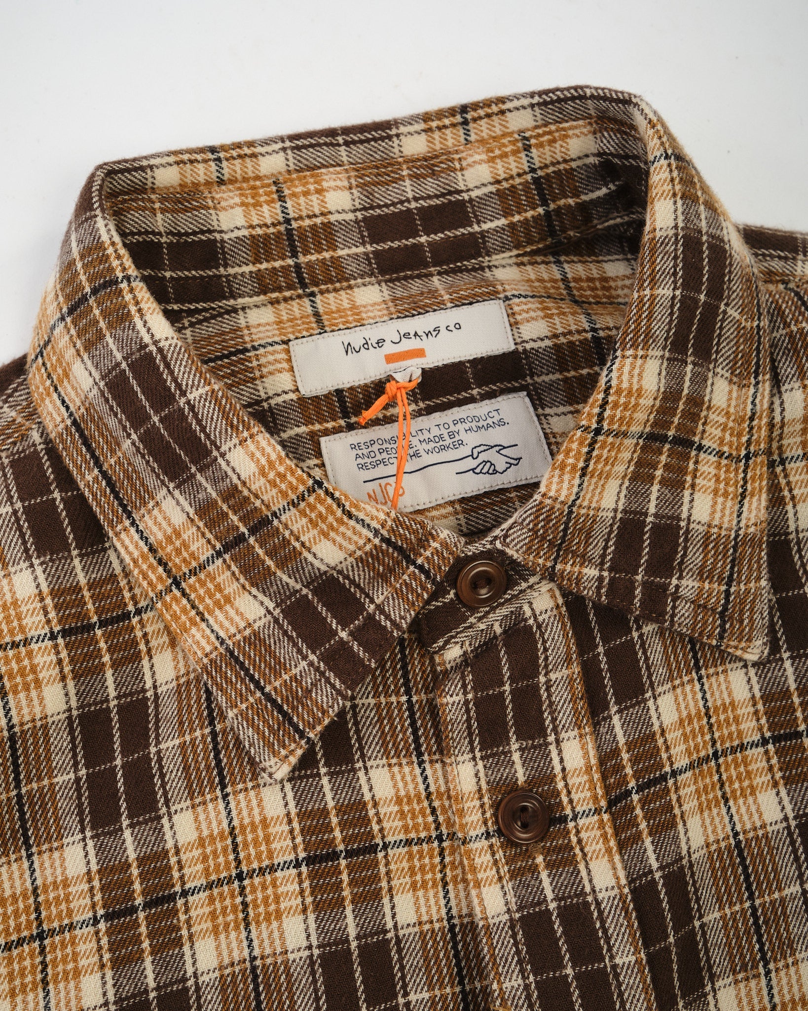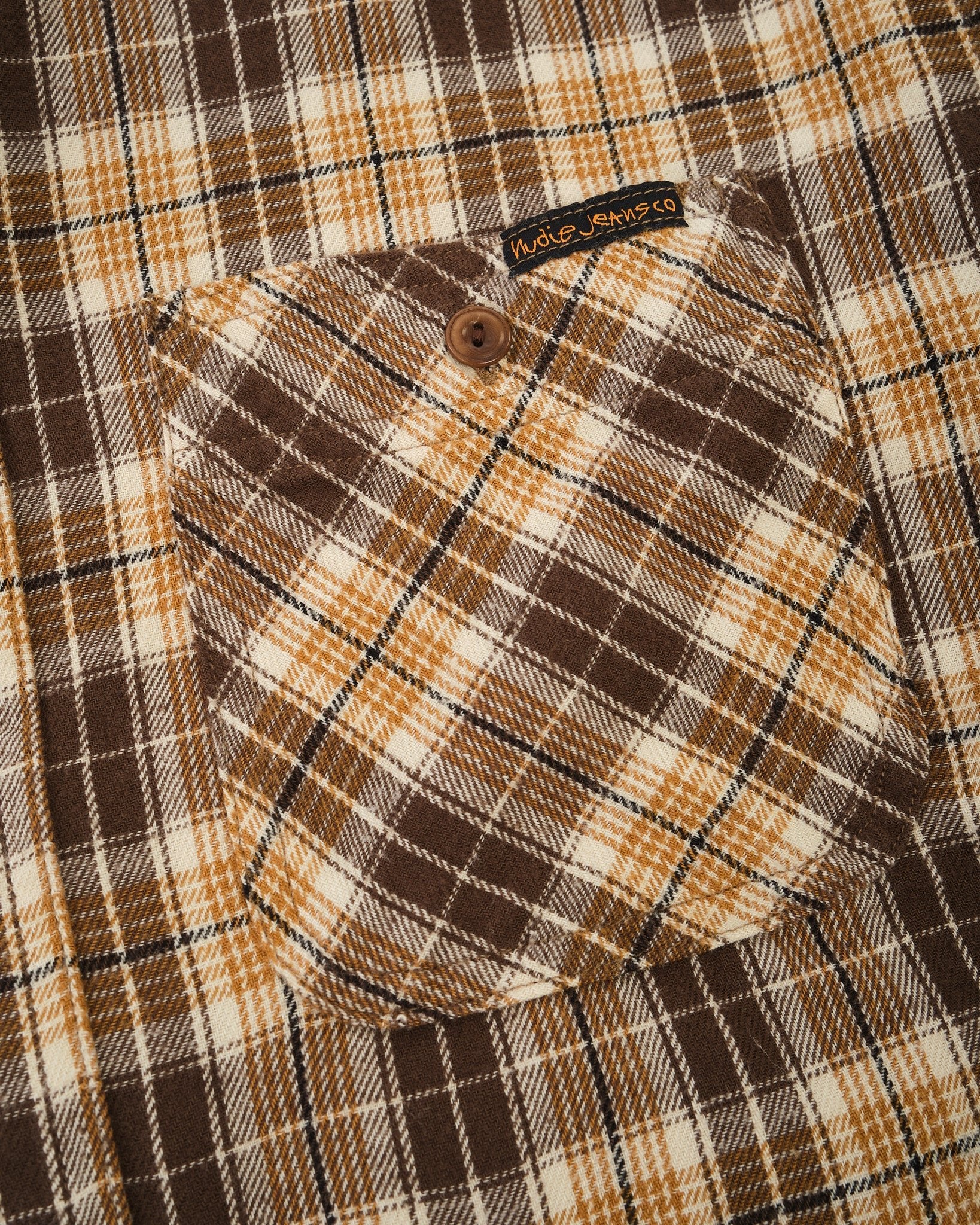 Julian Worker -paita ruutukuosissa ruskeana on Nudien näkemys karusta käytännöllisyydestä, pehmennettynä laadukkaalla kangassekoituksella. Valmistettu luomupuuvillasta ja Euroopan Pellavayhdistyksen sertifioidusta pellavasta, se tarjoaa täydellisen tasapainon hengittävän mukavuuden ja rakenteellisen tuntuman välillä. Ruutukuosi lisää vanhan työvaatteen viehätystä, kun taas korozonapit antavat sille hienostuneen viimeistelyn. Säännöllisellä istuvuudella ja ajattomalla tyylillä Julian on luotettava kerrospukeutumisen kappale, joka on rakennettu sekä arkipäivän tehtäviin että viikonlopun rentoutumiseen.