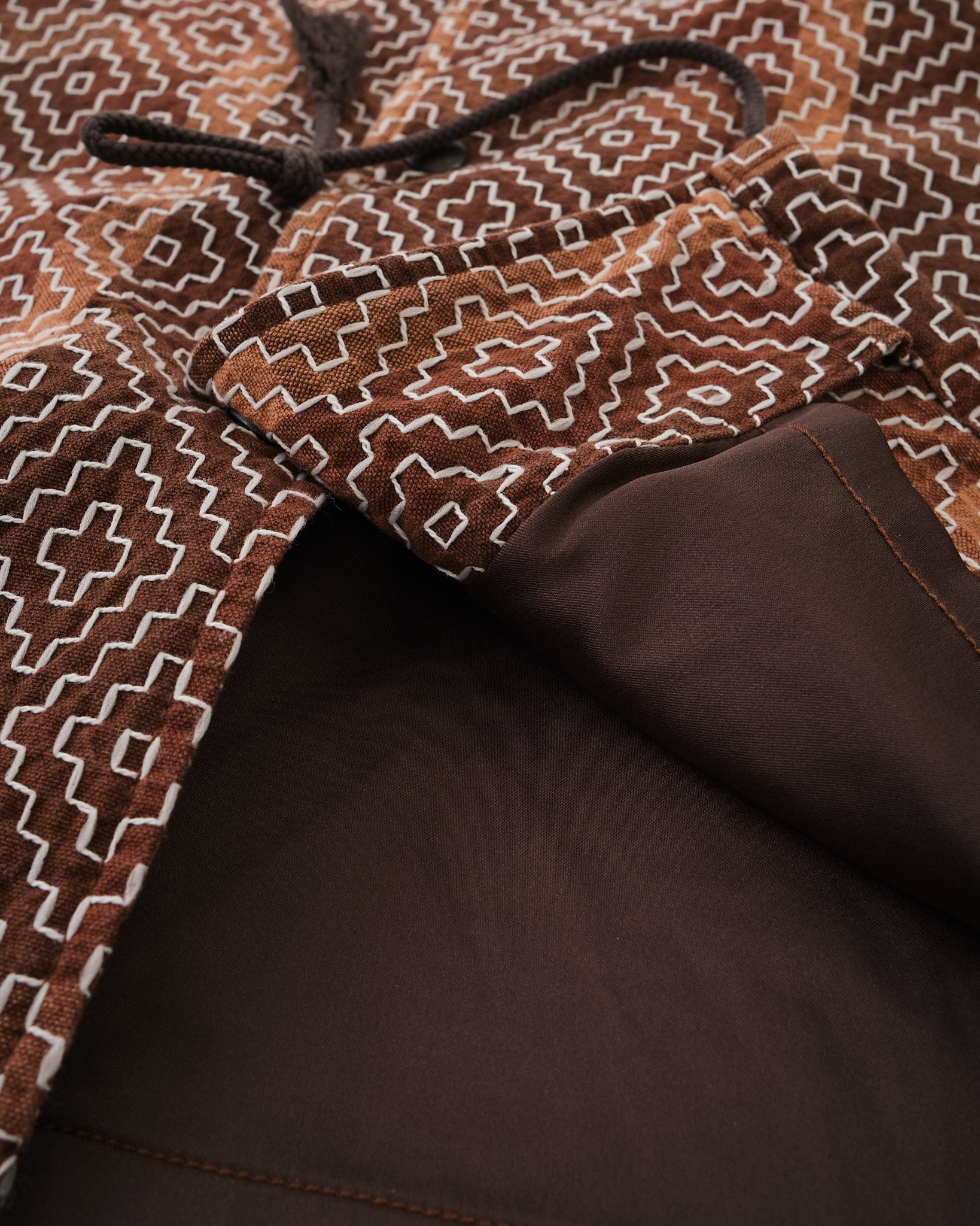 Sashiko-ompelu kulkee sekä pysty- että vaakasuunnassa, esillä on perinteinen kakipuun lehtikuvio, lisäten syvyyttä ja perinnettä vaatteeseen. Kangas käy läpi korkean lämpötilan pesun, luoden rikkaan käsin ommellun kaltaisen tekstuuri, kiitos käytettyjen materiaalien vaihtelevien kutistumisasteiden.