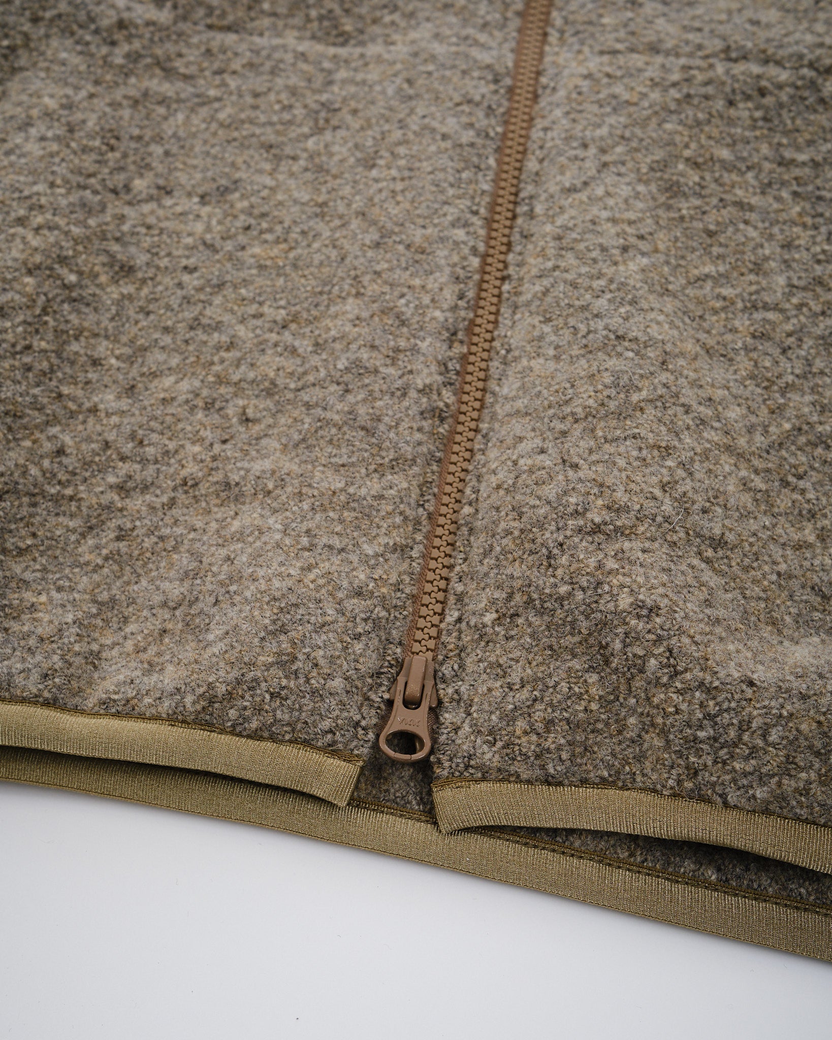 Herkuttele nostalgisella tunteella Nanamica Boiled Wool Zip Up -neuleessa Coyote-värissä. Tämä vetoketjullinen neule on huolellisesti valmistettu Japanissa käyttäen ainutlaatuista tekniikkaa. Villalangat on tarkoituksella lenkitetty pinnalle, sitten neulottu ja kutistettu luomaan tekstuurin, joka herättää muistoja klassisesta ulkoiluvaatetuksesta.