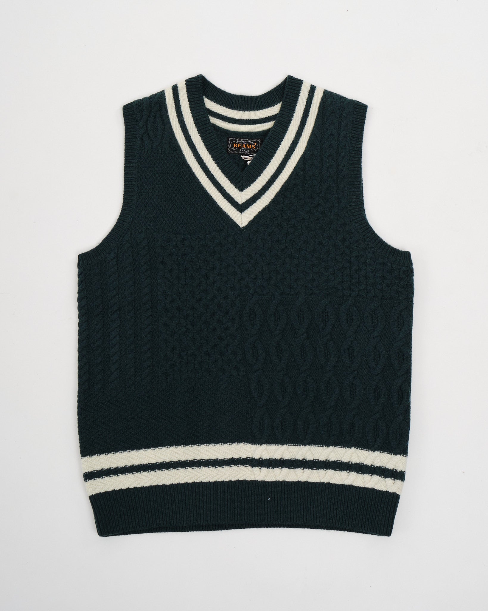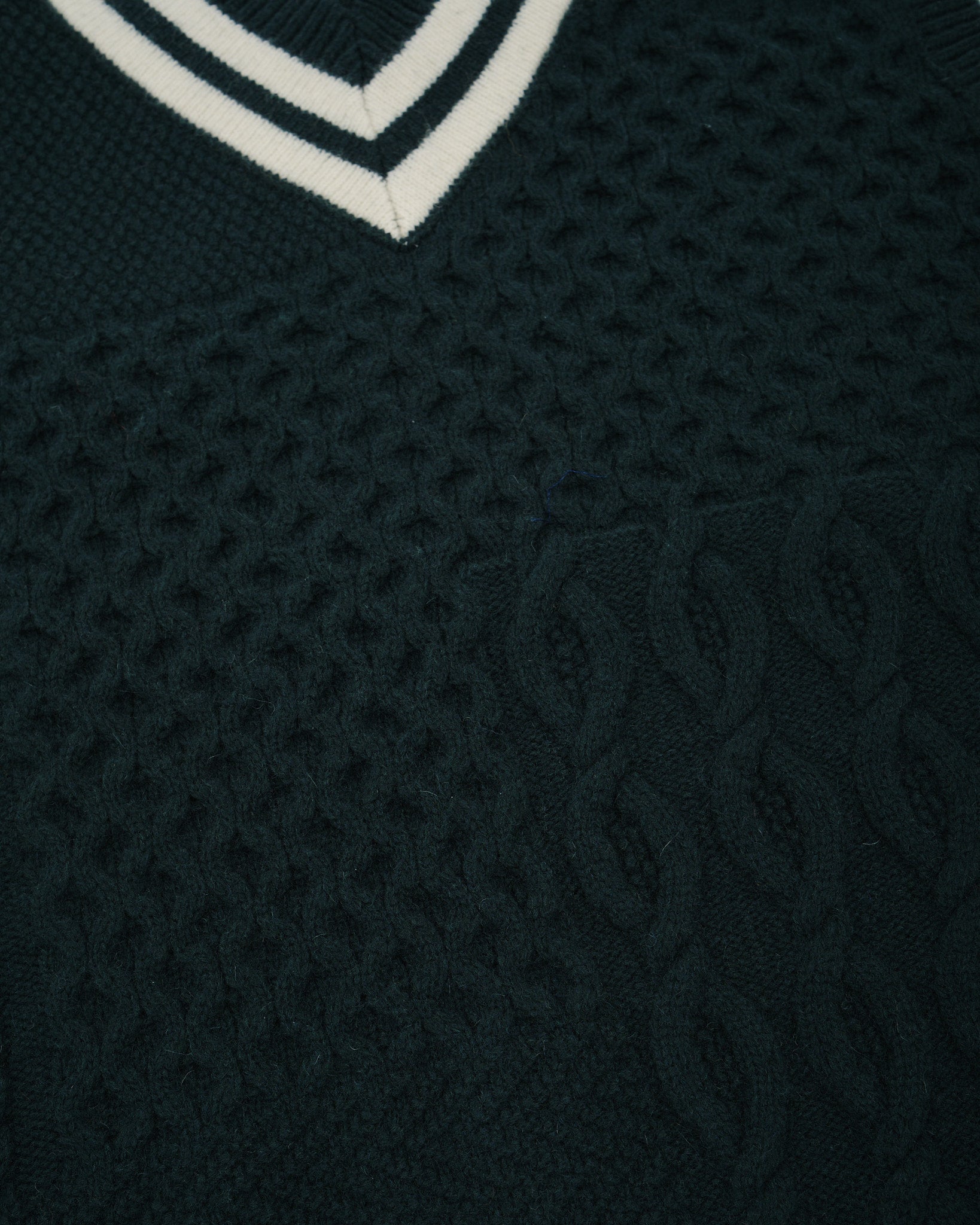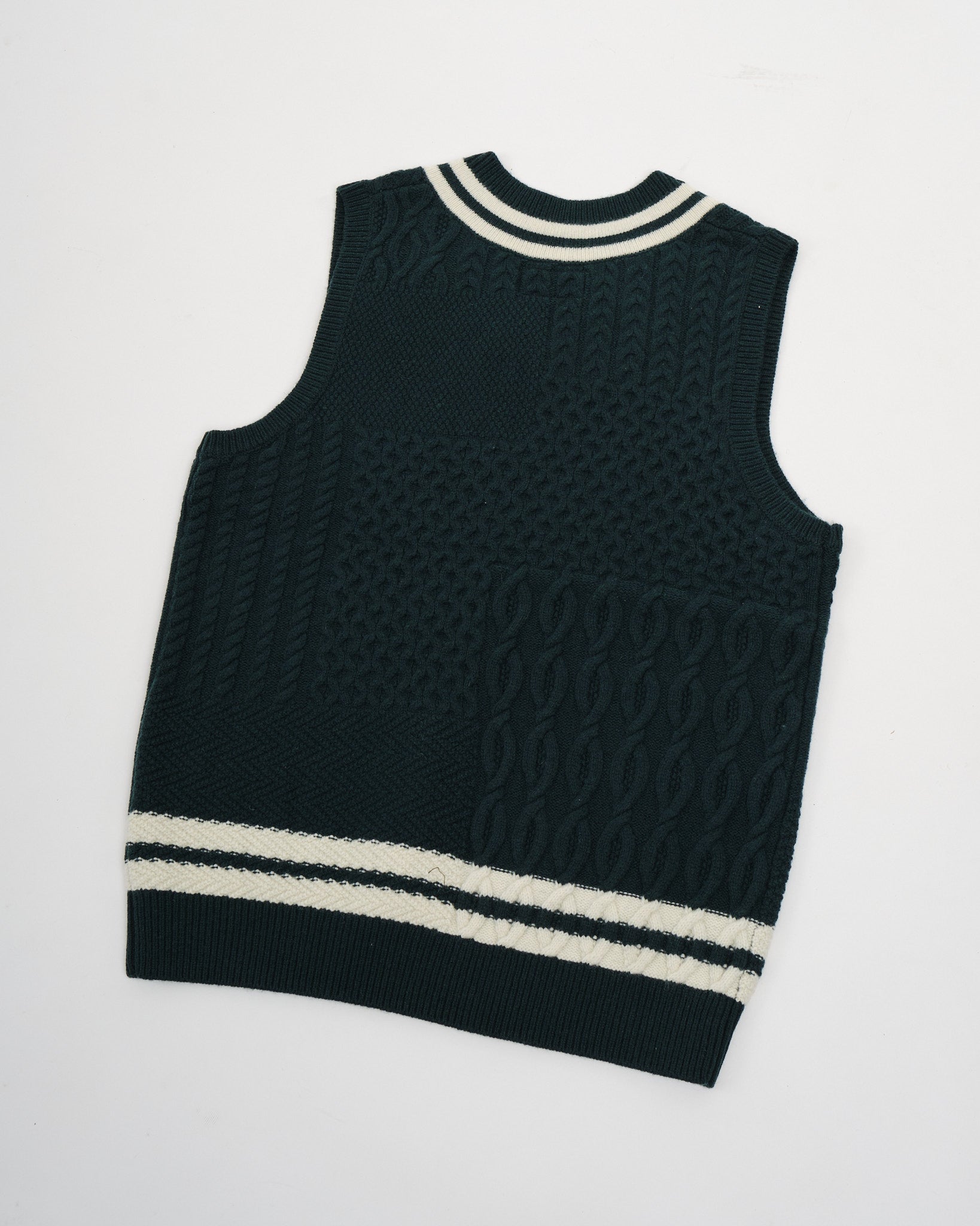 Tutustu Meadow'ssa saatavilla olevaan Beams+ Cricket Vest Patchwork Like Green -liiviin. Tämä hämmästyttävä liivi esittelee sekoituksen tilkkutöitä, jotka noudattavat krikettivaatetuksen korkeita standardeja, mutta eläväisellä vivahteella. Monimutkaiset palmikko, lintusilmä ja kalanruotokuvioinnit on taitavasti yhdistetty, tuloksena dynaaminen ulkonäkö. Villanylonsekoitteesta valmistettu, se on hihaton ja erottuu erityisesti neulotuilla raidoillaan V-muotoisessa kauluksessa ja alareunassa. Kädentieaukkoja korostavat joustinneuleiset käänteet, kun taas erilaisten neuletekstuureiden avulla luotu tilkkutyylimäinen viimeistely lisää odottamatonta kosketusta. Hieman lyhyemmällä mitoituksellaan se on täydellinen, tyylikkäitä kerrosvaihtoehtoja varten.