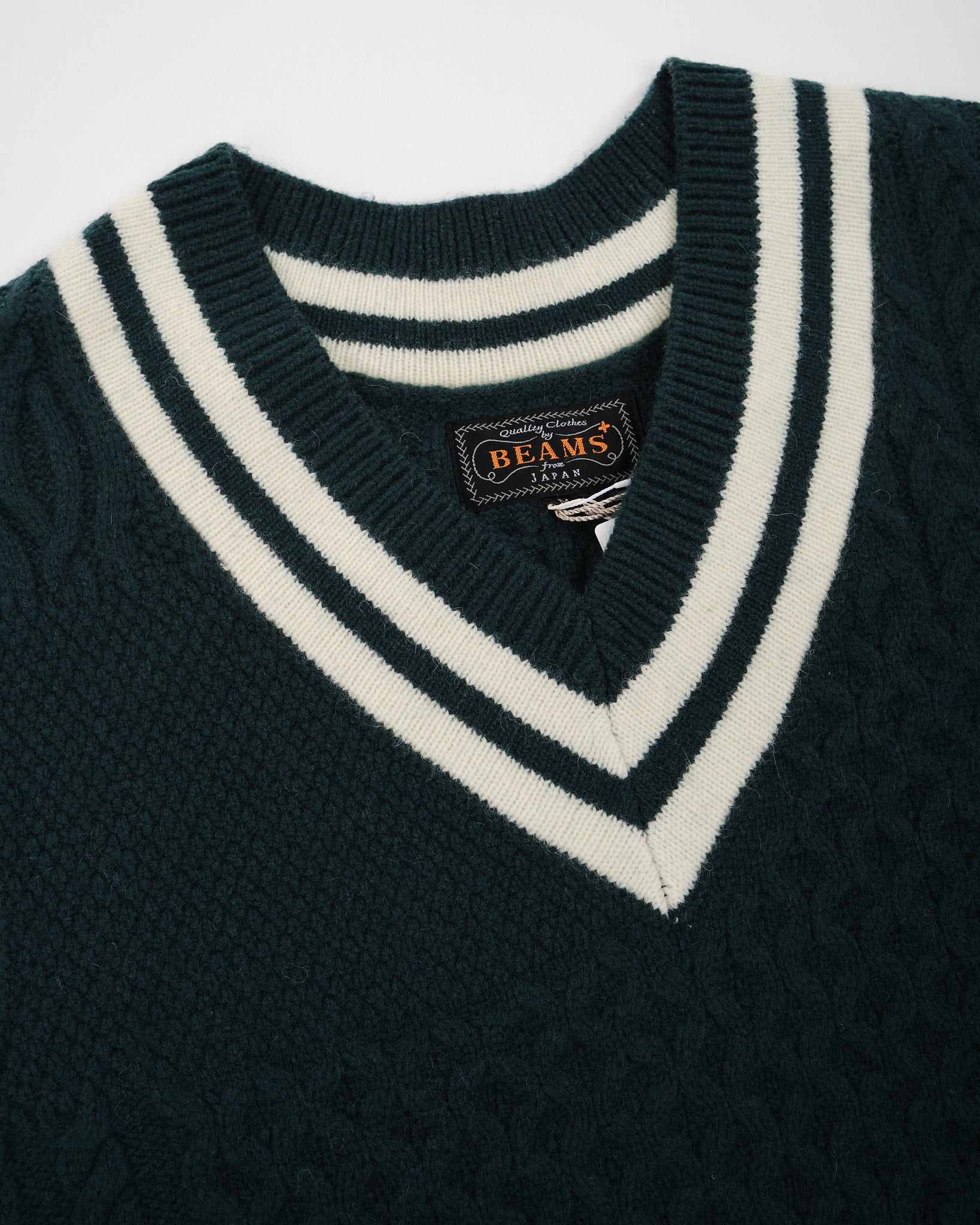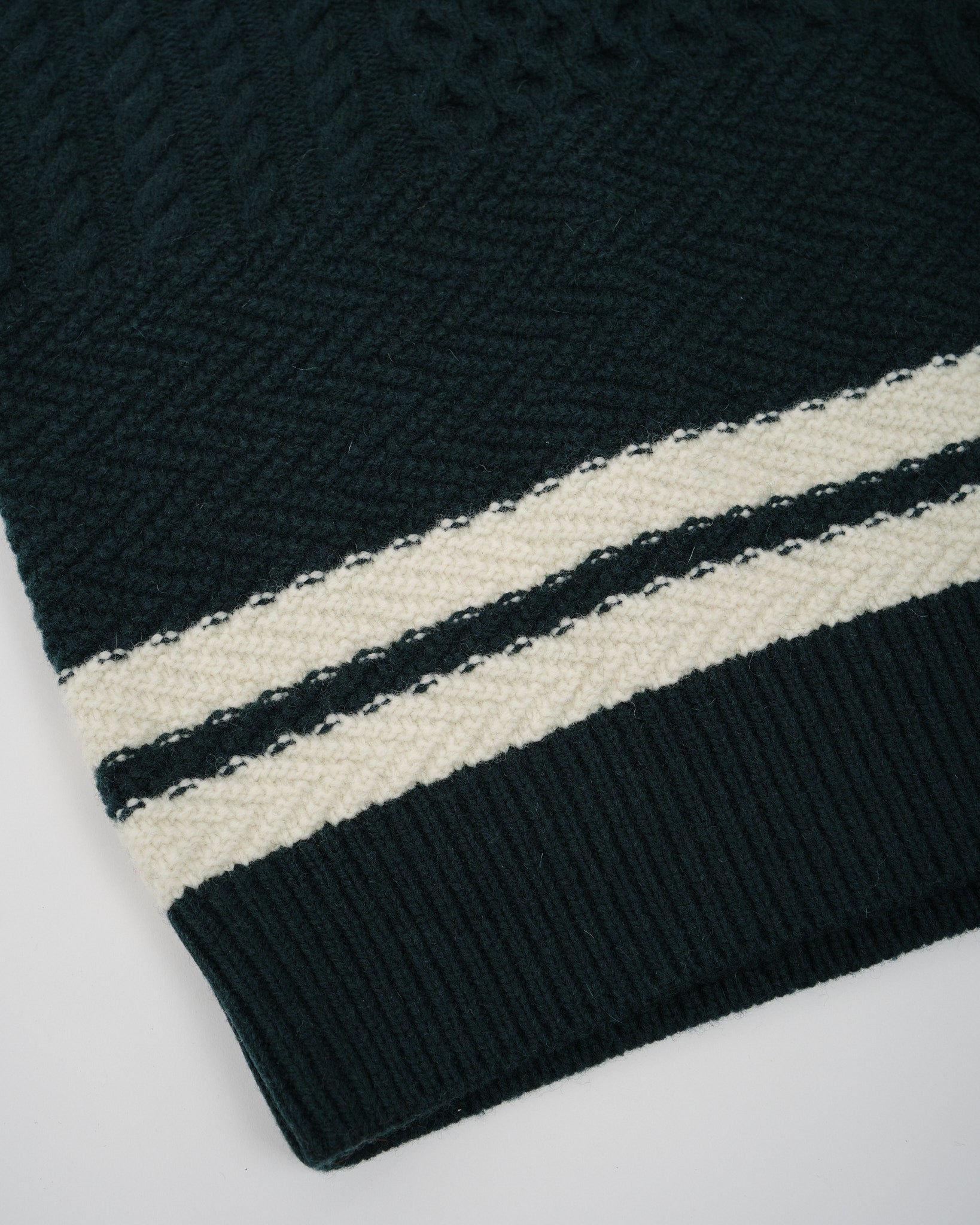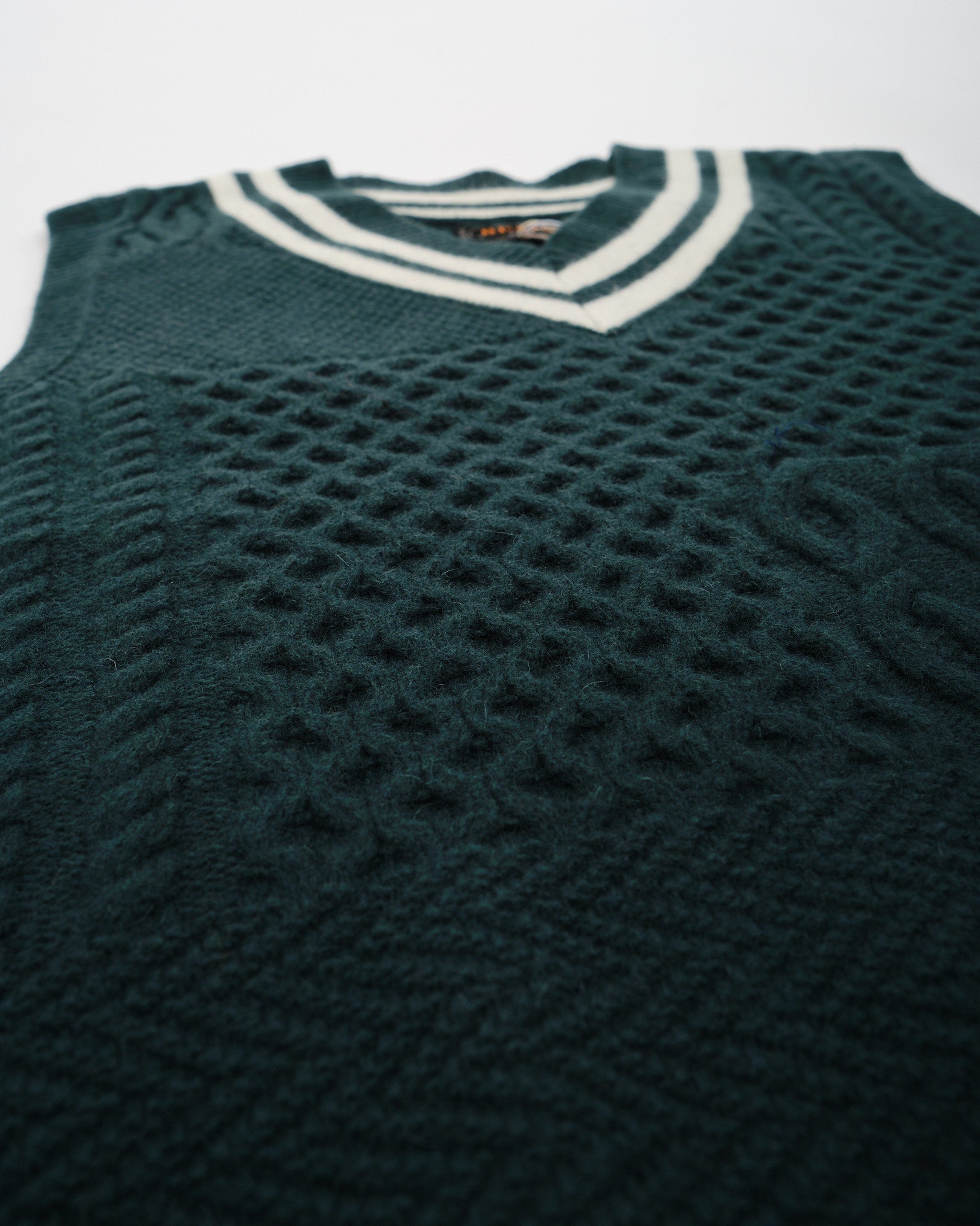 Tutustu Meadow'ssa saatavilla olevaan Beams+ Cricket Vest Patchwork Like Green -liiviin. Tämä hämmästyttävä liivi esittelee sekoituksen tilkkutöitä, jotka noudattavat krikettivaatetuksen korkeita standardeja, mutta eläväisellä vivahteella. Monimutkaiset palmikko, lintusilmä ja kalanruotokuvioinnit on taitavasti yhdistetty, tuloksena dynaaminen ulkonäkö. Villanylonsekoitteesta valmistettu, se on hihaton ja erottuu erityisesti neulotuilla raidoillaan V-muotoisessa kauluksessa ja alareunassa. Kädentieaukkoja korostavat joustinneuleiset käänteet, kun taas erilaisten neuletekstuureiden avulla luotu tilkkutyylimäinen viimeistely lisää odottamatonta kosketusta. Hieman lyhyemmällä mitoituksellaan se on täydellinen, tyylikkäitä kerrosvaihtoehtoja varten.