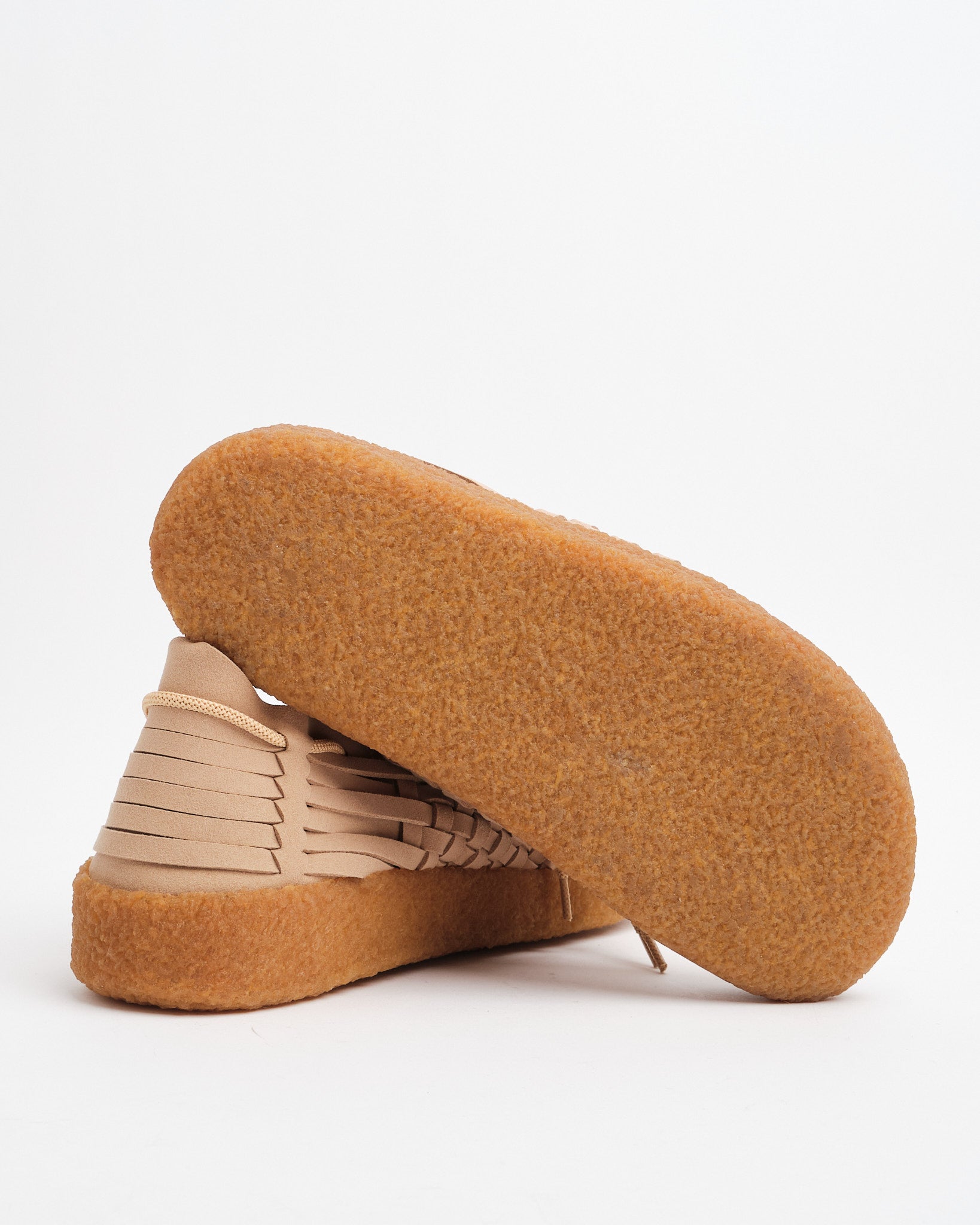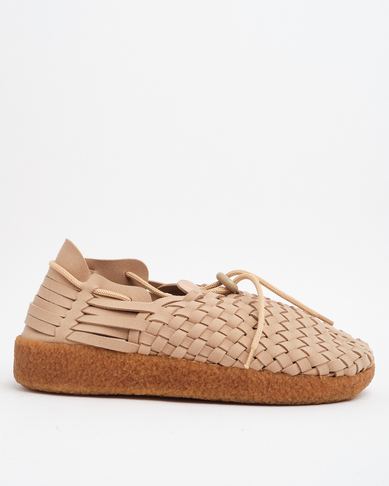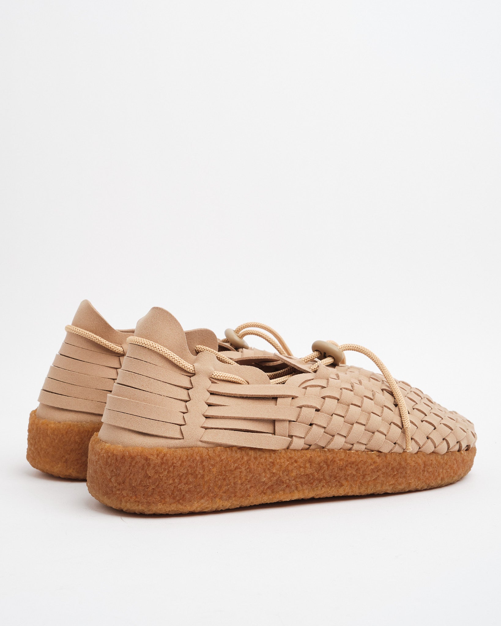 Valmistettu julmuudettomasta vegaanisesta mokkanahasta, sandaalin hihnat on kudottu käsin yksityiskohtaisesti, varmistaen maalaisen estetiikan yhdistettynä vankkaan tukeen. Ergonominen jalkapeti tarjoaa merkittävää kaaren tukea, parantaen mukavuutta pitkäaikaisessa käytössä. Kestävä kolmiosainen kaksitiheysvälikerros, joka on päällystetty luonnollisella malesialaisella kreppikumipohjalla, lupaa kestävyyttä ja vakautta. Nämä sandaalit on valmistettu huolellisella yksityiskohtien huomioimisella ja käsityönä Kambodžassa.