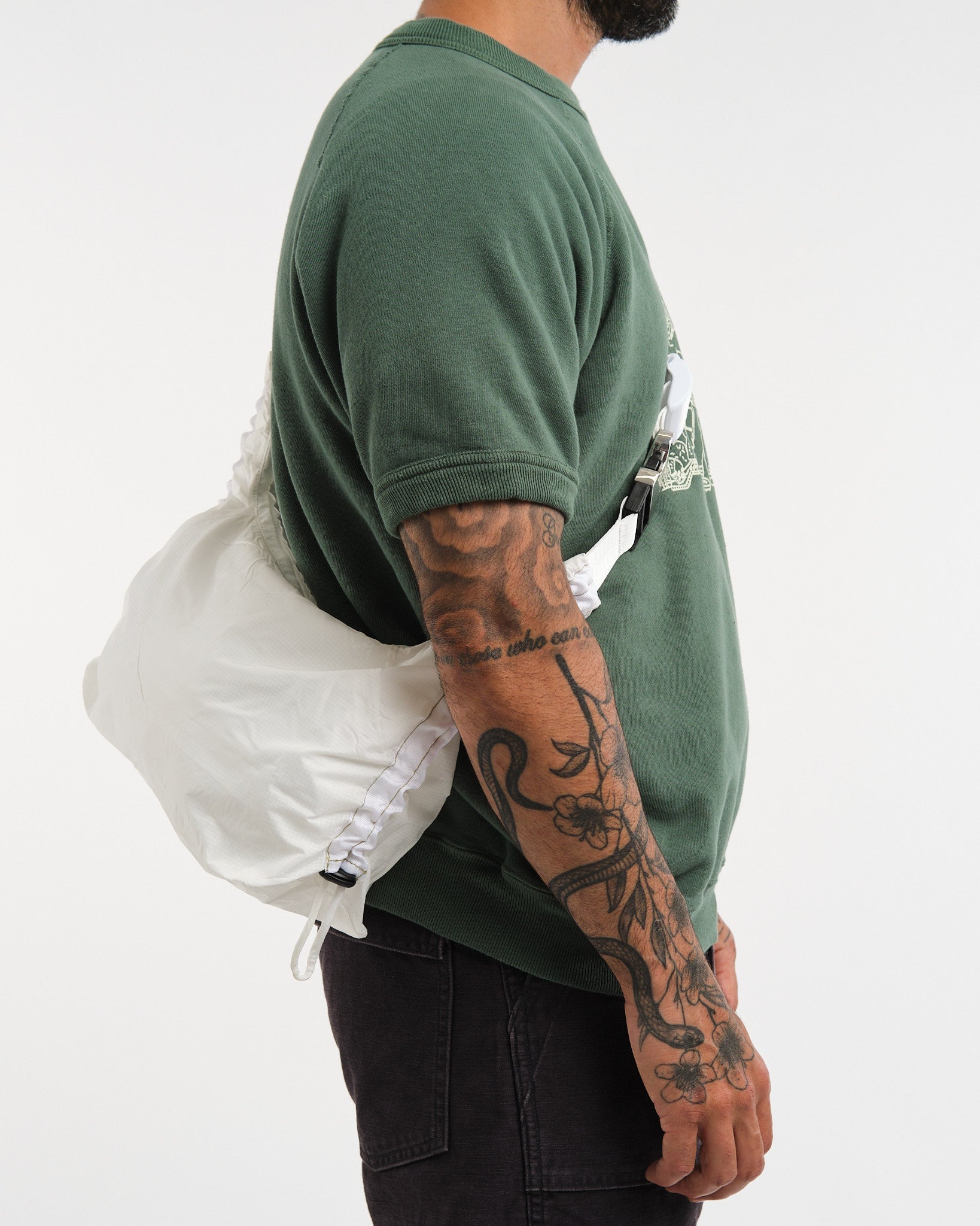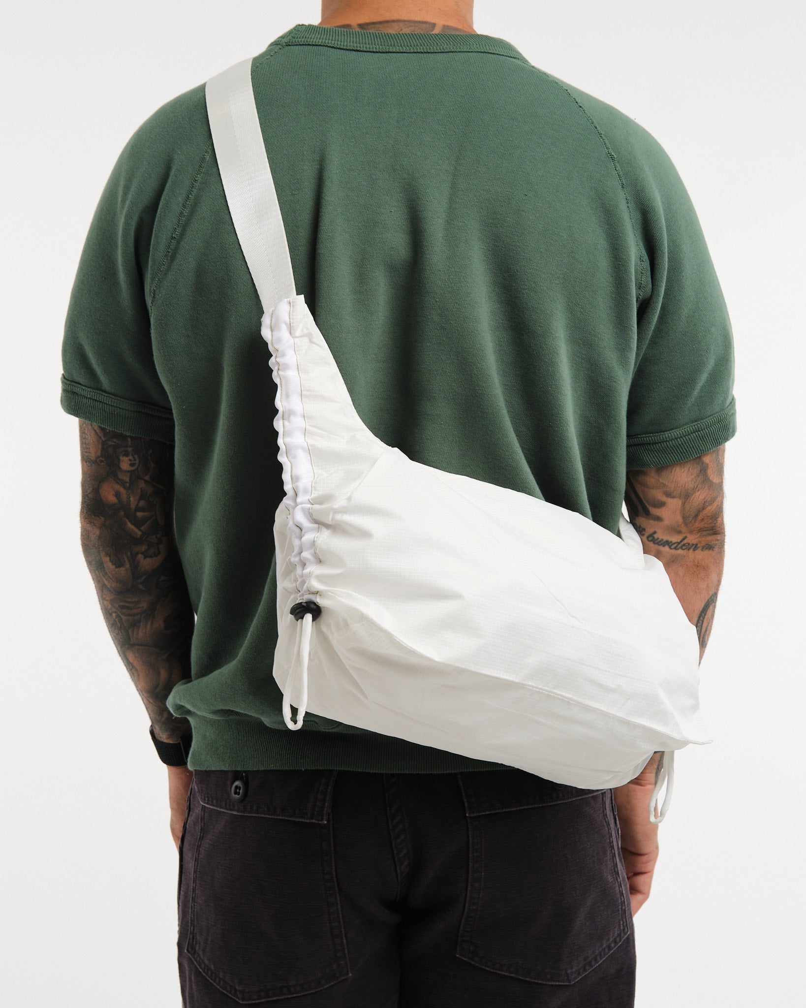 The ARCS LONDON Little Hey Parachute in White on kompakti ja käytännöllinen olka- tai ristikkäin kantolaukku, joka on suunniteltu päivittäiseen mukavuuteen. Valmistettu 100% kierrätetystä polyesteristä, tämä laukku heijastaa ARCS LONDONin sitoutumista kestävyyteen. Suunnittelussa on säädettävät nyörit kummallakin puolella, mikä mahdollistaa vaivattoman koon muuttamisen niin, että se sopii tiiviisti kainalon alle. Brändätyllä laitteistolla ja sisäisellä vetoketjutaskulla varustettu, se takaa sekä tyylin että toiminnallisuuden. Päälokero on 21 cm korkea, pohjan leveys on 32 cm ja pohjan syvyys on 12,5 cm. Käsintehty Lontoossa, tämä laukku on laadukkaan käsityön esimerkki.