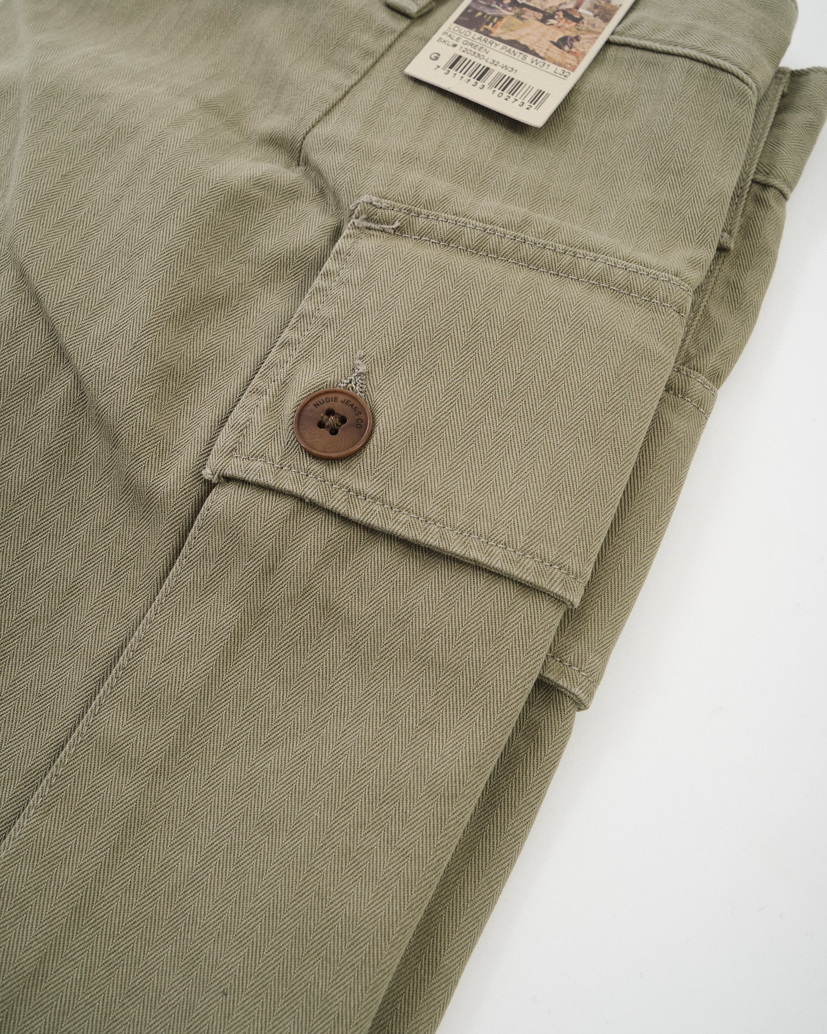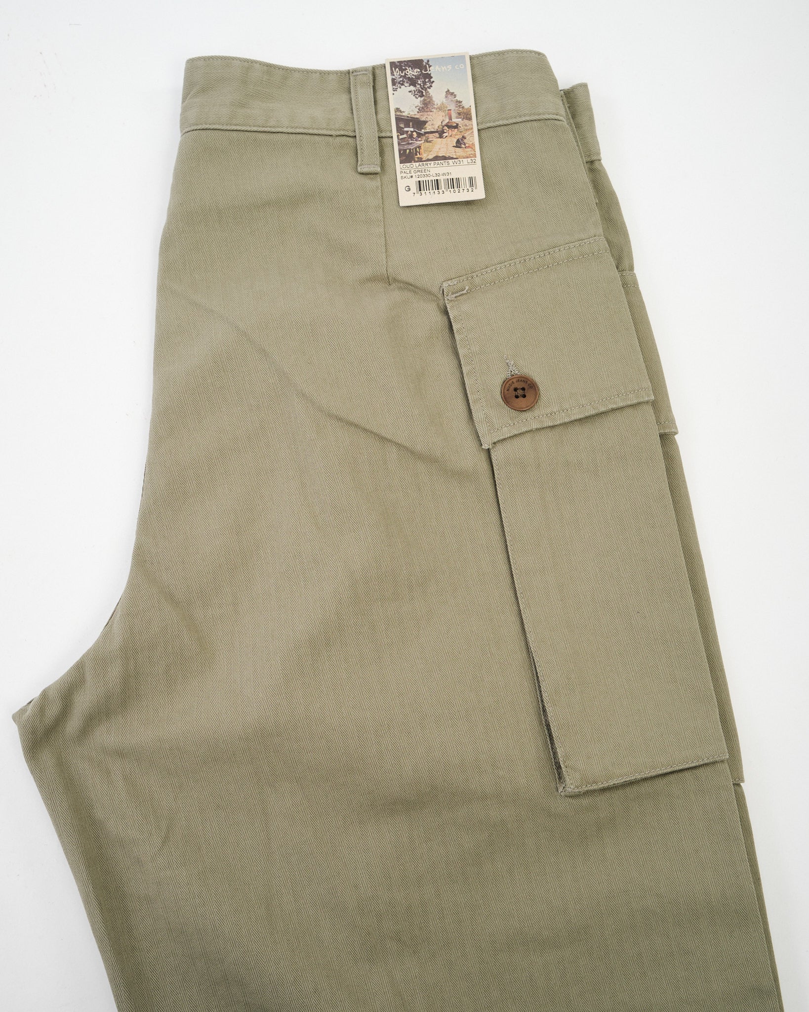 Details include corozo buttons, a button fly, matching tonal stitching, and a woven back patch. The two large side pockets draw inspiration from classic P-44 utility trousers, often referred to as “Monkey Pants,” reinforcing the functional workwear roots of the design. Made in Tunisia, Loud Larry Pale Green balances historical references with a modern, easy-wearing silhouette.