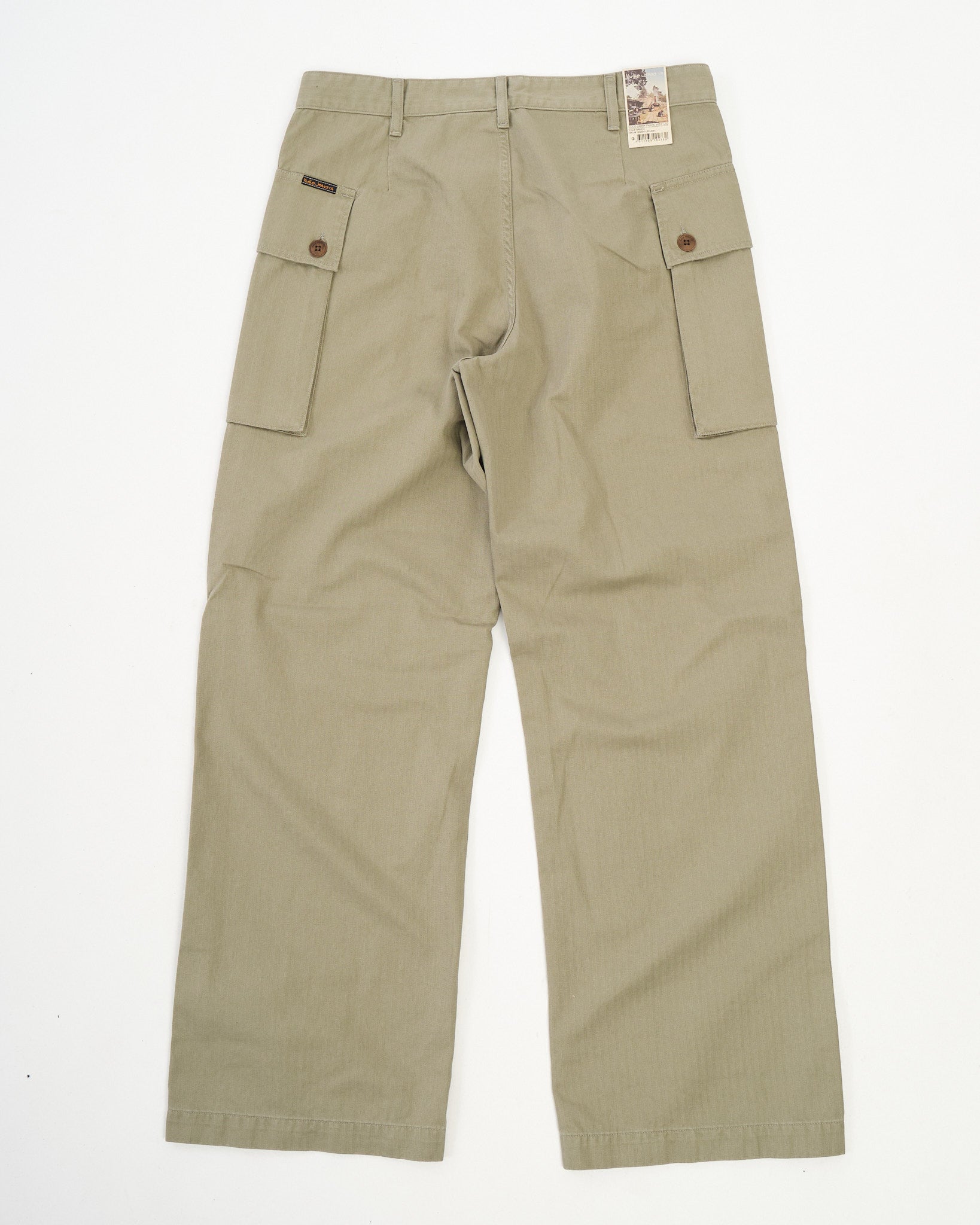 Loud Larry Pale Green is a relaxed, workwear-inspired trouser with a high waist, loose fit, and wide straight legs. Staying true to Nudie Jeans’ appreciation for heritage garments, this version is made from rigid herringbone twill in organic cotton — a fabric long associated with vintage workwear and military uniforms.