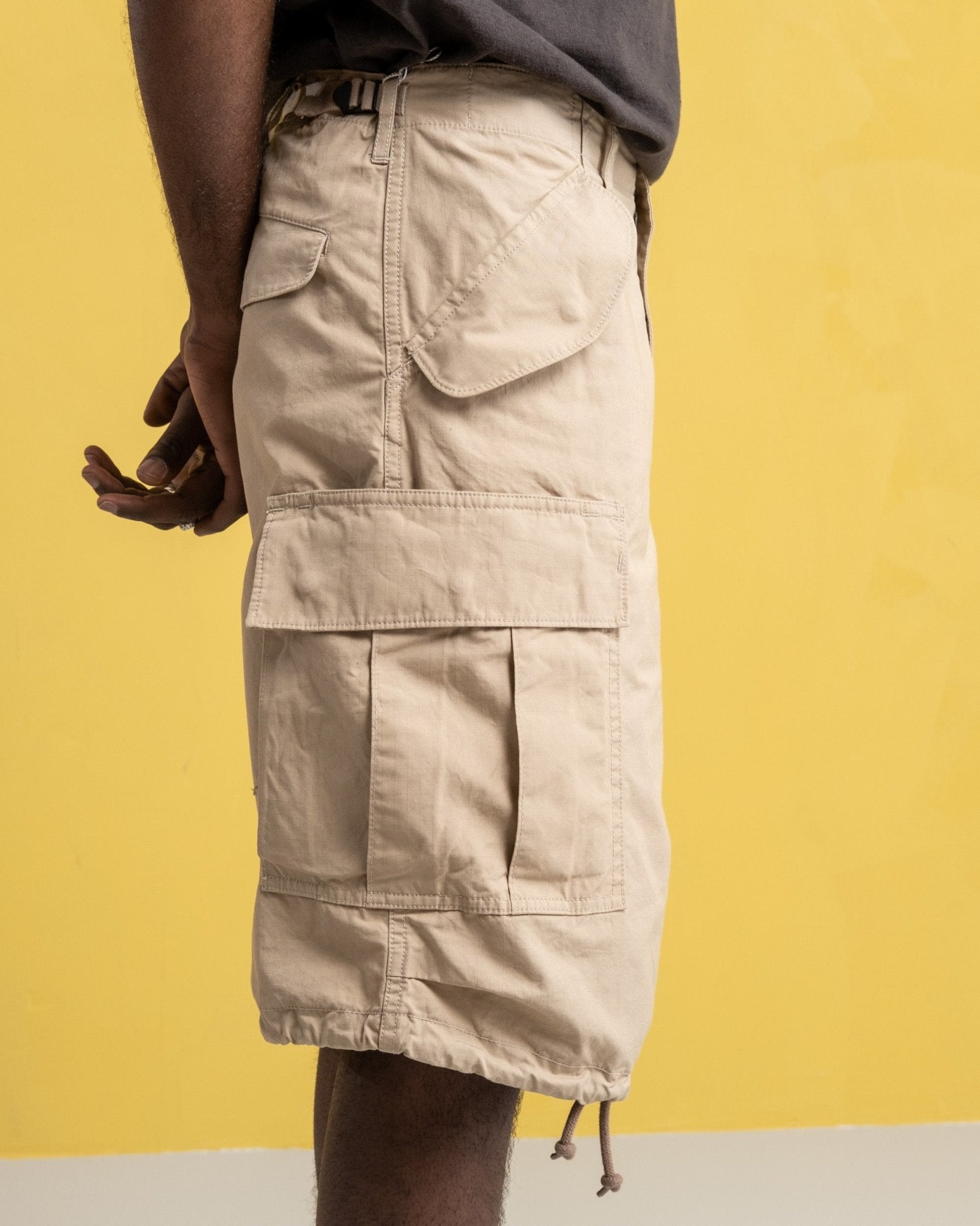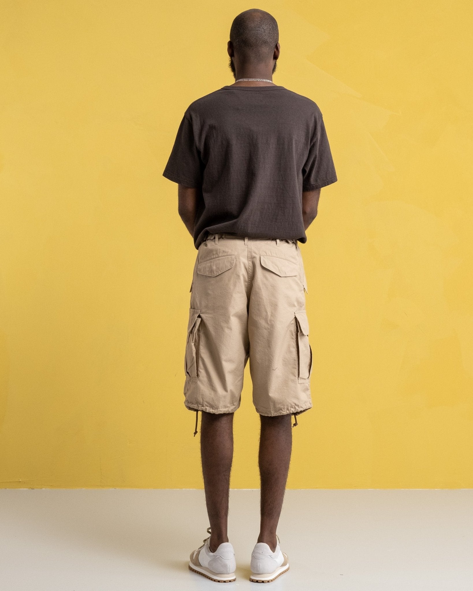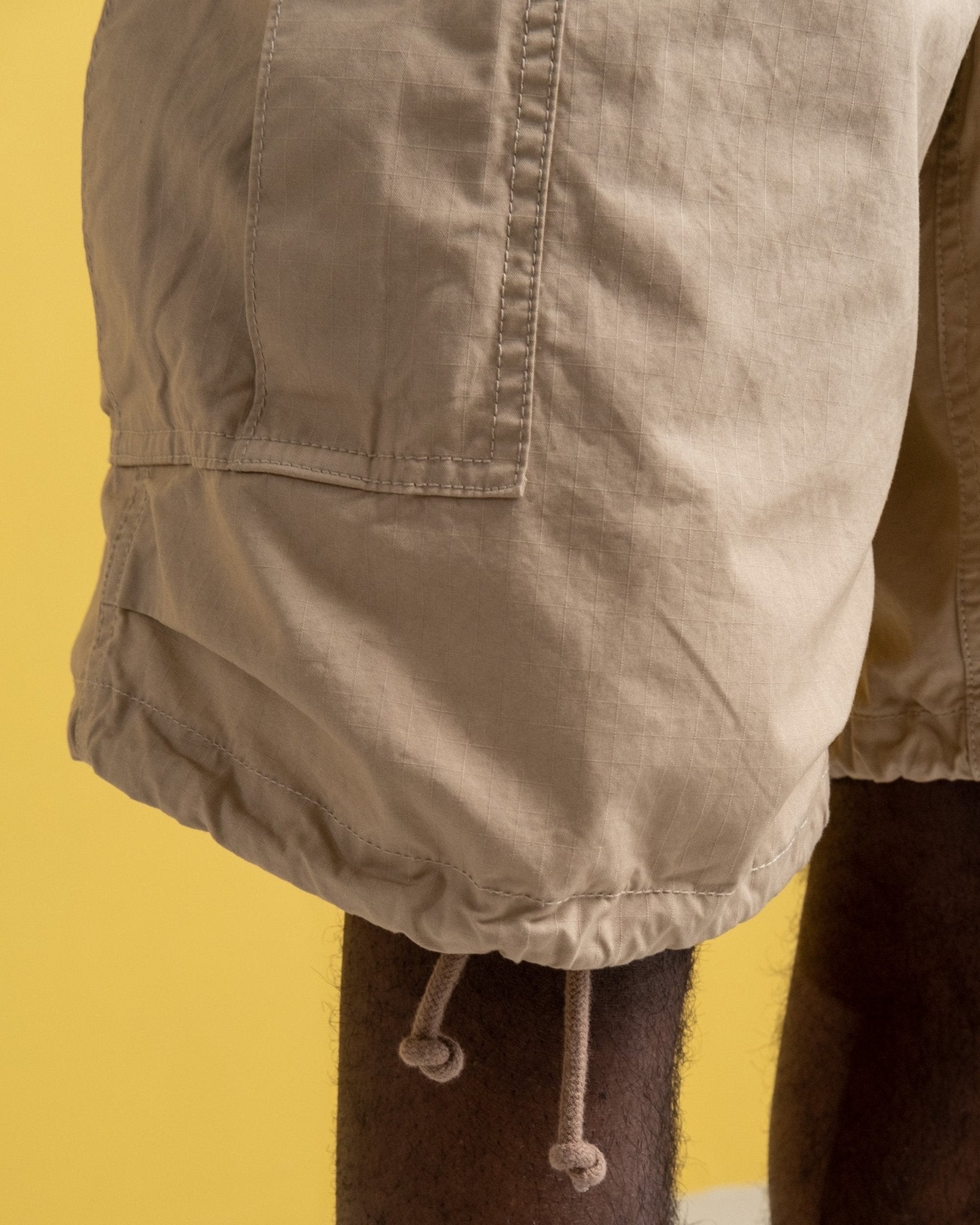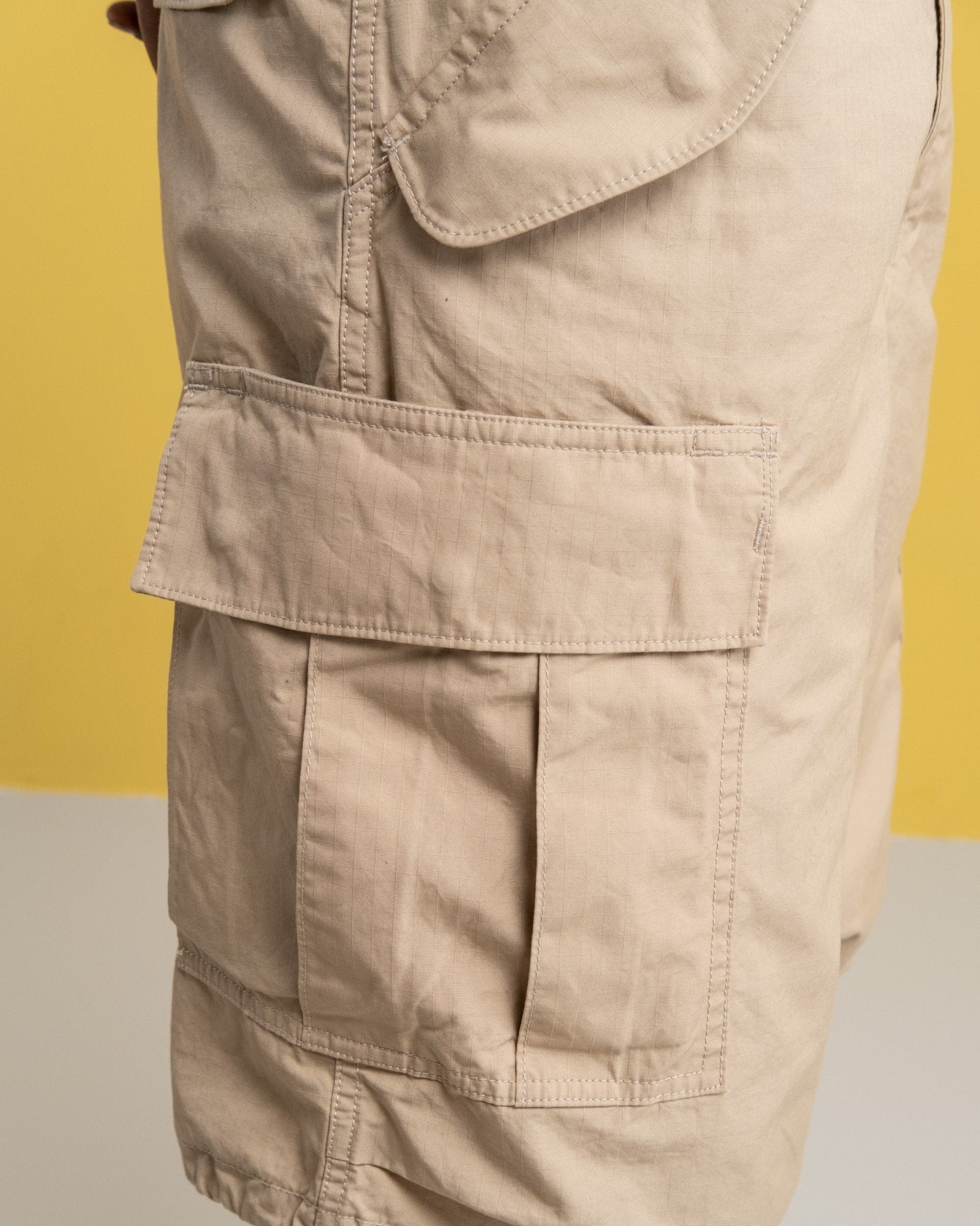 MIL 6Pocket 80/3 Ripstop Beige 20 Beams+ -merkiltä. Väljä ja leveä malli, japanilaisesta puuvillarip-stopista valmistetut cargo-shortsit. Kevyet, mutta erittäin kestävät! Vetoketju ja nappikiinnitys, säädettävä vyötärö. Runsas määrä taskuja ja pari piilotettua sisätaskua. Helmat ovat myös säädettävissä kiristysnyöreillä. Valmistettu Kiinassa.