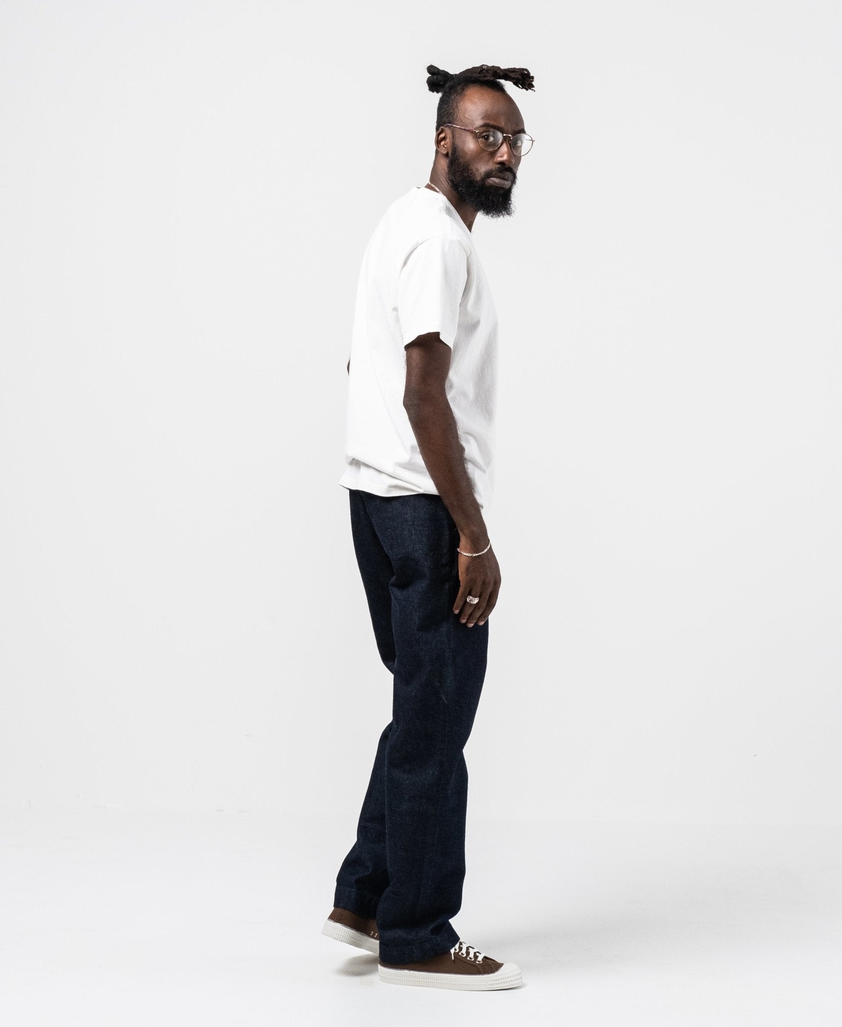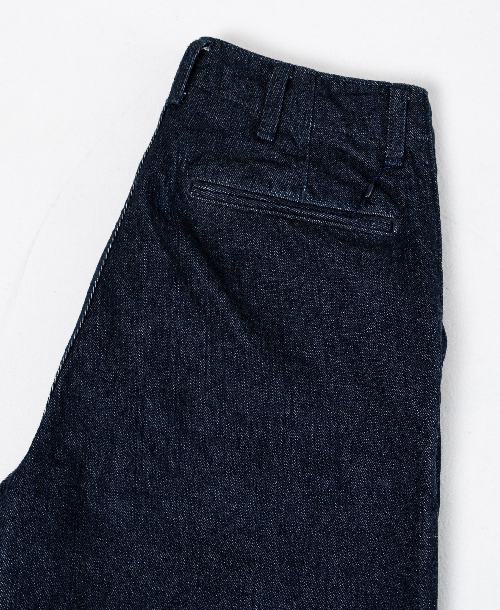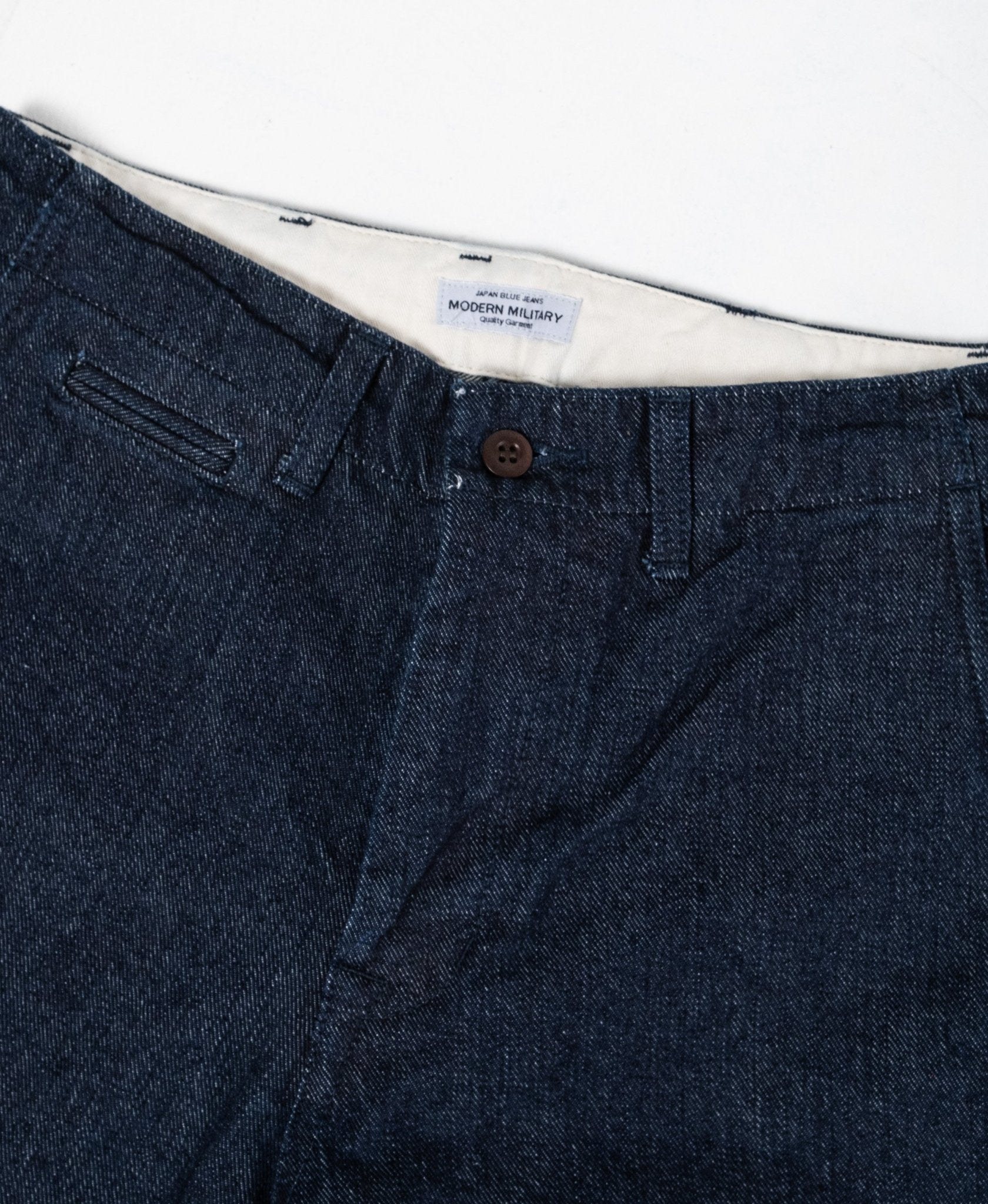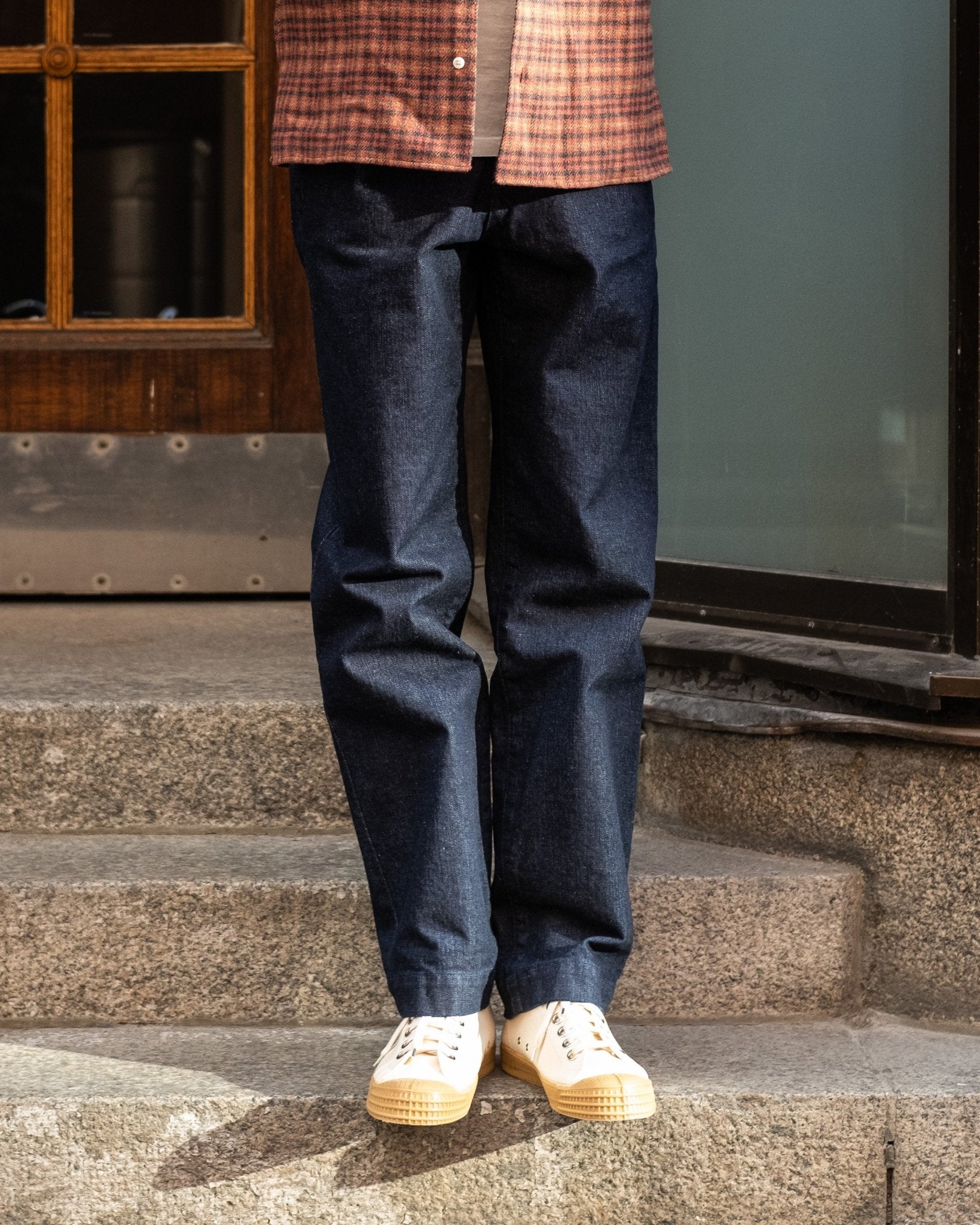 Modernit sotilashenkiset farkkutakit Japan Blue Jeansilta. Rento housumalli, valmistettu 12 unssin denimistä. Chino-tyyliset takataskut ja sivutaskut, sekä kolikkotasku. Valmistettu Japanissa.