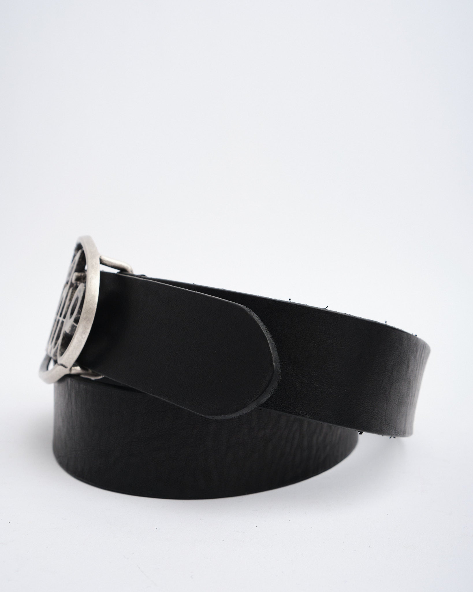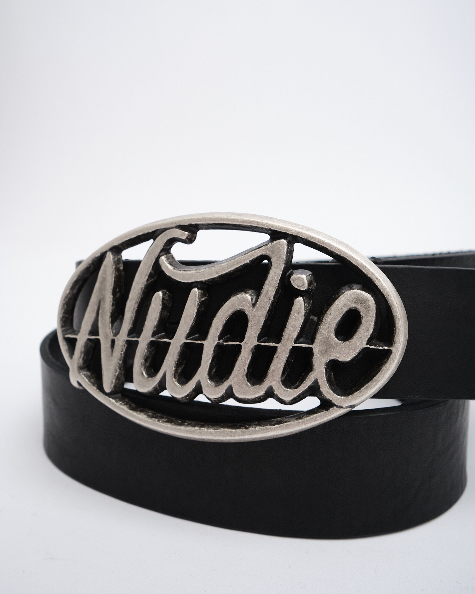 NUDIE JEANS CO. BUCKLE LEATHER BELT BLACK on lausunnon tekevä kappale, joka on valmistettu 40 mm leveästä, kasviparkitusta, täysjyväisestä nahasta. Syvän musta sävy korostaa vyön ylellistä tuntua, kun taas antiikkisen hopeanvärinen solki, joka on muotoiltu sanan "Nudie" mukaisesti, lisää rohkean ja erottuvan kosketuksen.