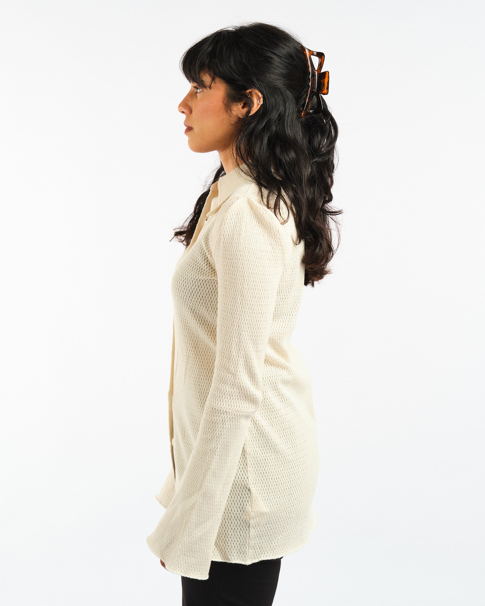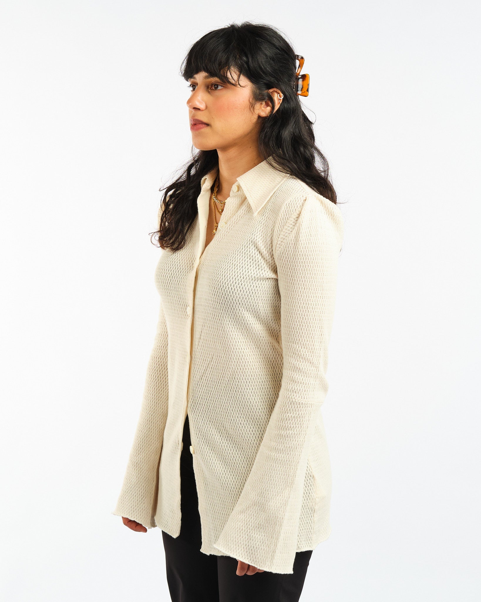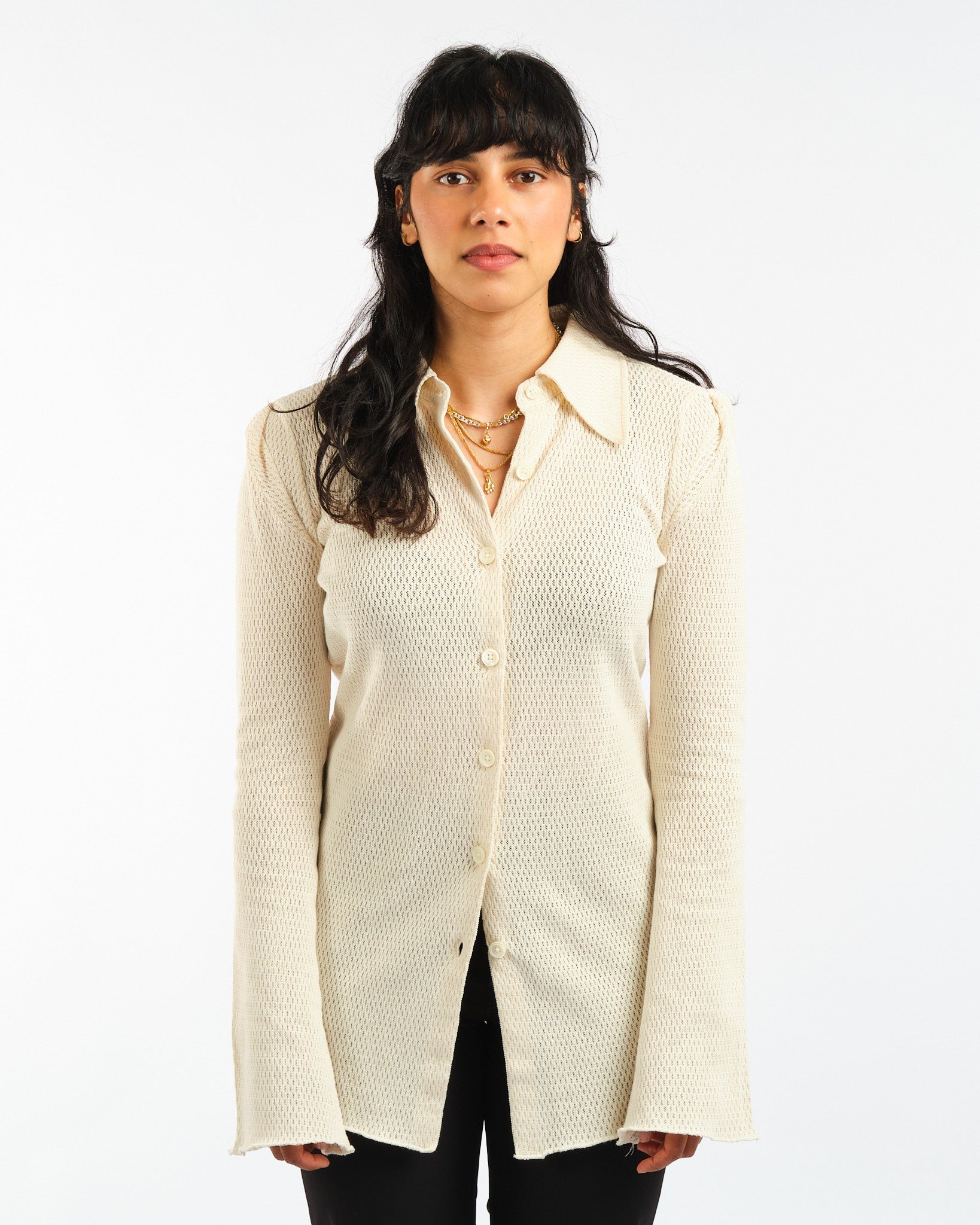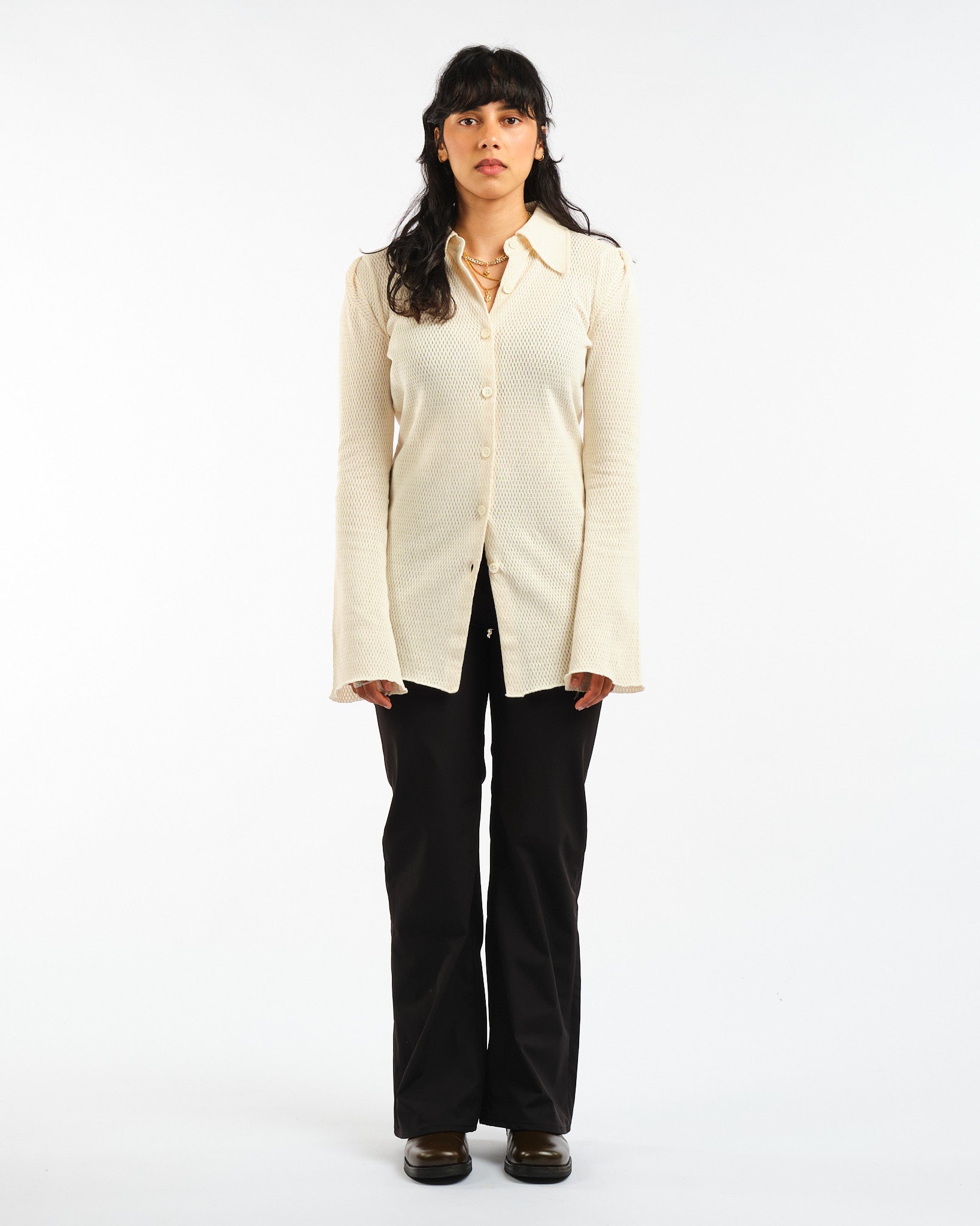 Hollow Shirt Ecru Sparse Cotton Our Legacyltä. Tämä on herkkä paita, jossa on pitsimäinen puuvillatekstuuri. Hienovaraiset yksityiskohdat, kuten pitkänomainen helma, savunväriset helmiäisnapit ja laskostetut olkapäät viimeistelevät tämän kauniin kappaleen. Valmistettu Portugalissa.