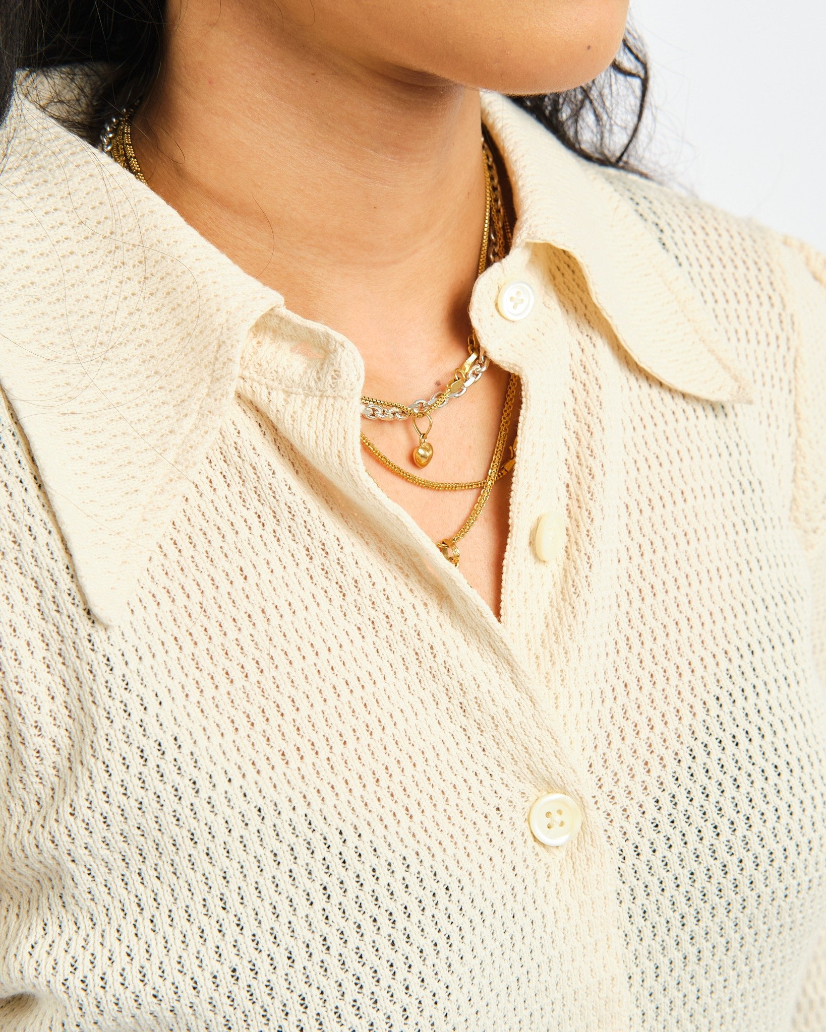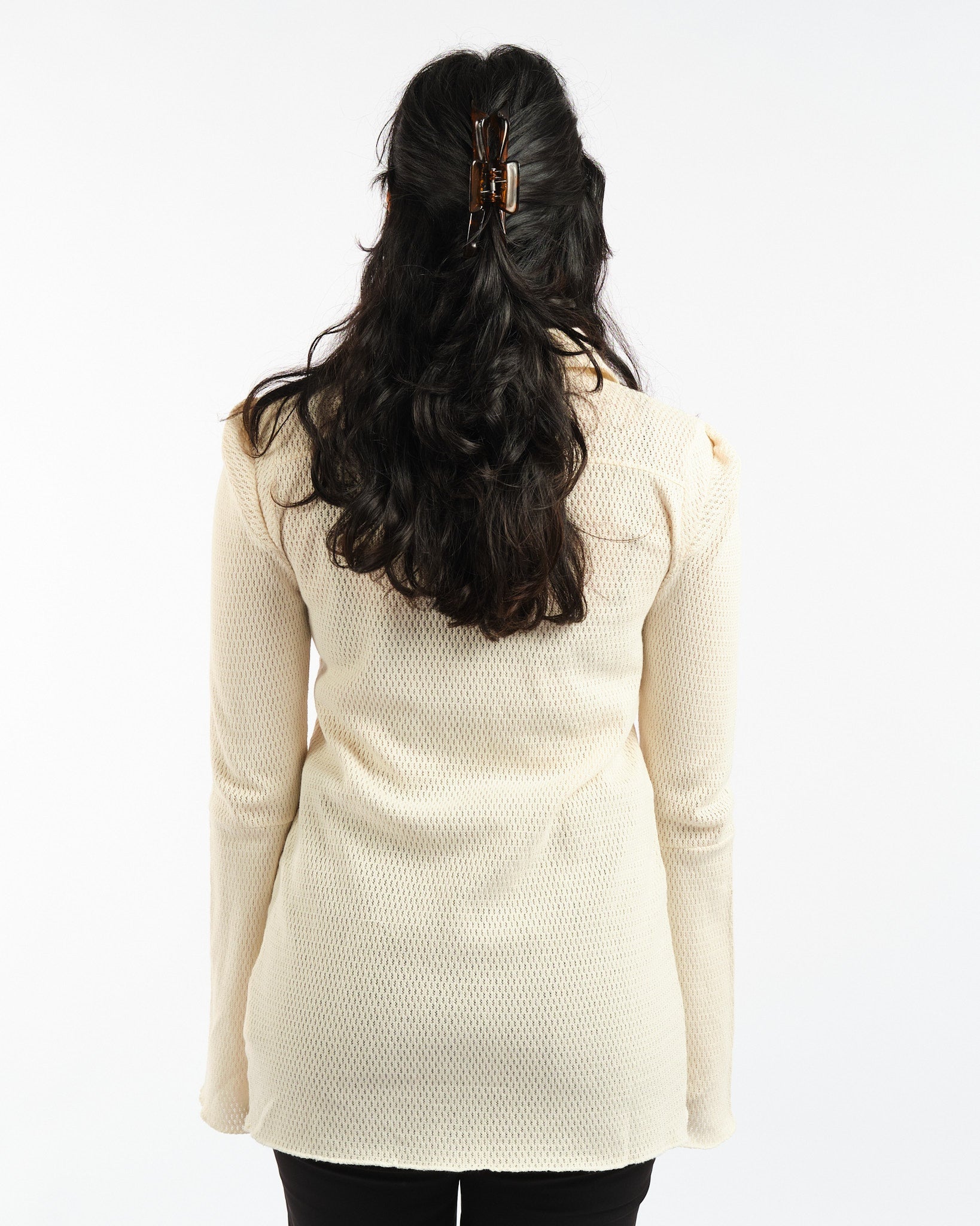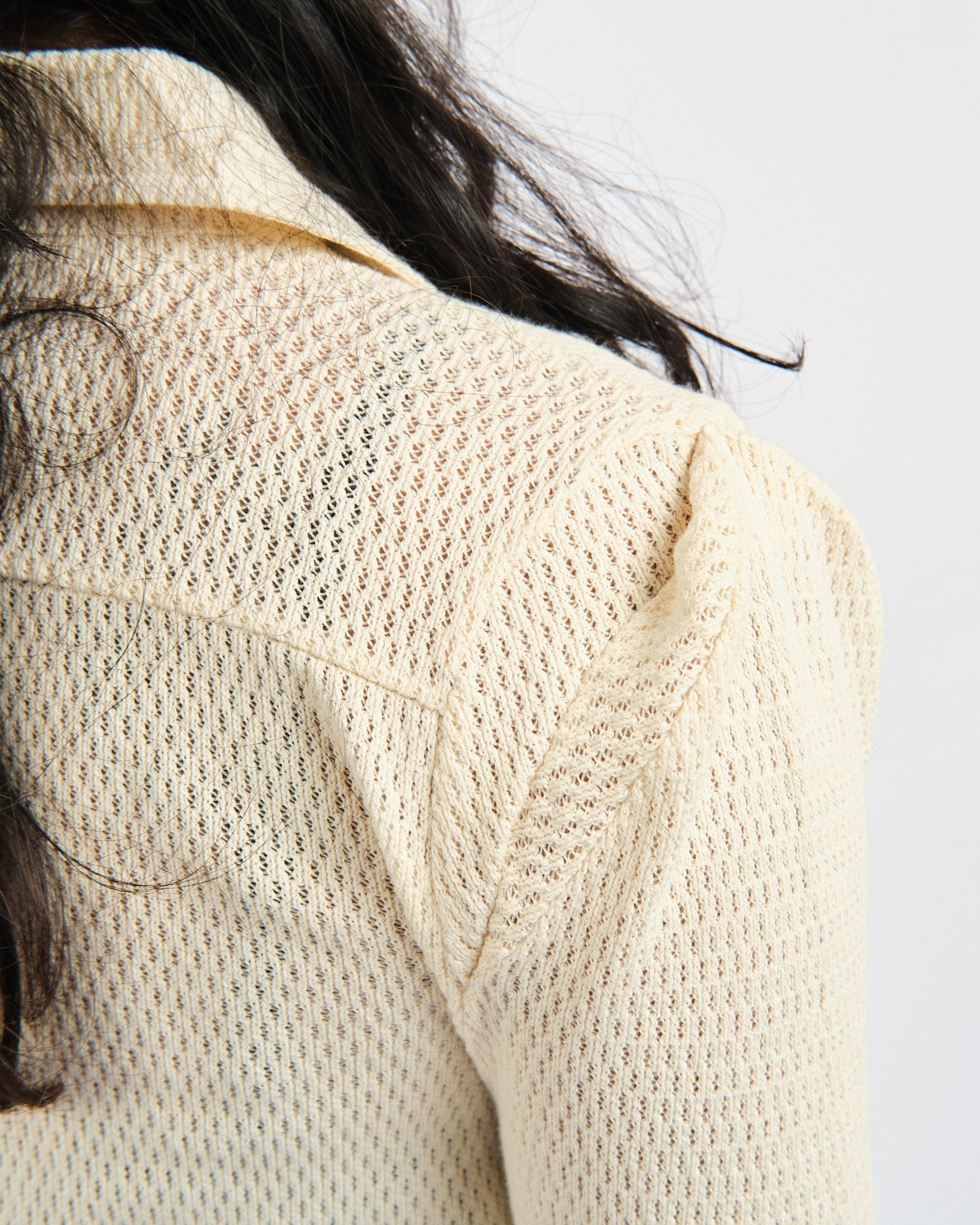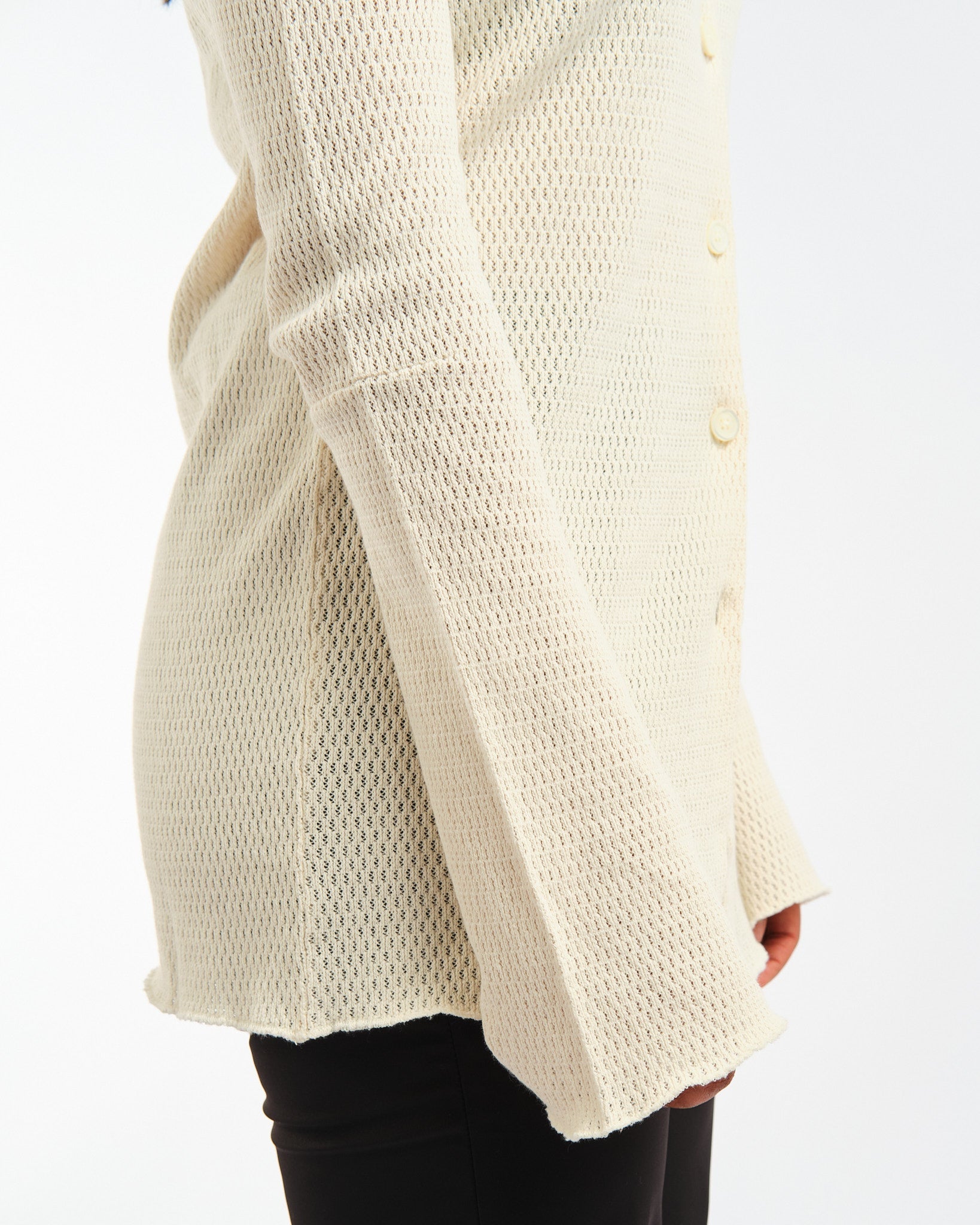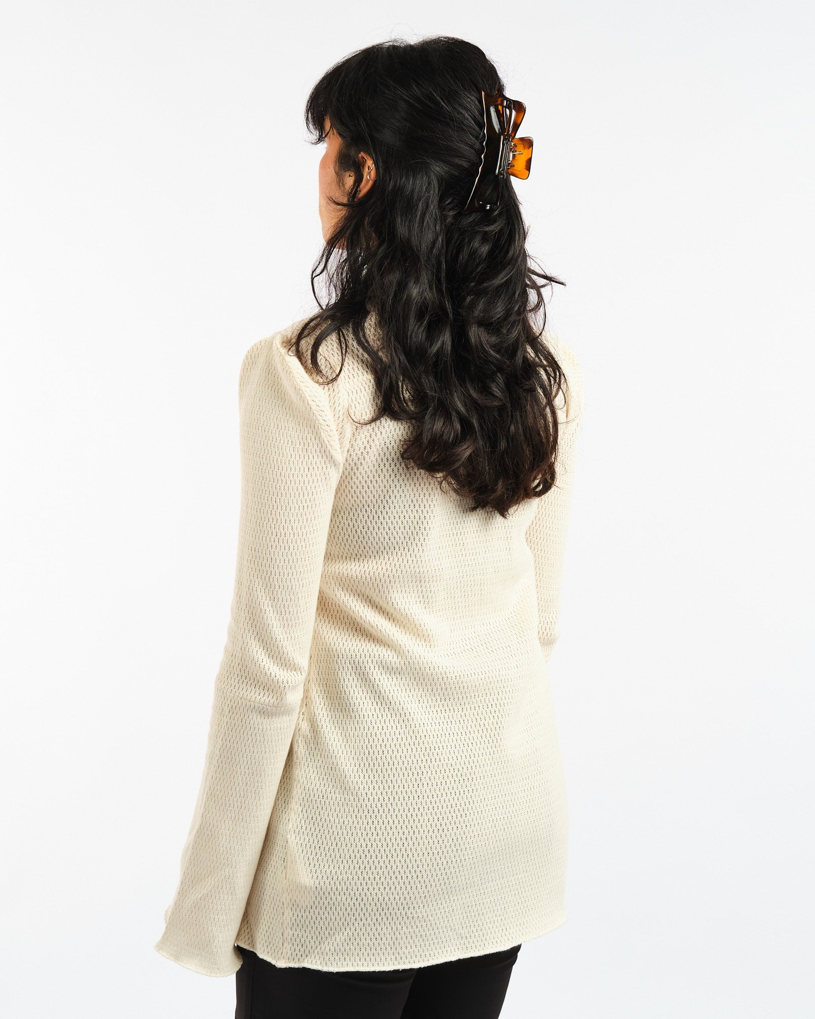 Hollow Shirt Ecru Sparse Cotton Our Legacyltä. Tämä on herkkä paita, jossa on pitsimäinen puuvillatekstuuri. Hienovaraiset yksityiskohdat, kuten pitkänomainen helma, savunväriset helmiäisnapit ja laskostetut olkapäät viimeistelevät tämän kauniin kappaleen. Valmistettu Portugalissa.