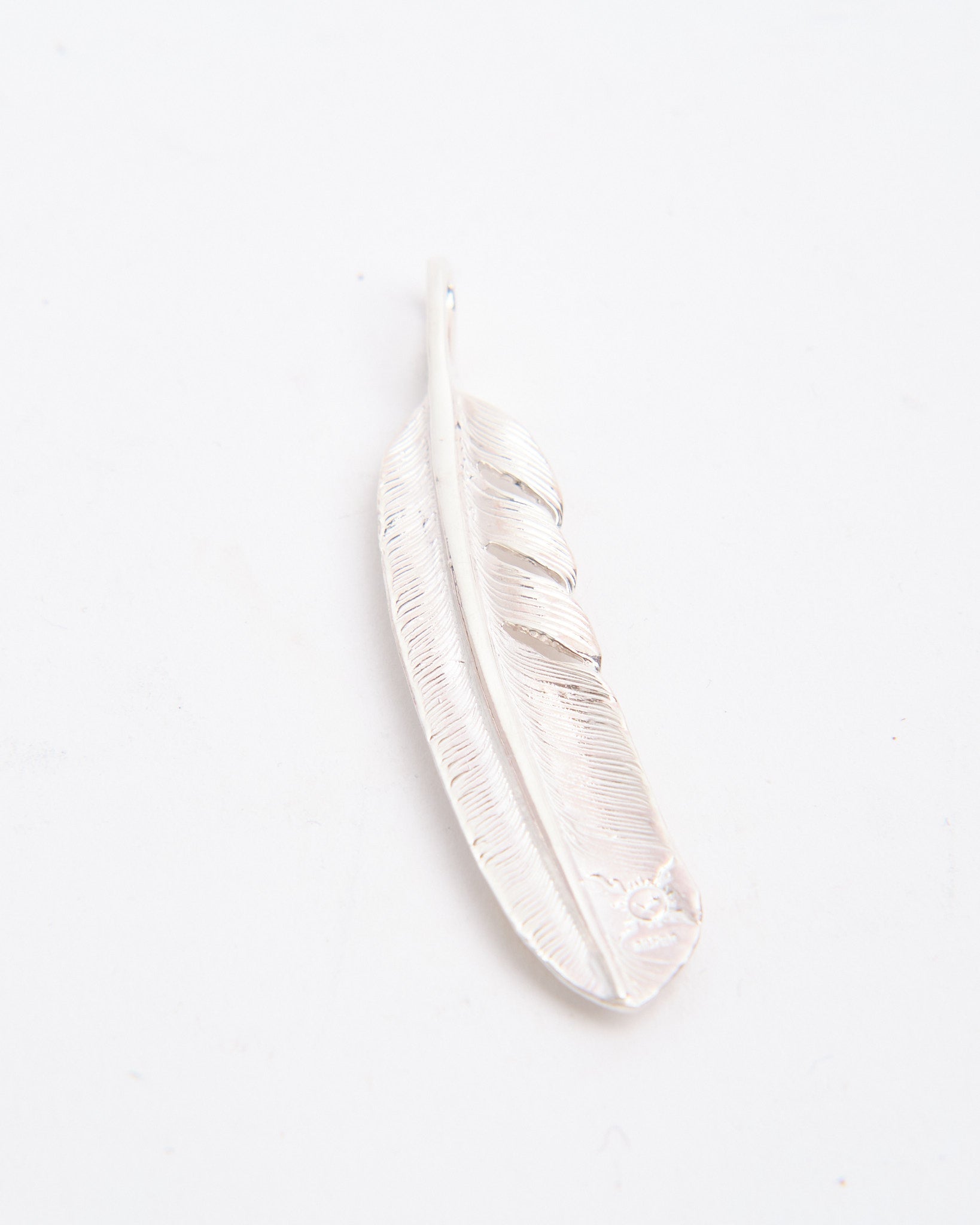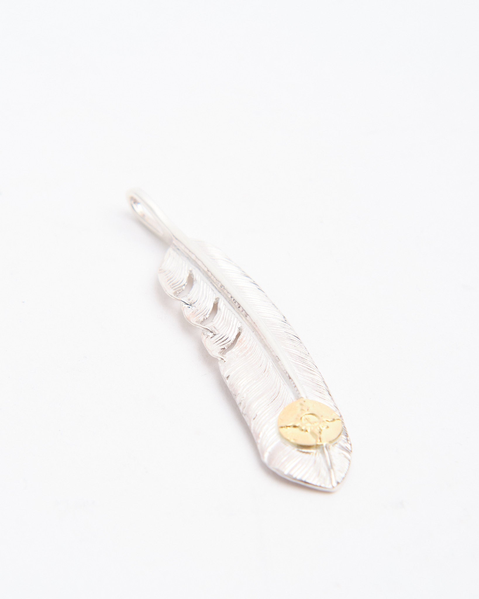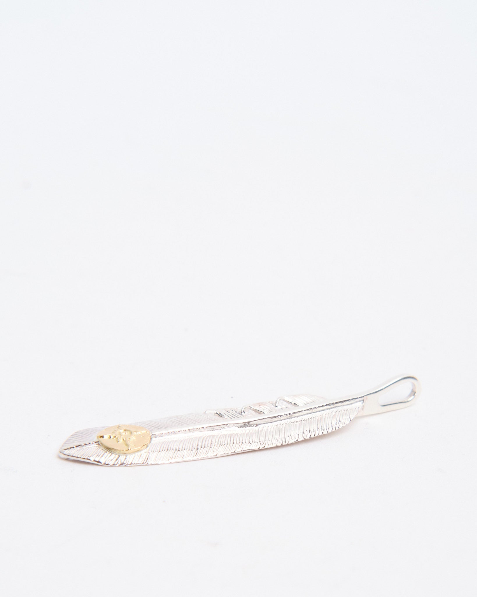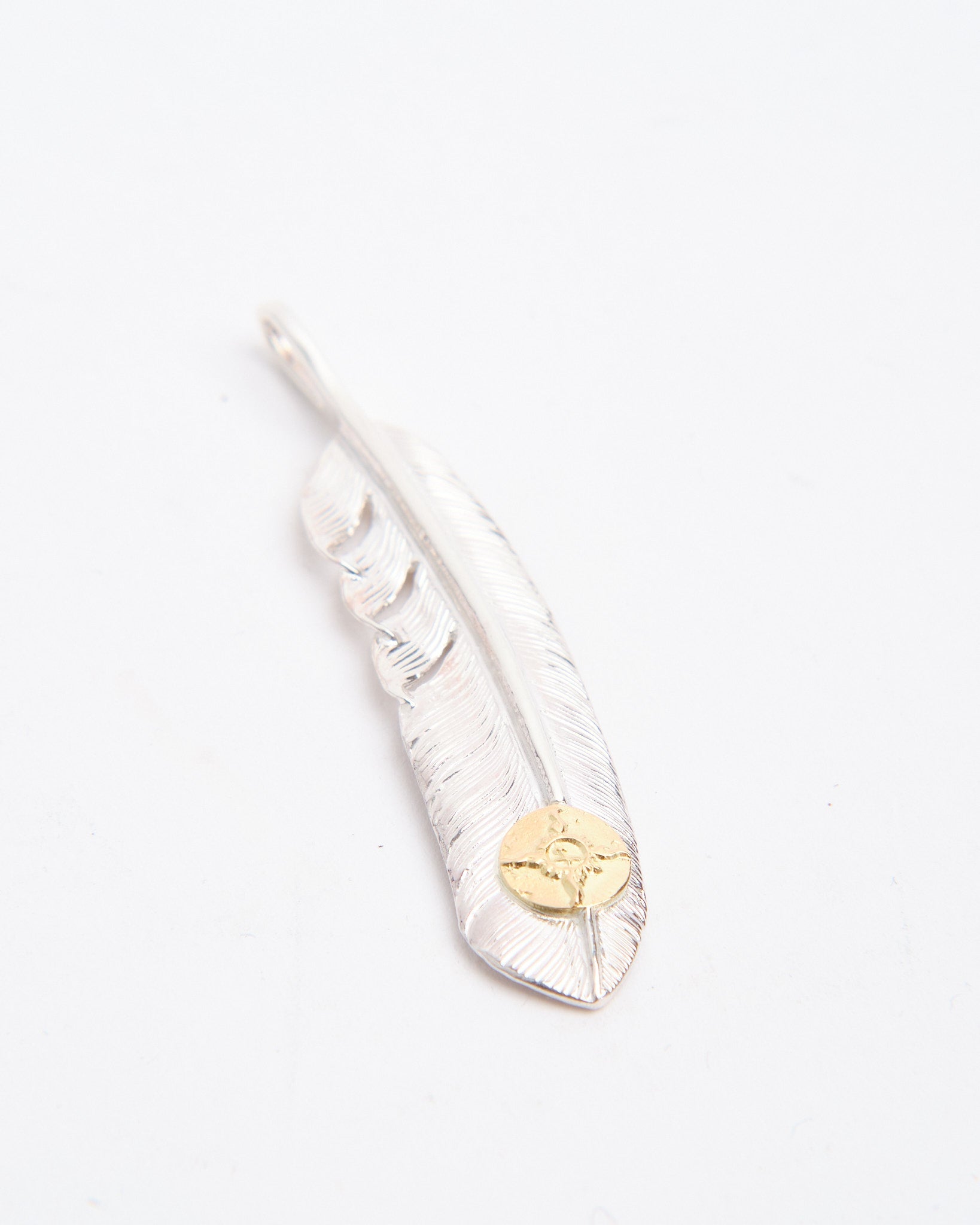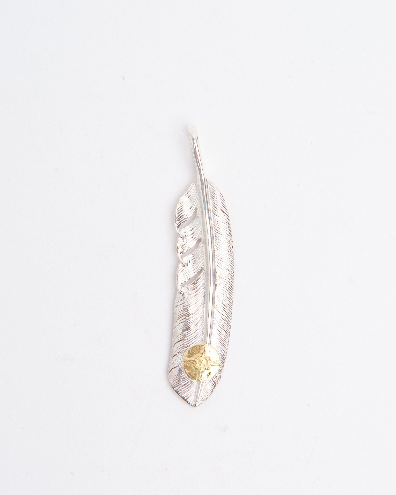 The Feather (L) with K18 is one of First Arrows’ signature pieces, hand-forged in Japan from Britannia Silver 950 and detailed with a touch of 18k gold. The feather motif carries meaning of freedom, hope, and positive energy, rooted in Native American tradition but reimagined with a refined and versatile style. The silver is strengthened through First Arrows’ unique heat treatment process, giving it lasting durability while maintaining its brilliance. The gold detail provides a striking contrast that will only become richer as the silver ages. This pendant is a lifelong companion that develops character over time. Whether layered with other pieces or worn alone, it stands as a statement of craft, culture, and timeless design.