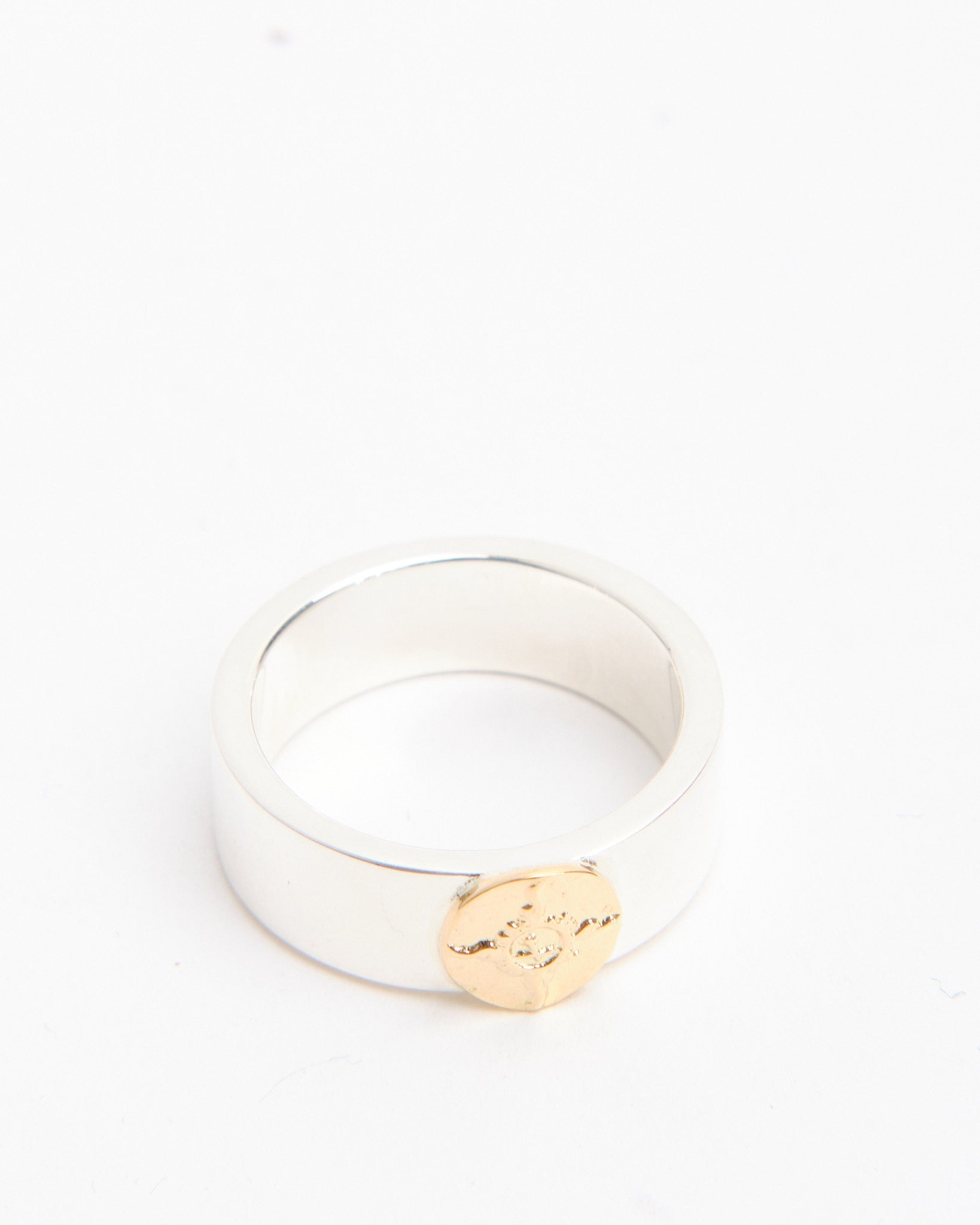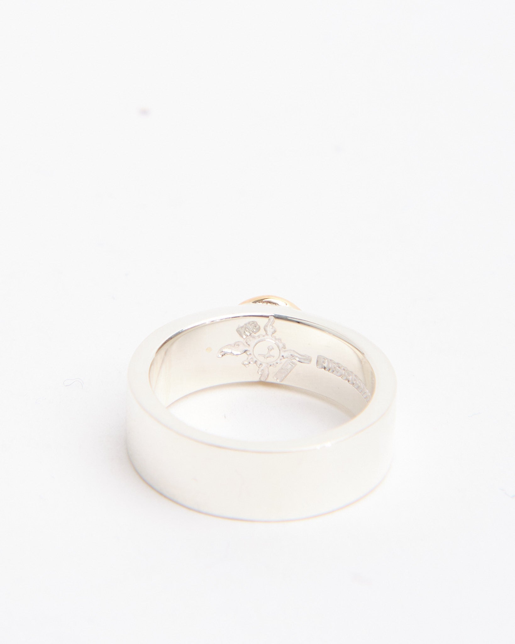 The Flat Hammered 8mm Plane Ring with K18 (#20) is a bold yet refined design from First Arrows, handcrafted in Japan from Britannia Silver 950. The wide 8mm band features a hammered finish, giving the ring a unique texture and natural shine that changes with light and movement. A detail in 18k yellow gold adds warmth and contrast, highlighting the balance between two precious metals. Strengthened through First Arrows’ exclusive heat-treatment process, the silver is durable while maintaining its brilliance. Over time, the silver will darken and the contrast with the gold will deepen, creating a ring that grows more personal with age. Inspired by Native American jewelry but elevated with Japanese refinement, this ring is both a statement of craftsmanship and a lifelong companion.