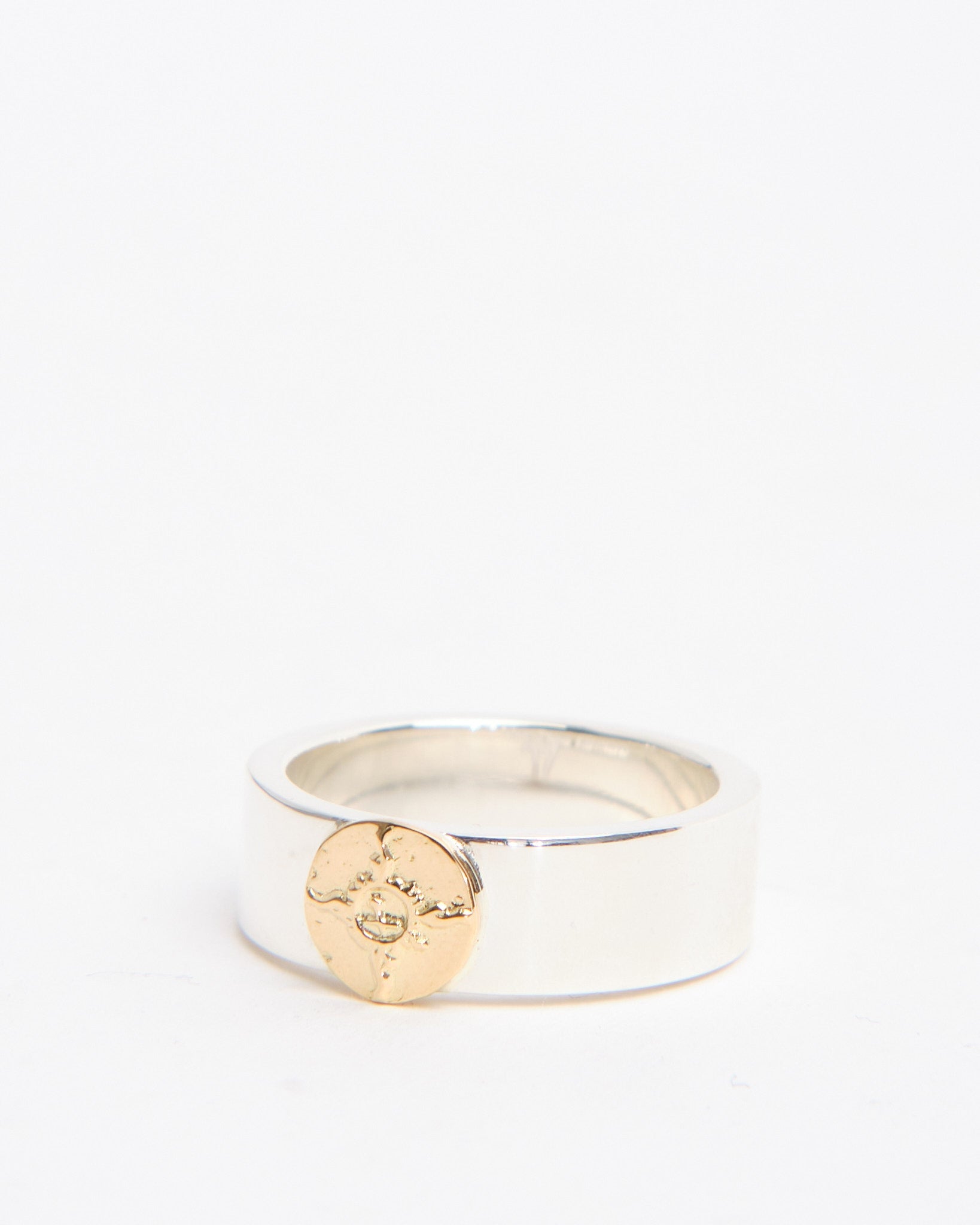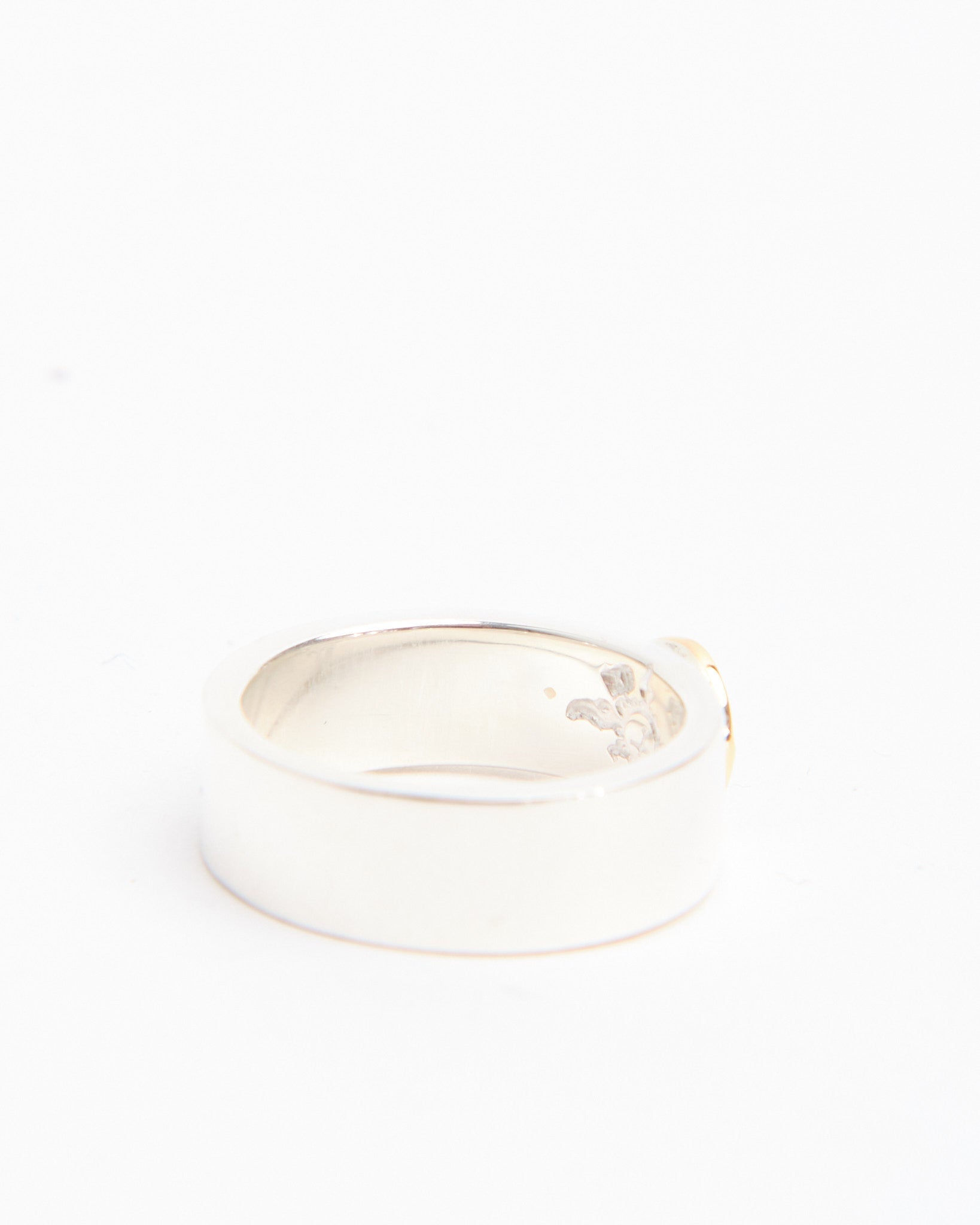 The Flat Hammered 8mm Plane Ring with K18 (#22) is a striking band that showcases First Arrows’ signature blend of craftsmanship and symbolism. Handcrafted in Japan from Britannia Silver 950, the ring features an 8mm wide band with a hammered finish, giving it a textured surface that reflects light in unique ways. A detail in 18k yellow gold provides contrast and warmth, standing out against the brilliance of the silver. Strengthened by First Arrows’ exclusive heat-treatment process, the silver is both durable and radiant, aging beautifully as it develops a patina that enhances the gold detail. Inspired by Native American motifs and elevated with Japanese refinement, this ring is a bold statement piece designed to grow more personal over time.