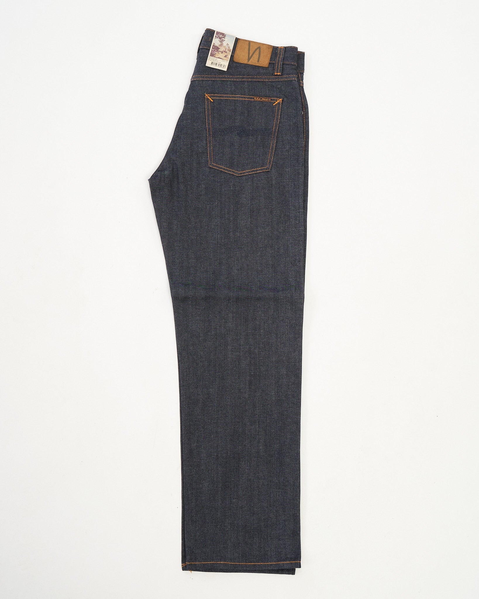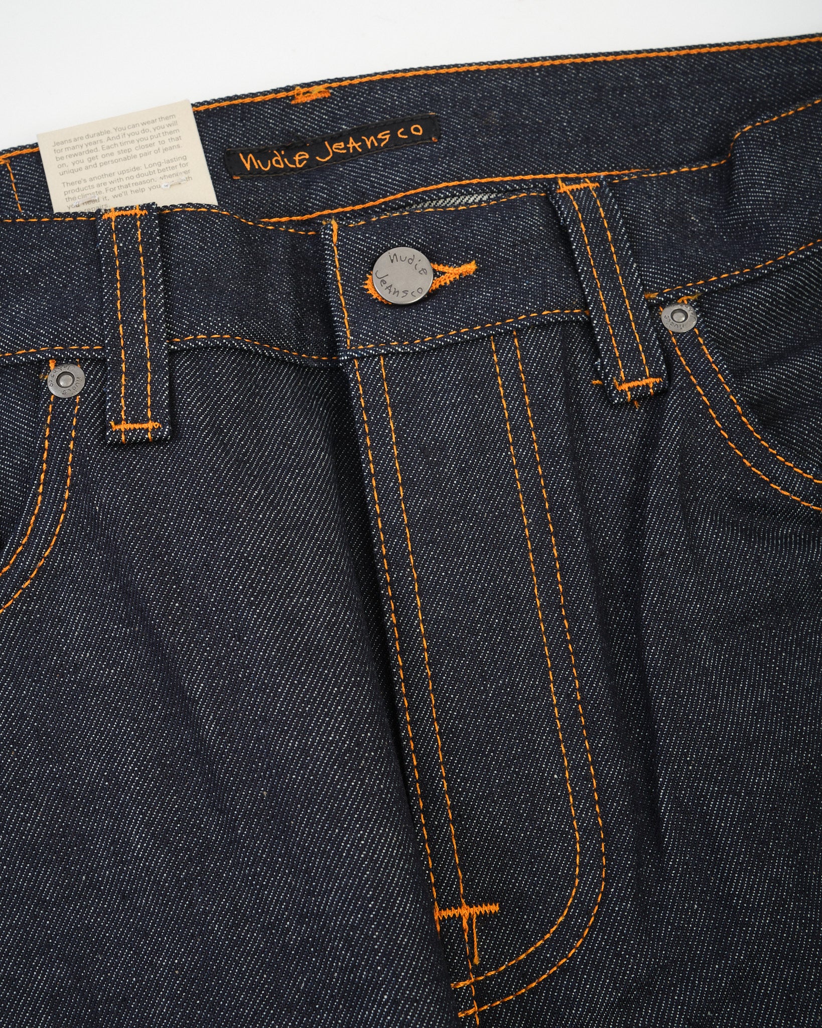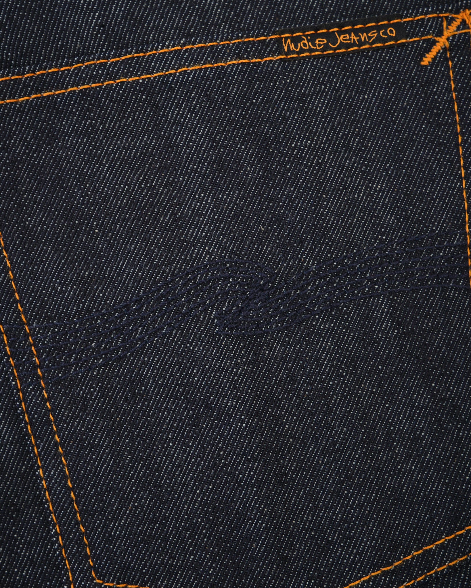 Suunniteltu pitkäaikaiseen käyttöön, kankaan selkeät pystysuorat twill-viivat parantavat sen ikääntymisprosessia, varmistaen uniikin haalistumismatkan ajan myötä. Allekirjoitus oranssi kontrastitikkaus erottuu denimistä, kun taas laivastonsininen takataskun kirjonta tulee näkyvämmäksi käytön myötä.